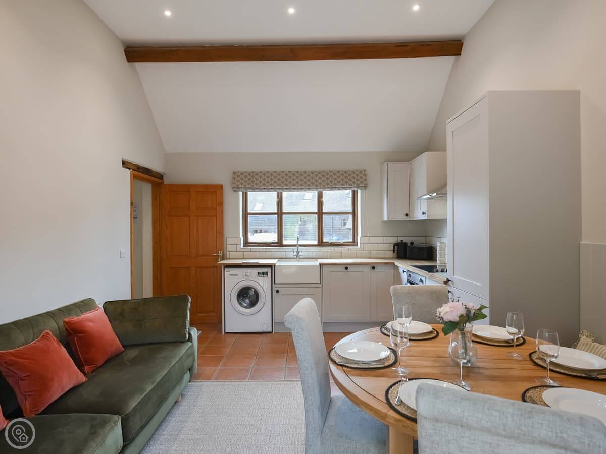 The main room is open plan, kitchen, dining and living area together. It's got stone floors and wooden beams. It's a proper farmhouse kitchen style. There's a wood burner, which is nice in the colder months. You've got your own enclosed garden patio area outside.