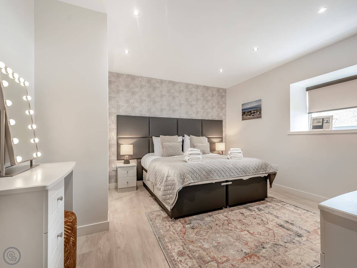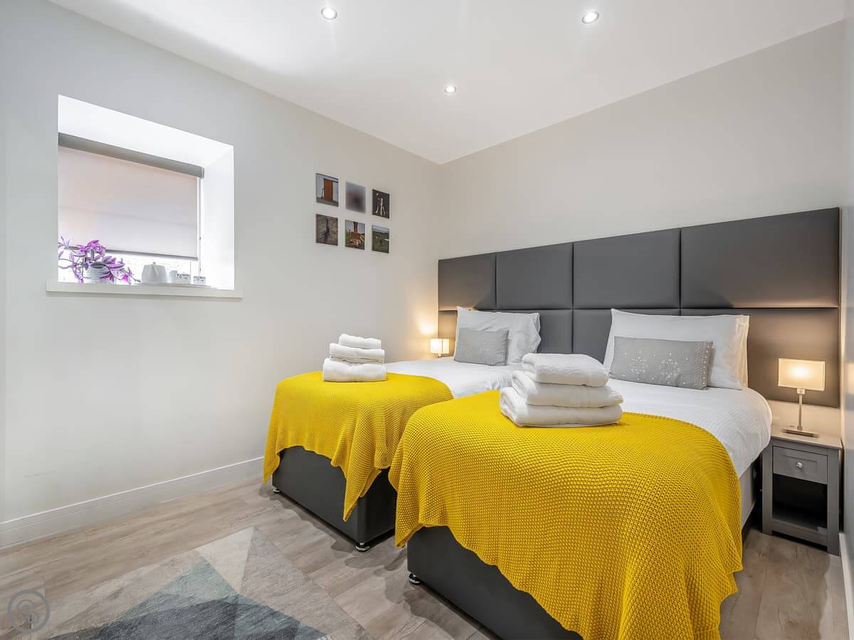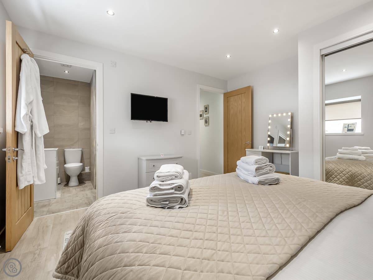 It sleeps four. Two bedrooms. One is a super king with its own shower room. The other has two singles that can zip together to make another super king. There's a second bathroom, so no queueing. It's got a 5 Star rating, which means everything's new and it's well equipped.