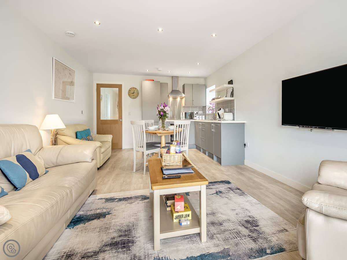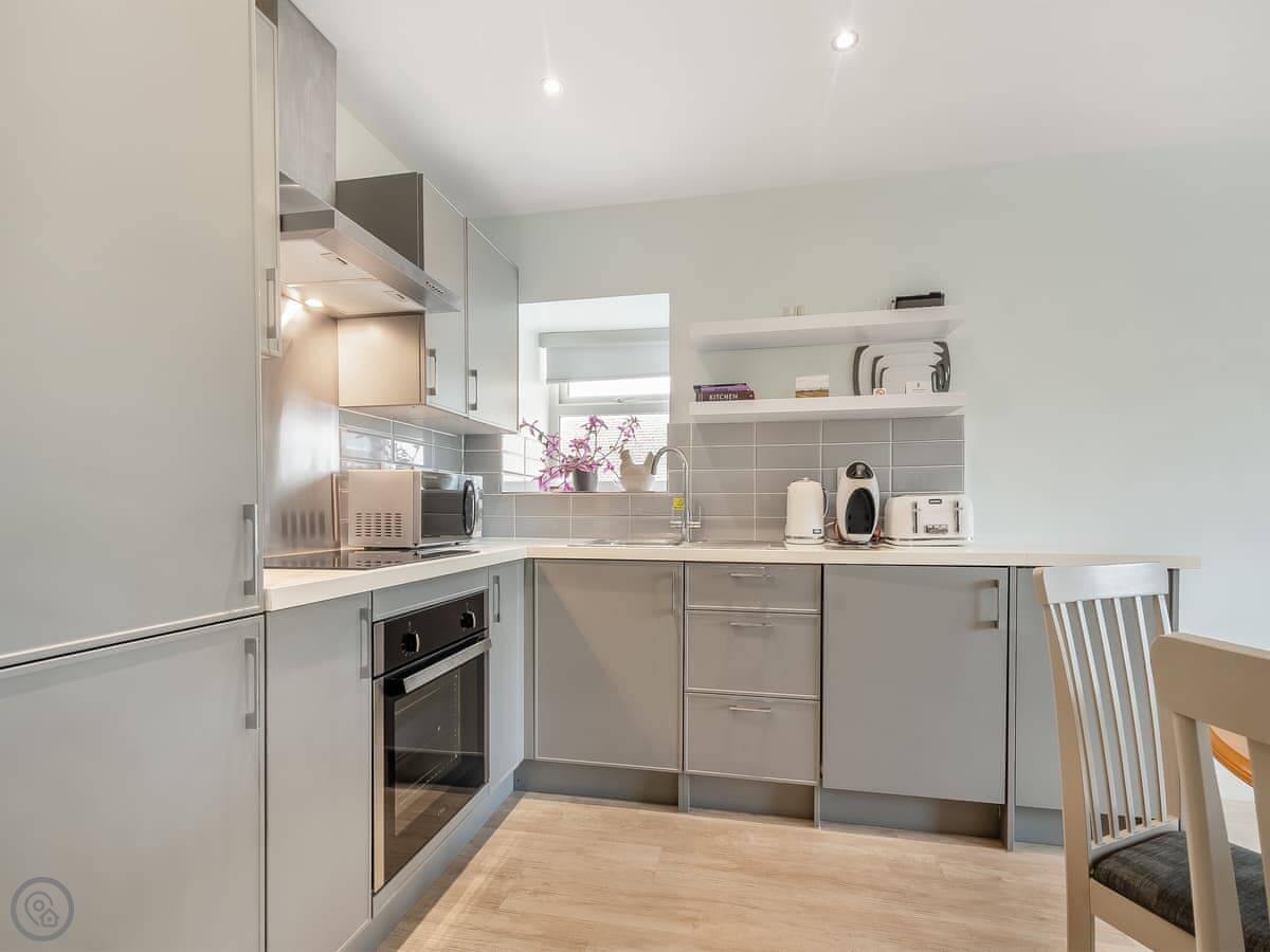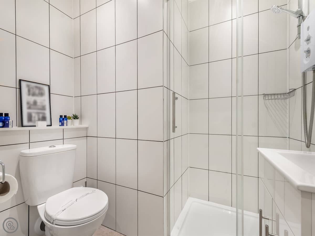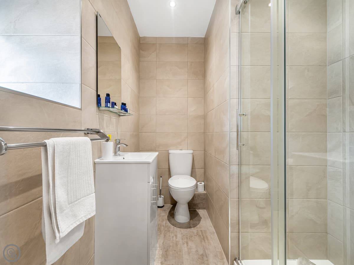 It sleeps four. Two bedrooms. One is a super king with its own shower room. The other has two singles that can zip together to make another super king. There's a second bathroom, so no queueing. It's got a 5 Star rating, which means everything's new and it's well equipped.