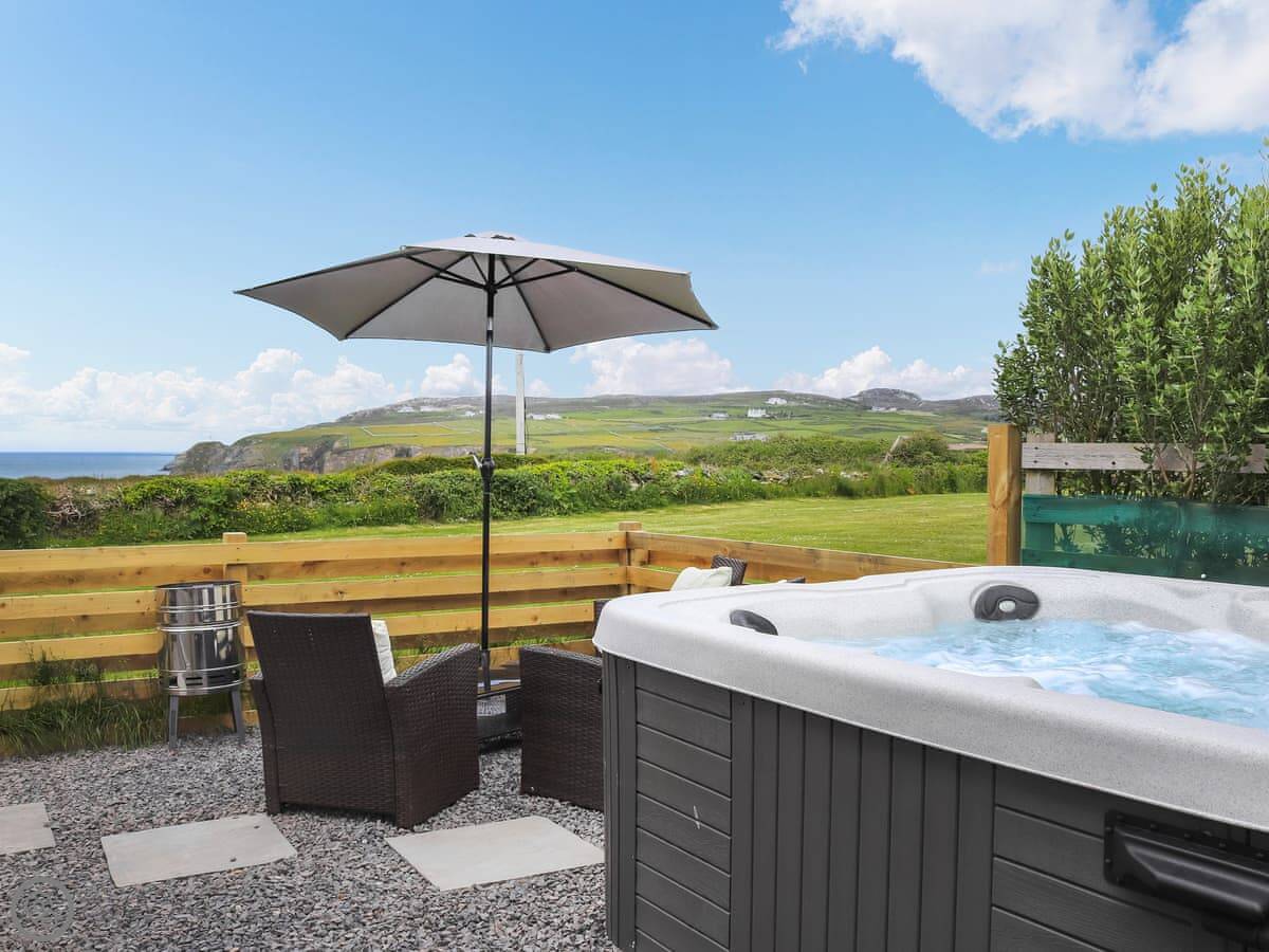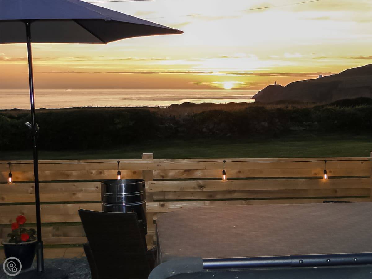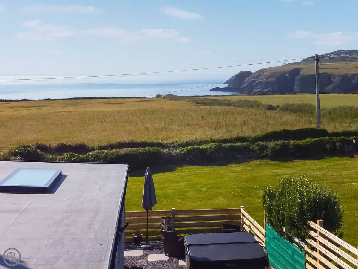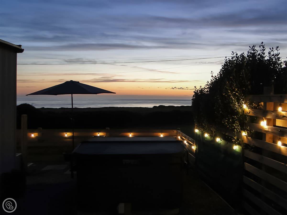 The hot tub is on the patio, facing the sea. The garden is enclosed. There's an electric vehicle charger and on site parking.