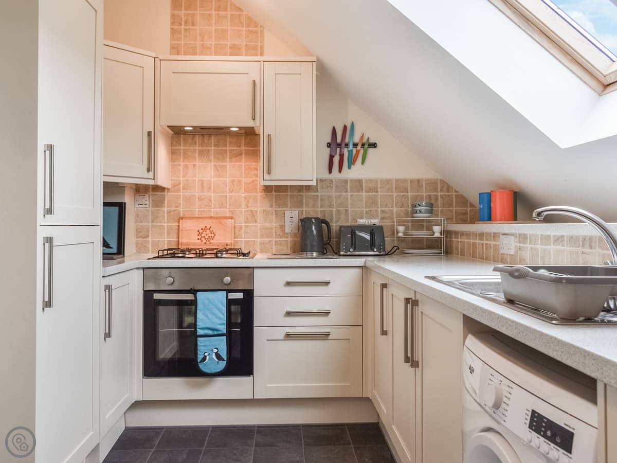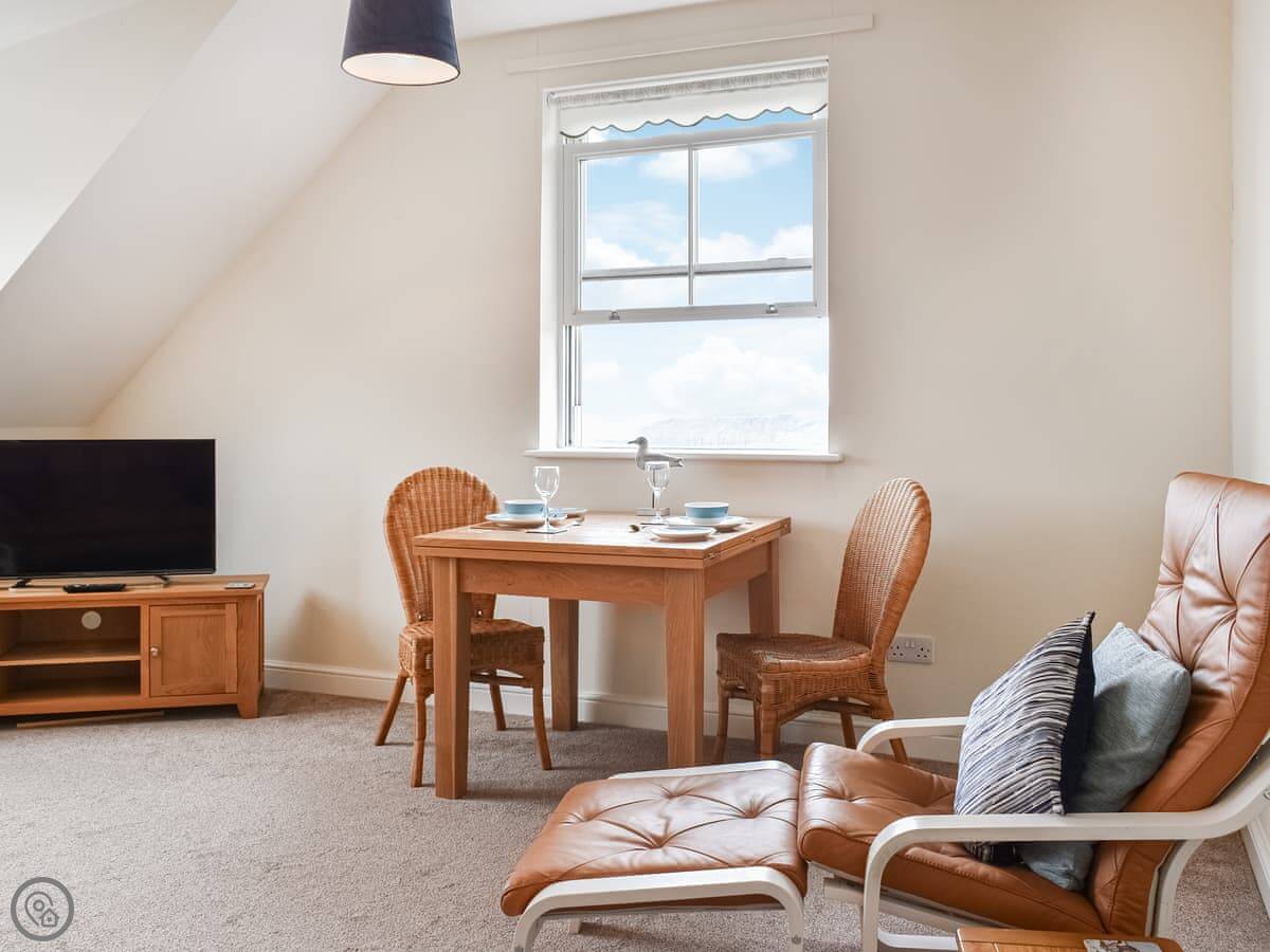 It's an apartment so there's no garden, but you've got the whole top floor. The living area is open plan. The dining table is by the window so you can look out while you eat. The kitchen is fine for what you need.