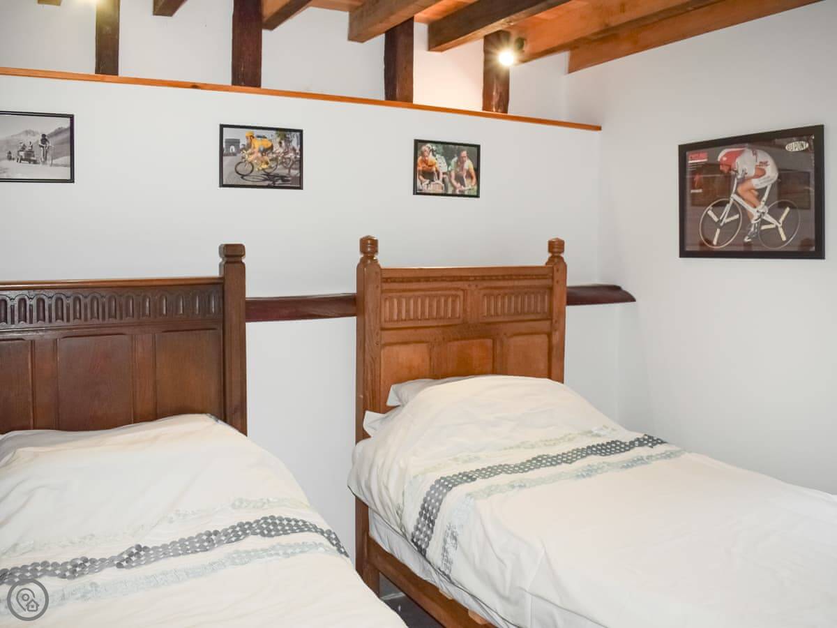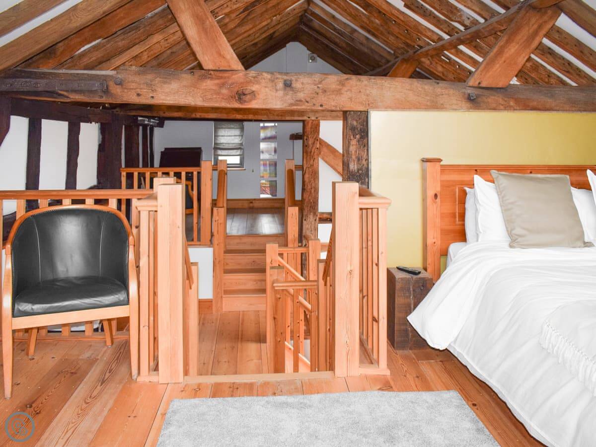 There's a wood burner for cooler evenings. The stairs to the master bedroom are steep. That bedroom is on the first floor. The bathroom is next to it, but it doesn't have a proper door, just a partition wall. Something to know if you're travelling with friends. The second bedroom with twin beds is on the ground floor.