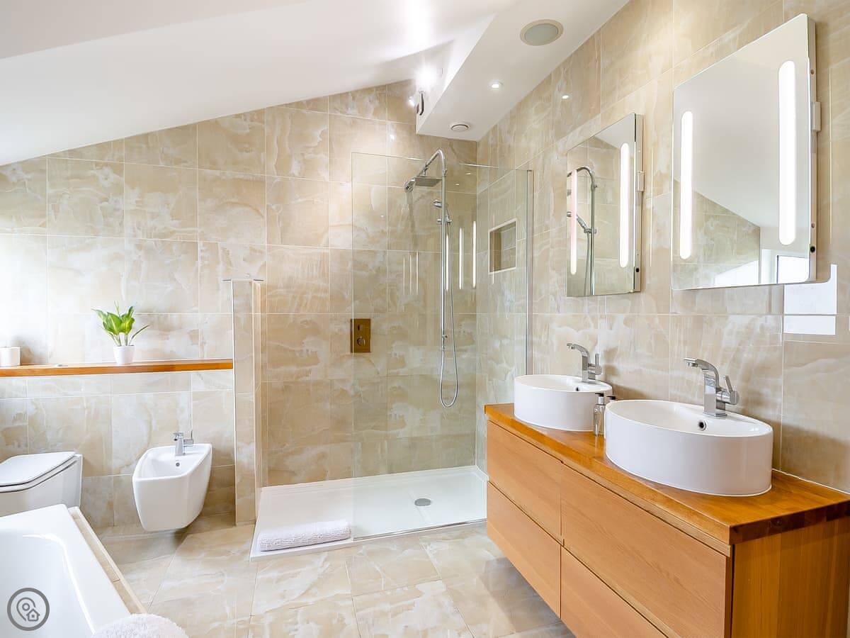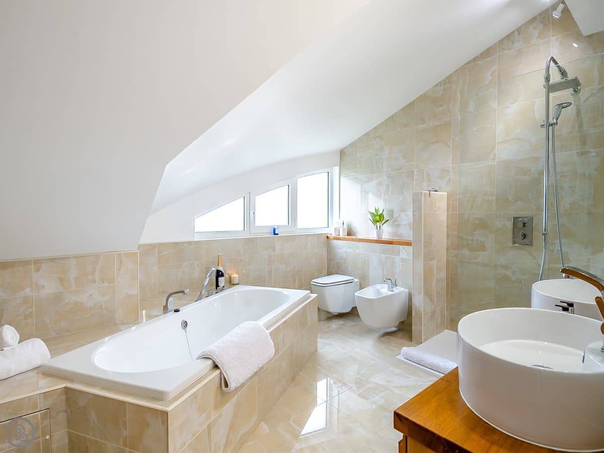 It sleeps six in three bedrooms, and each bedroom has its own bathroom, which is handy. It has a 5 Star rating, so it's well-equipped and comfortable. The living space is open plan.