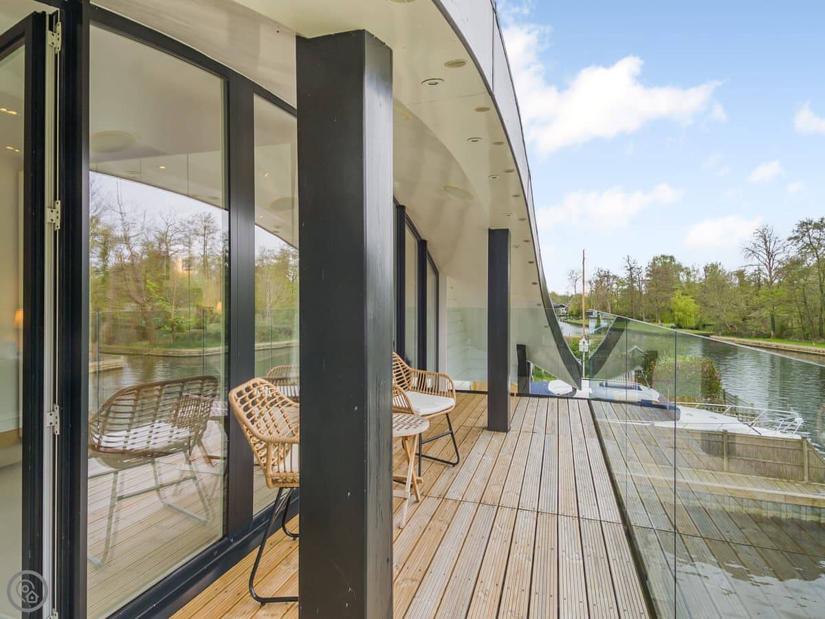 There's a nice garden that goes down to the river. You can fish from there if you have a licence. There are two verandas, one upstairs and one downstairs, with chairs and a table. Good for sitting out.