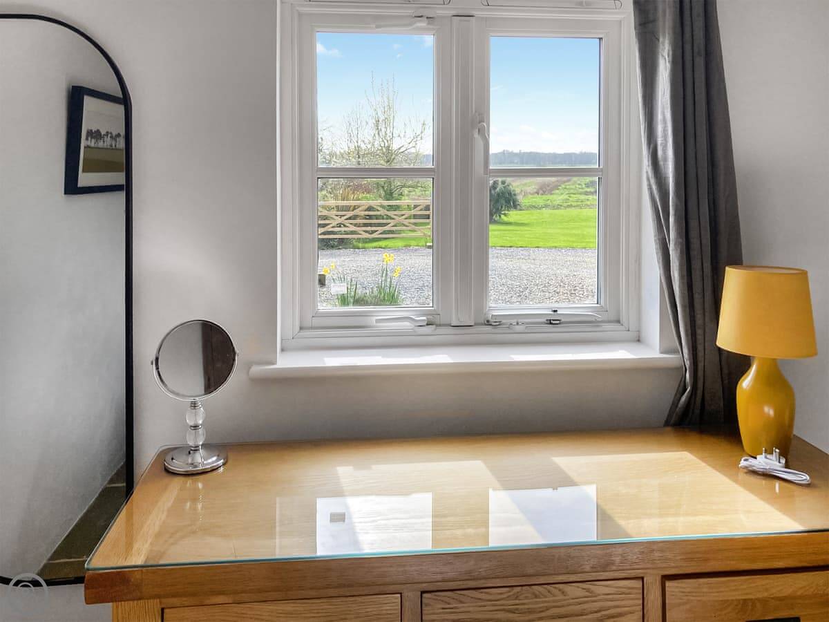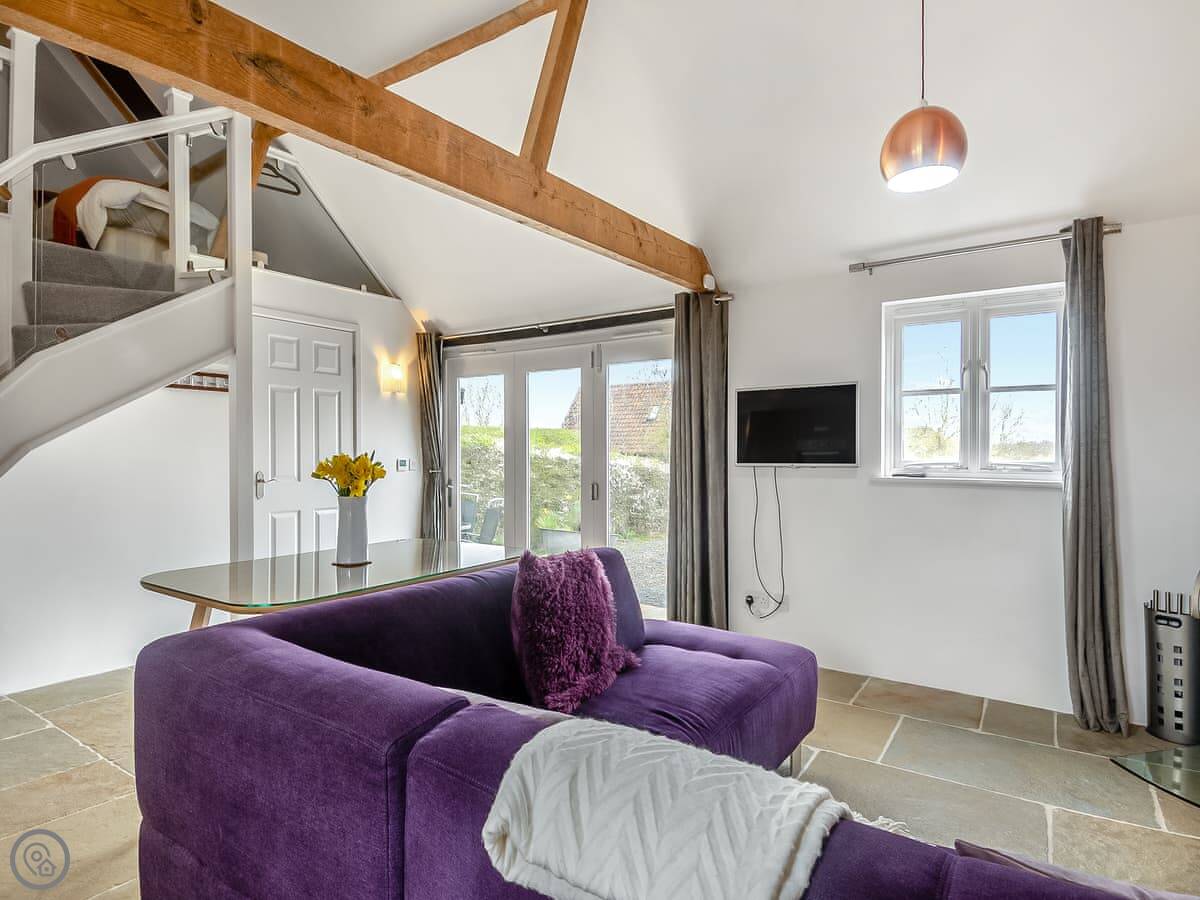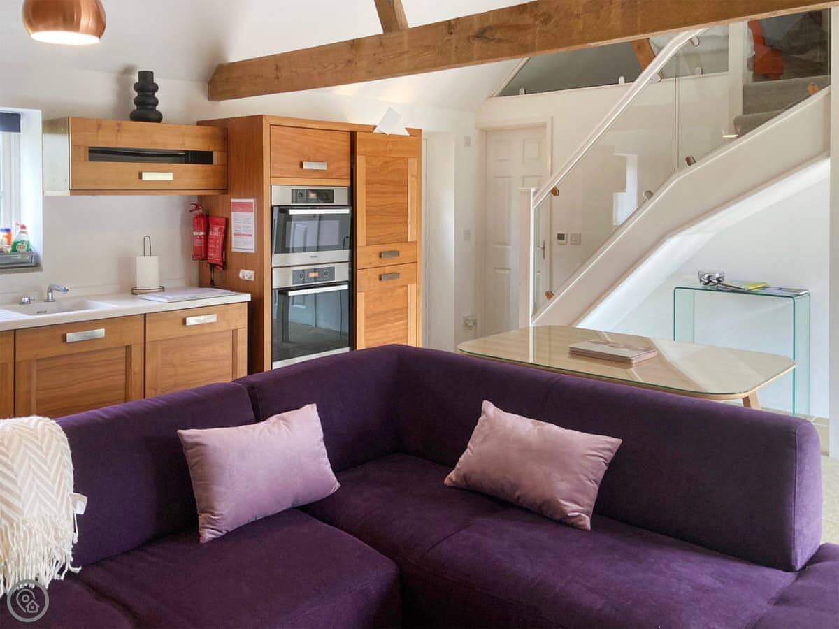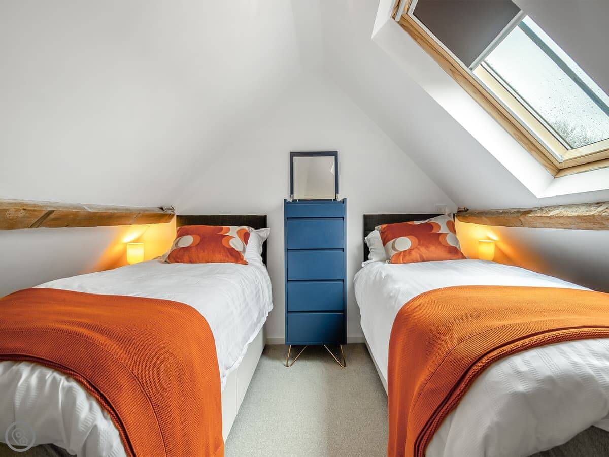 It sleeps four. Two bedrooms, one bathroom. It's got a 5 Star rating, which means it's well-finished and comfortable. One double bedroom is on the ground floor. The twin beds are up a set of stairs to a galleried area with a vaulted ceiling. The stairs are fine, but mind your head up there, the ceiling slopes at the sides.