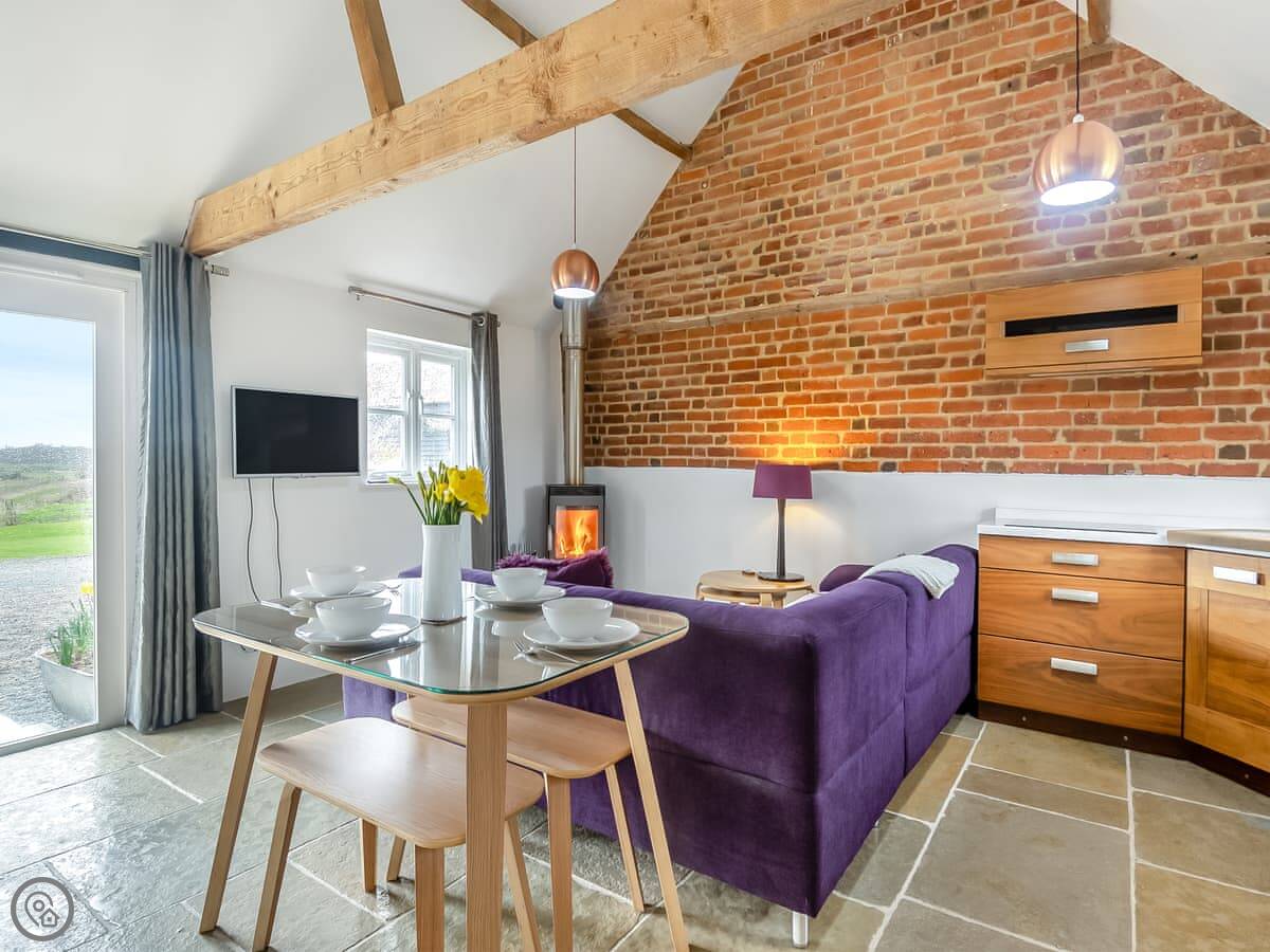 There's an open plan living area with large doors that open up. It has a woodburning stove for cooler nights. The kitchen has a dishwasher. The garden is enclosed at the back, with a lawn. There's a seating area at the front to sit and look at the view.