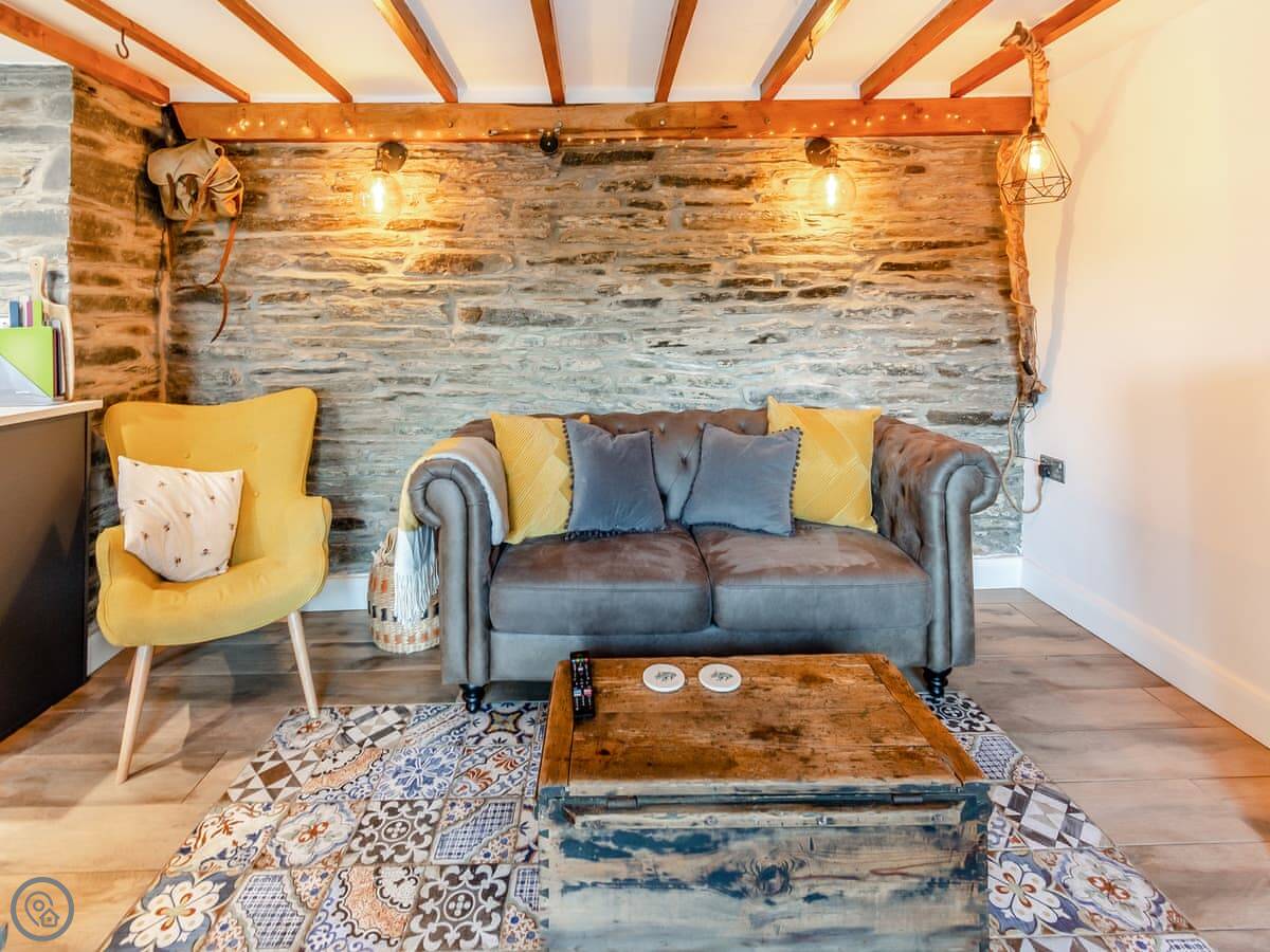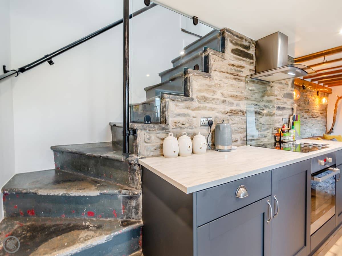There's an open plan living room, dining area and kitchen downstairs. The ceiling has exposed beams and the walls are stone. There's a woodburning stove. The kitchen has a dishwasher. We include the bedding and towels.