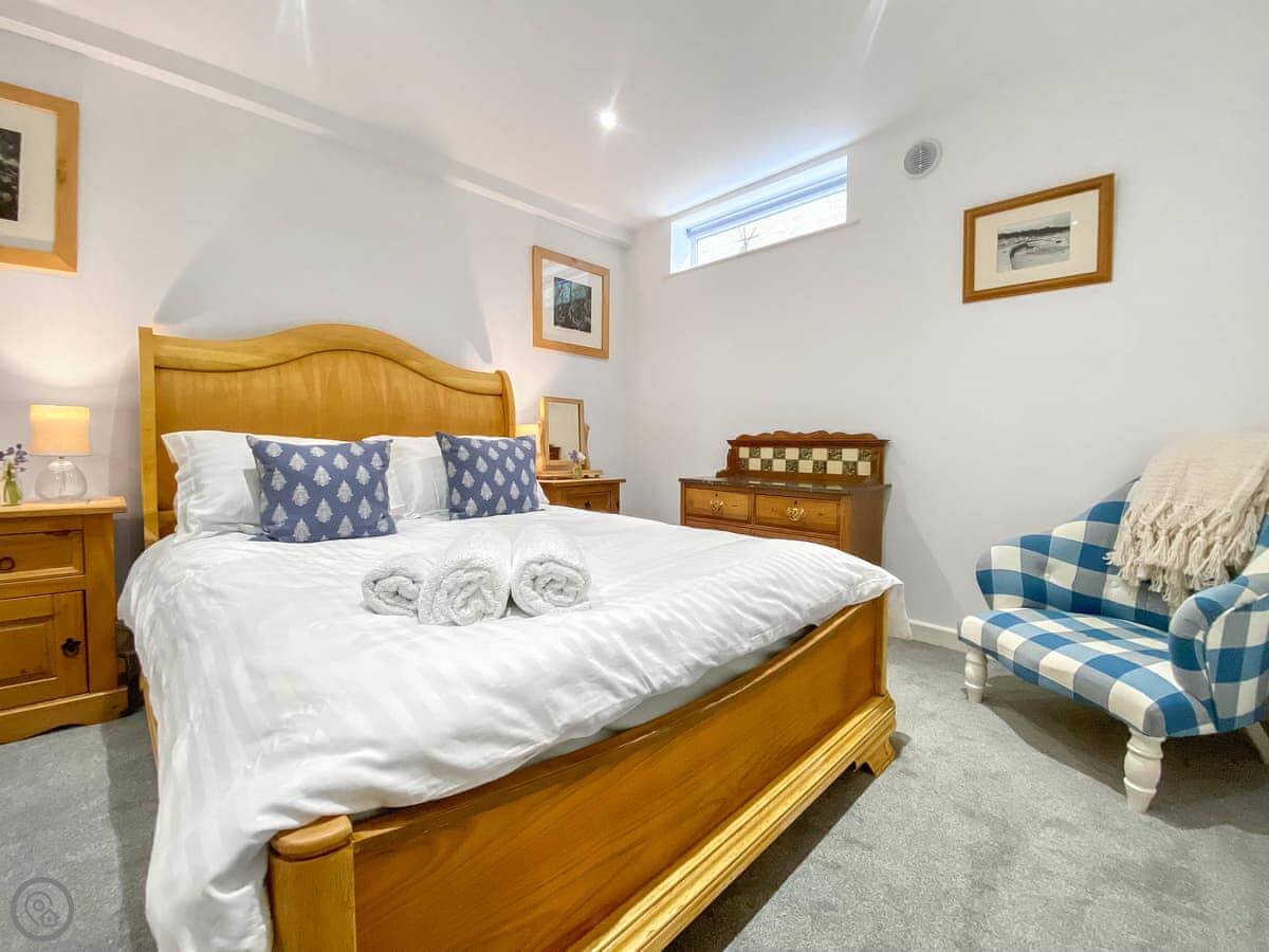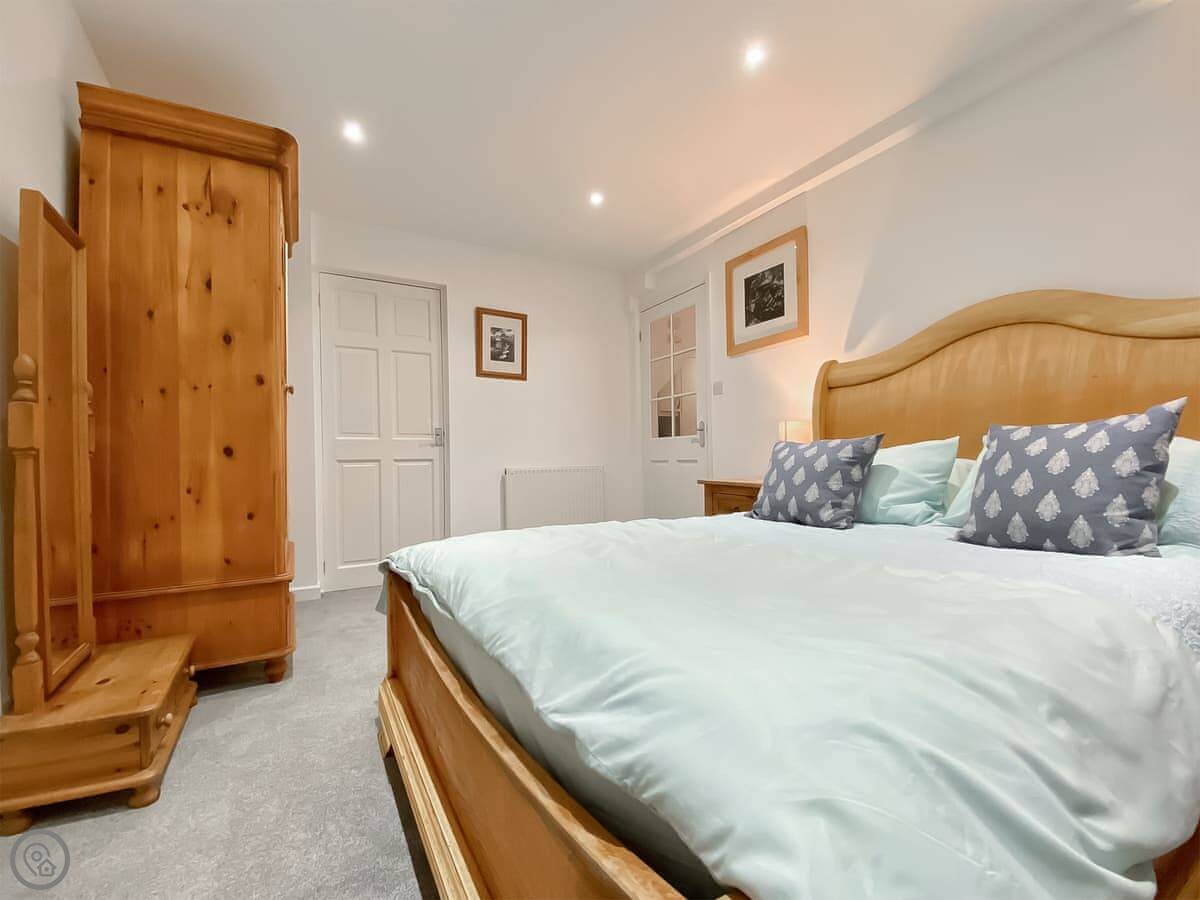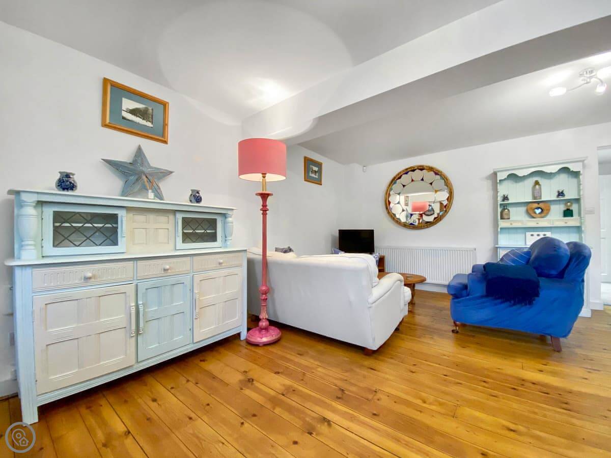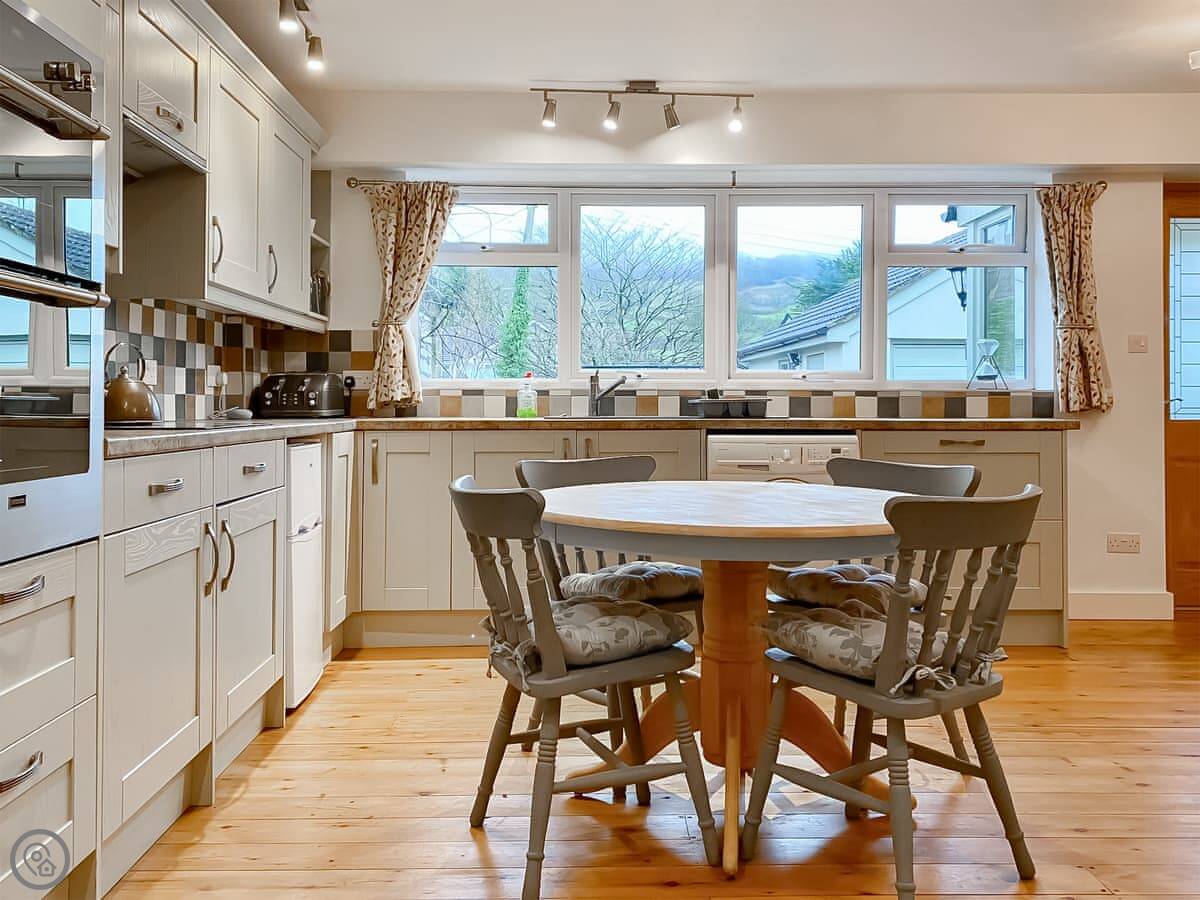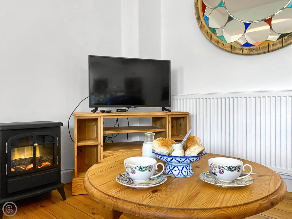 It's got a 4 Star rating. It's clean and modern inside. The main room is open-plan with a kitchen, dining table, and sitting area. There's an electric fire for background heat. The bed is a standard double. You park right outside your own front door.