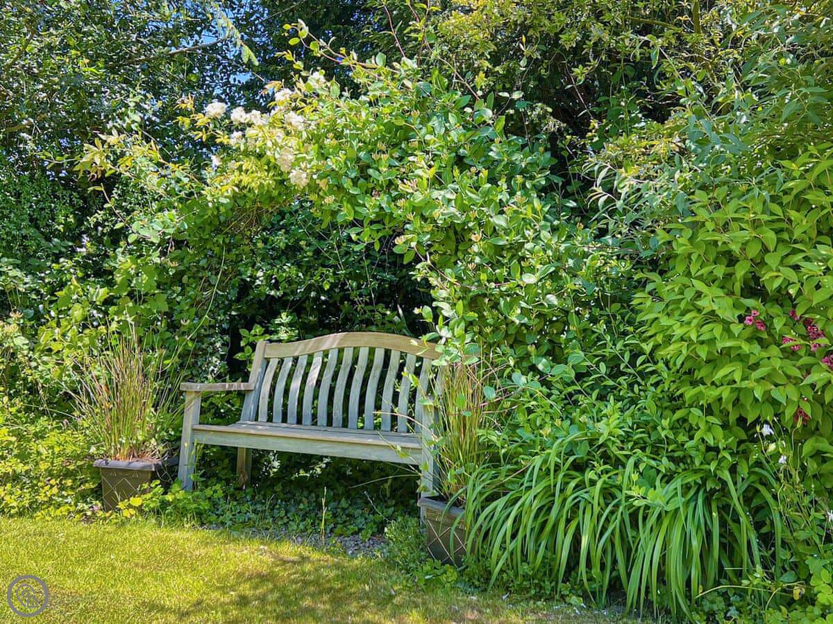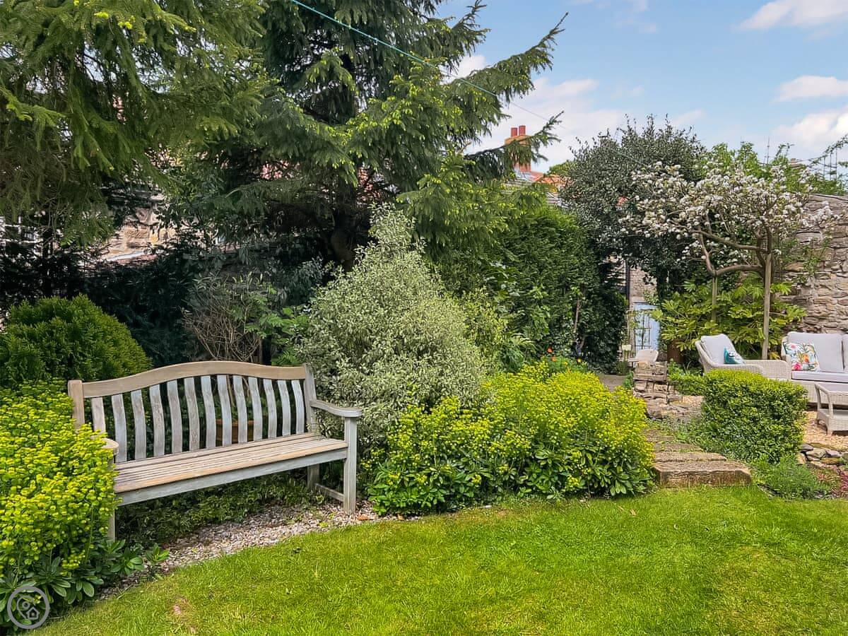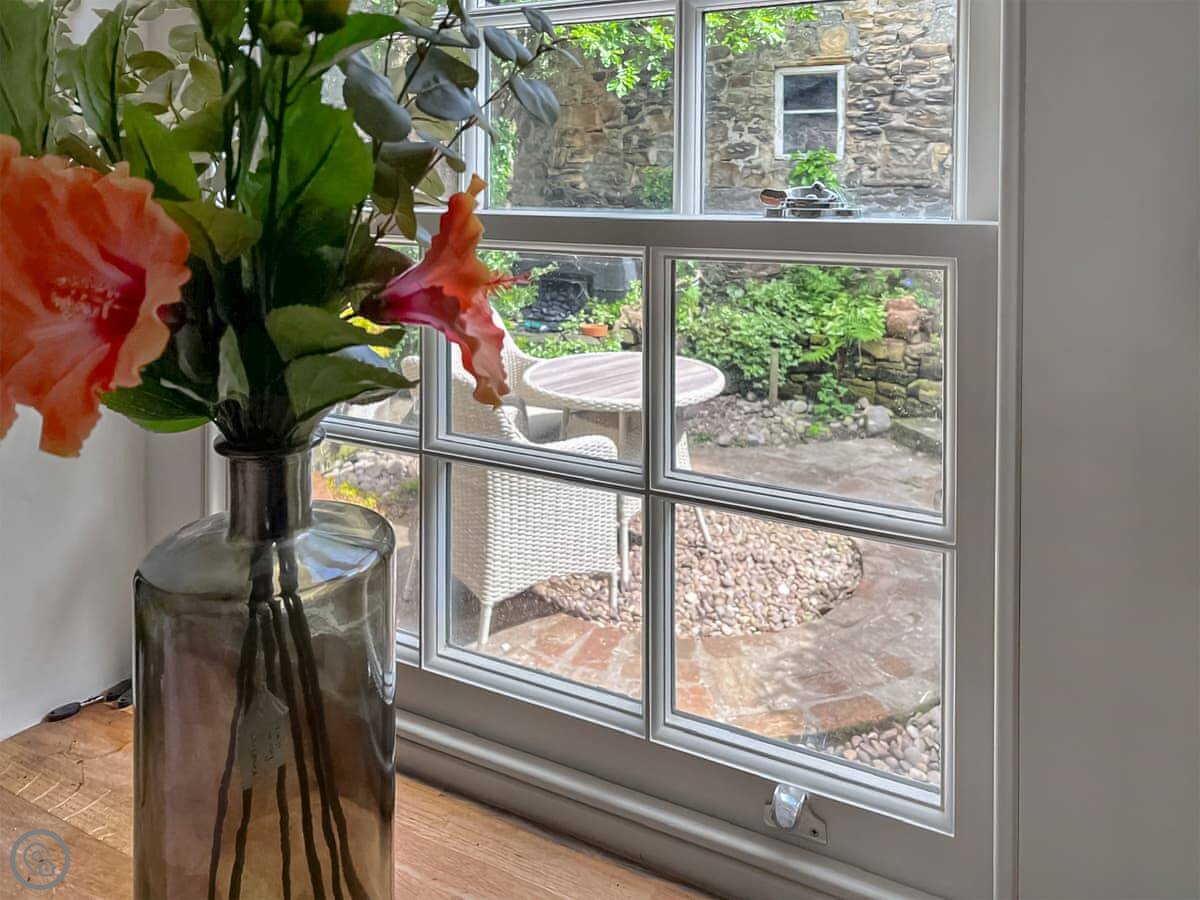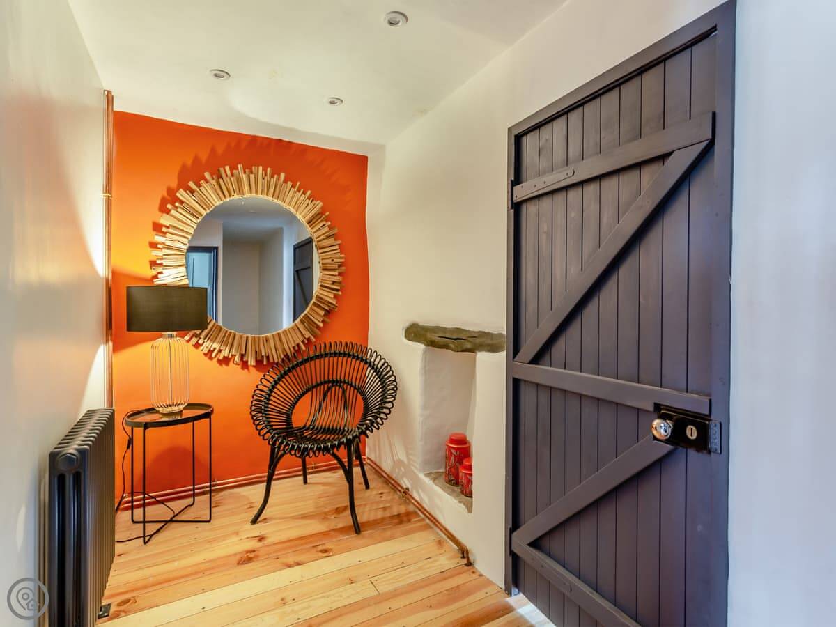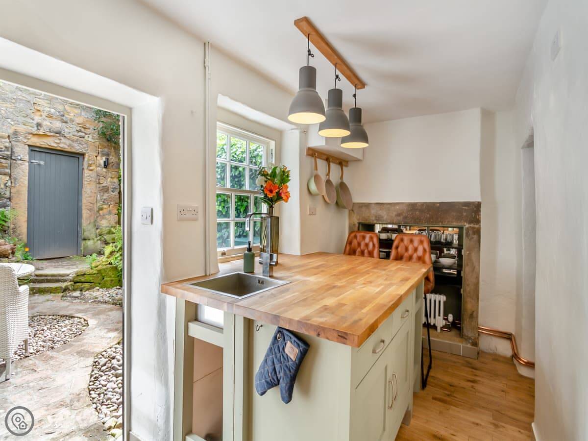 Downstairs, there's a living room with an open fire. The stairs go up from there. They're normal cottage stairs, so a bit steeper than modern ones. The kitchen is off the living room and has a door out to the patio. There's a private garden with a lawn as well.