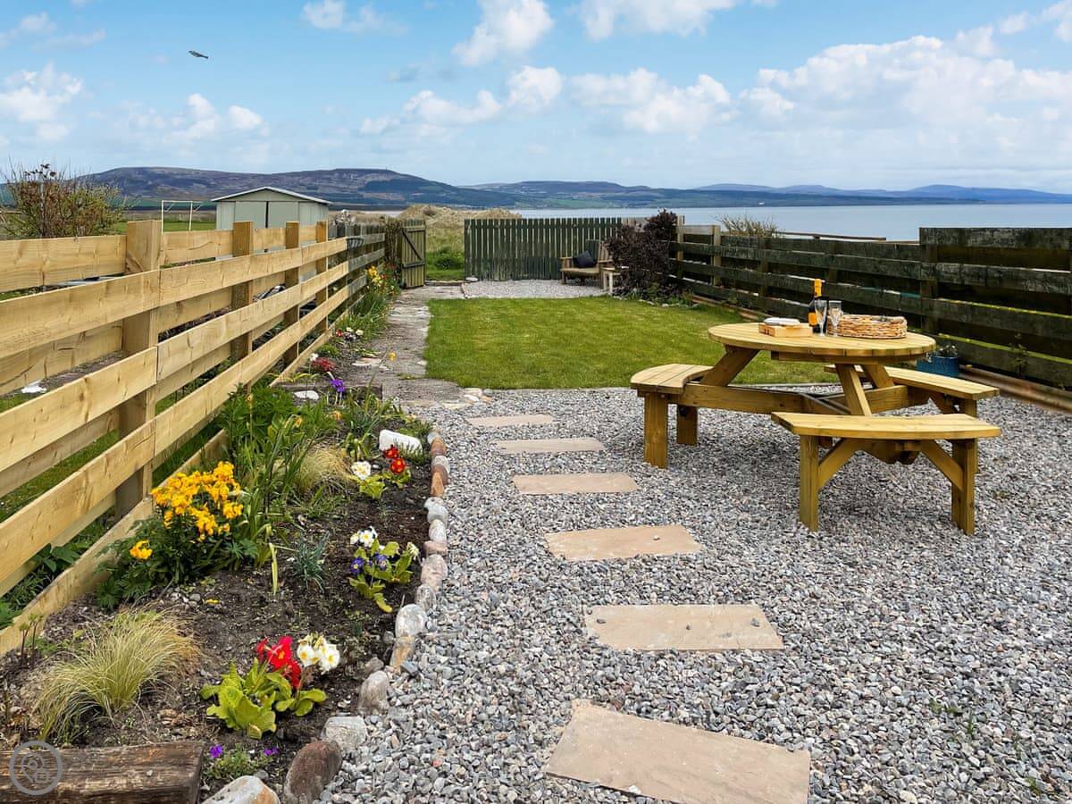 The beach is across the road and down the path. It's sandy and it goes on for miles. You can see dolphins sometimes. The village itself is quiet, just houses and a caravan park. Dornoch is about two miles away for shops, cafes, and a couple of restaurants. The cathedral is nice for a wander.
