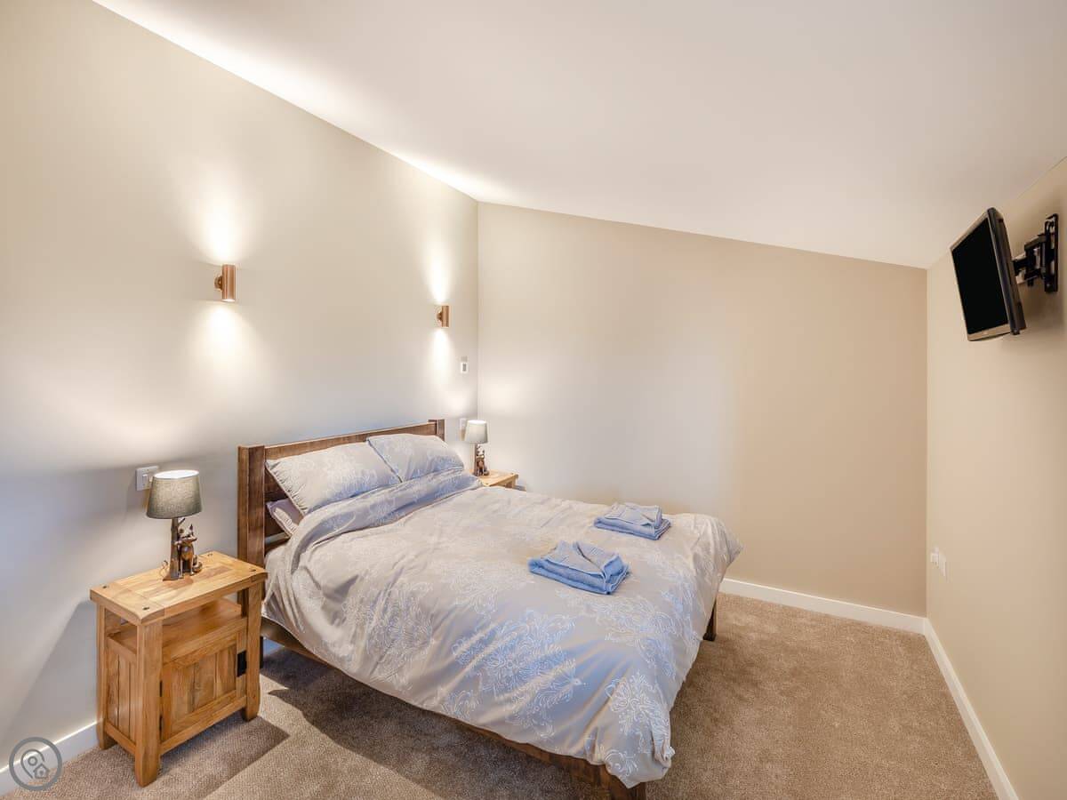 You come into the living room with the kitchen off it. The bedroom is down a few steps from there. It's a kingsize bed. The bathroom is on that lower level too.