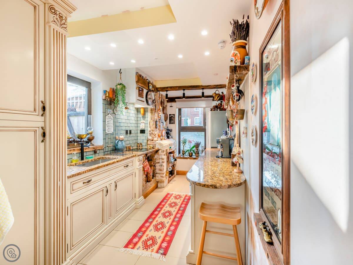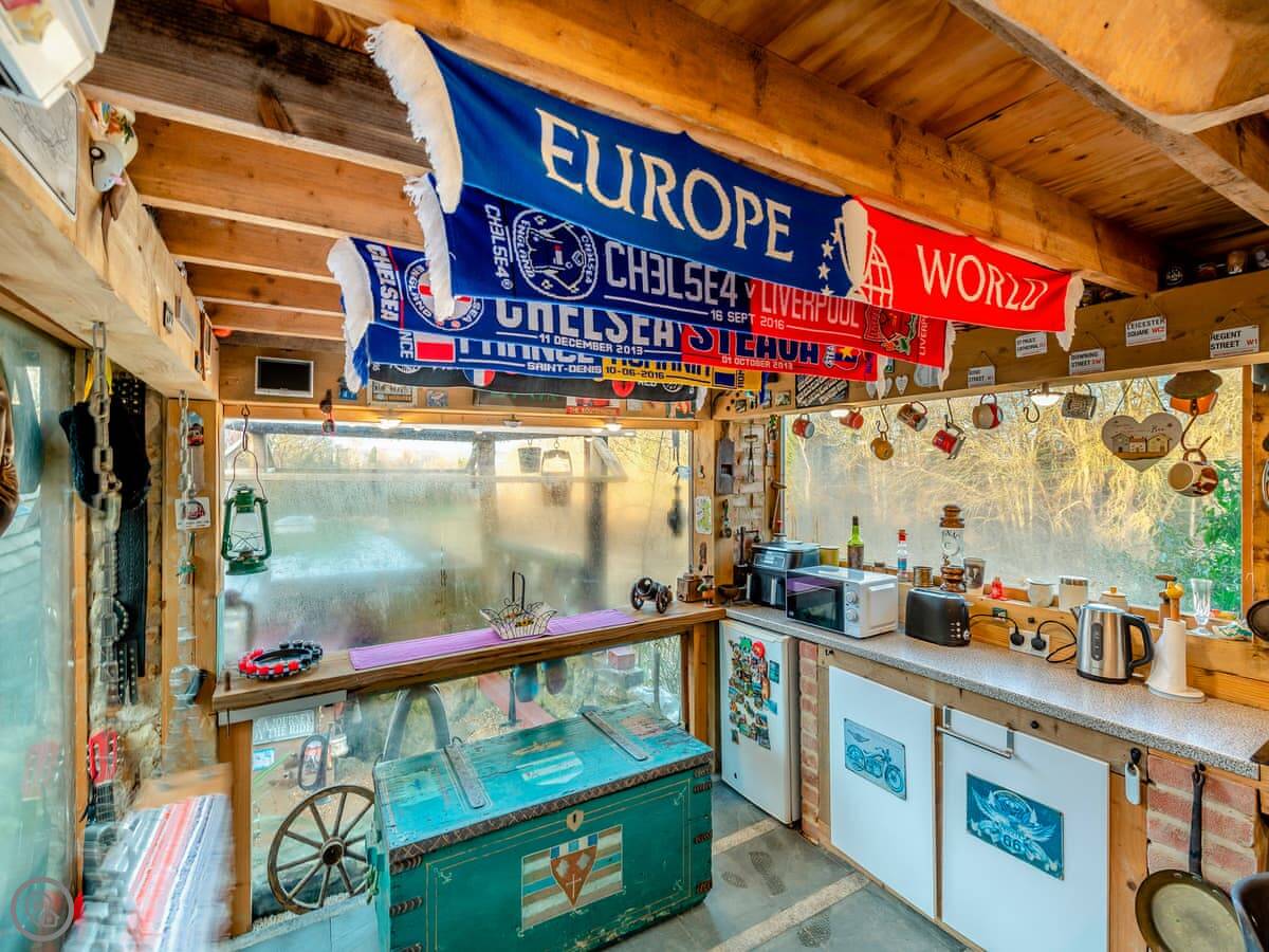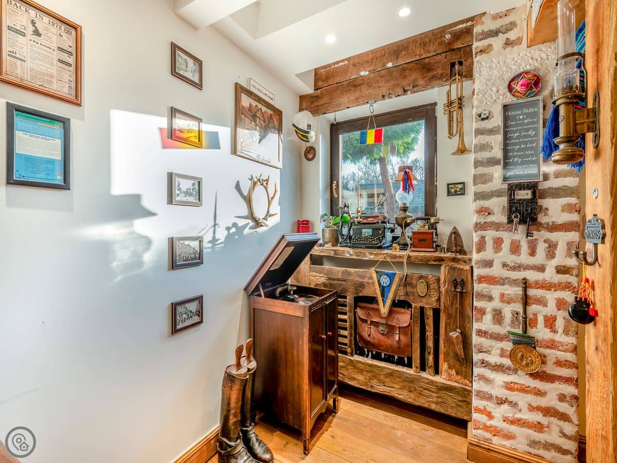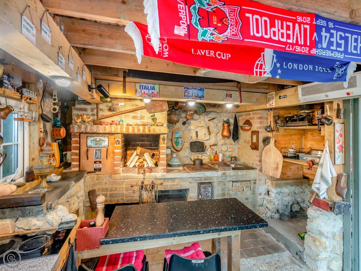 Inside, the decor is quite colourful and full of things. It's not a minimal place. It's open plan at the back with the kitchen and living area. There's a wood burning stove. One bathroom with a shower.