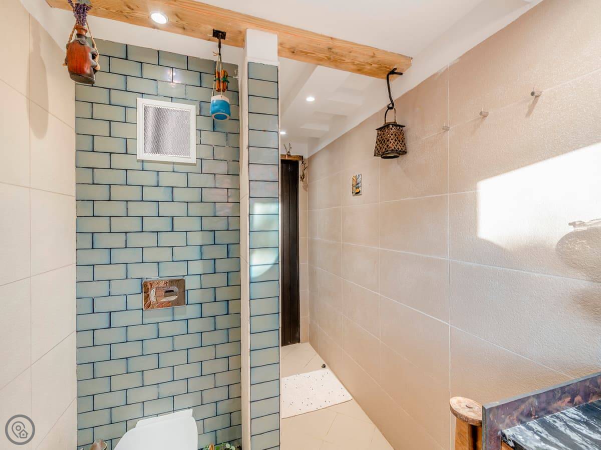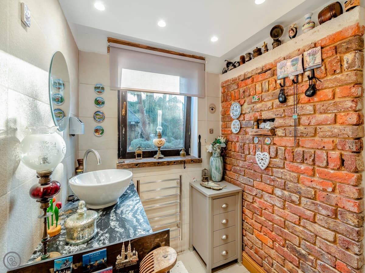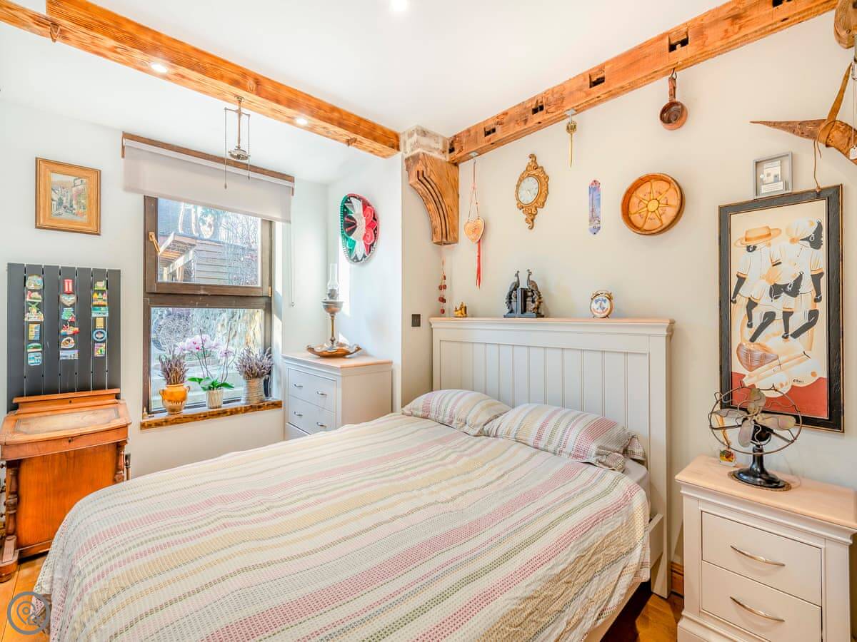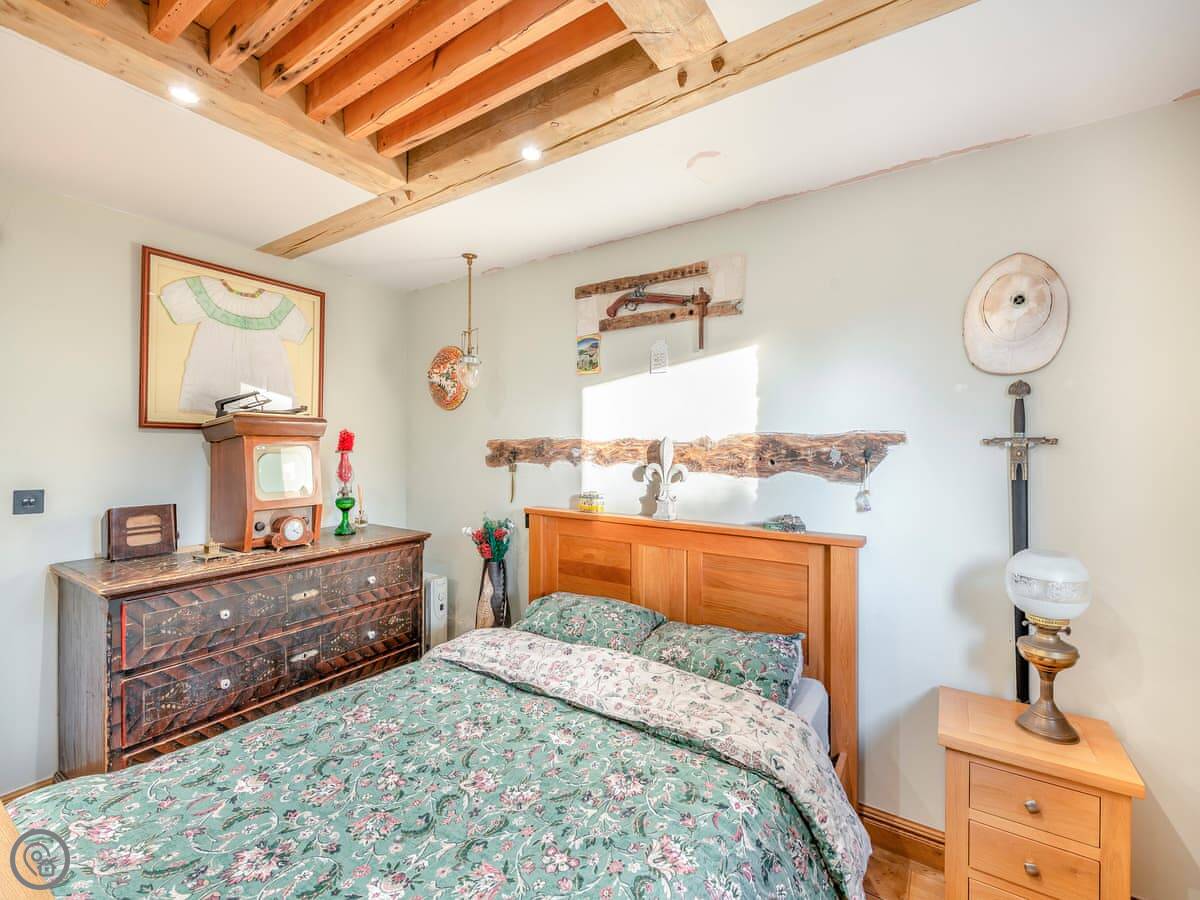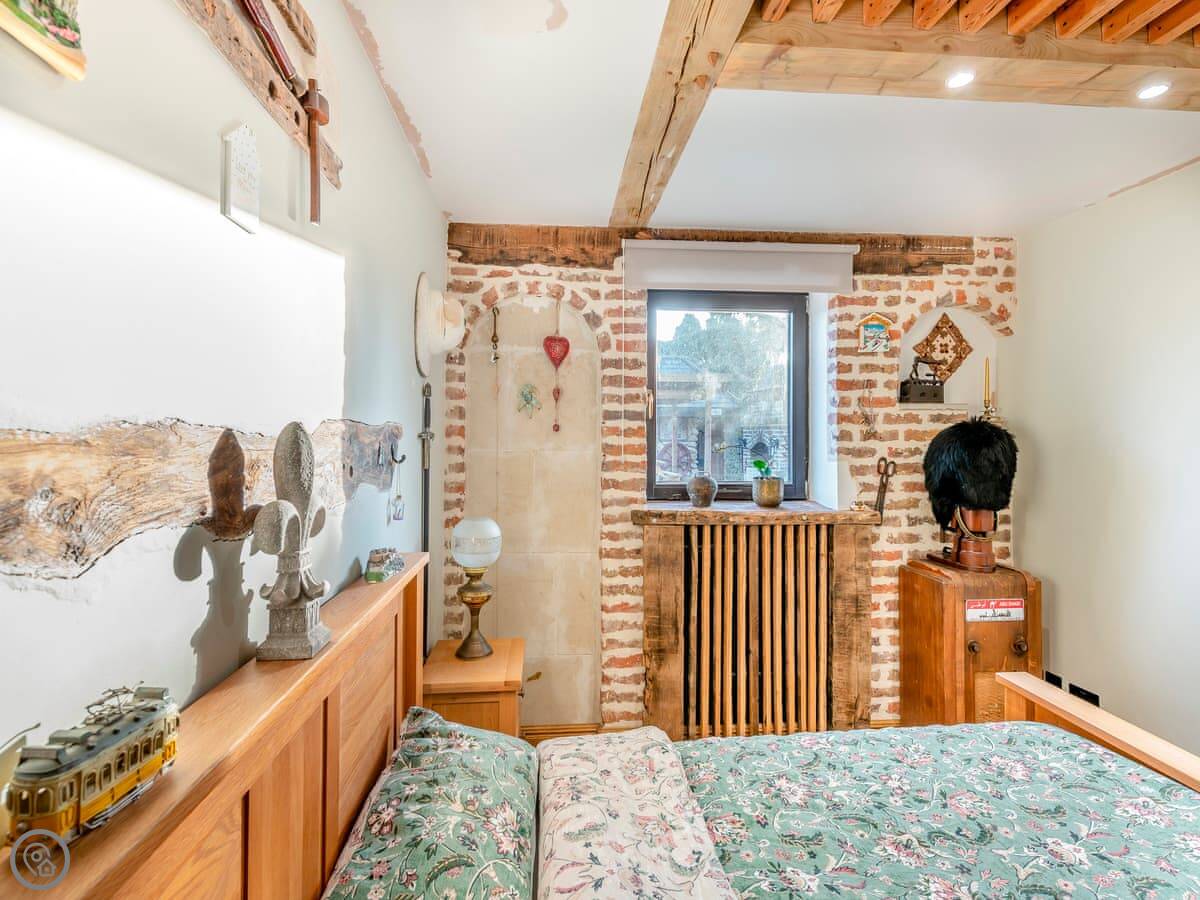 Inside, the decor is quite colourful and full of things. It's not a minimal place. It's open plan at the back with the kitchen and living area. There's a wood burning stove. One bathroom with a shower.