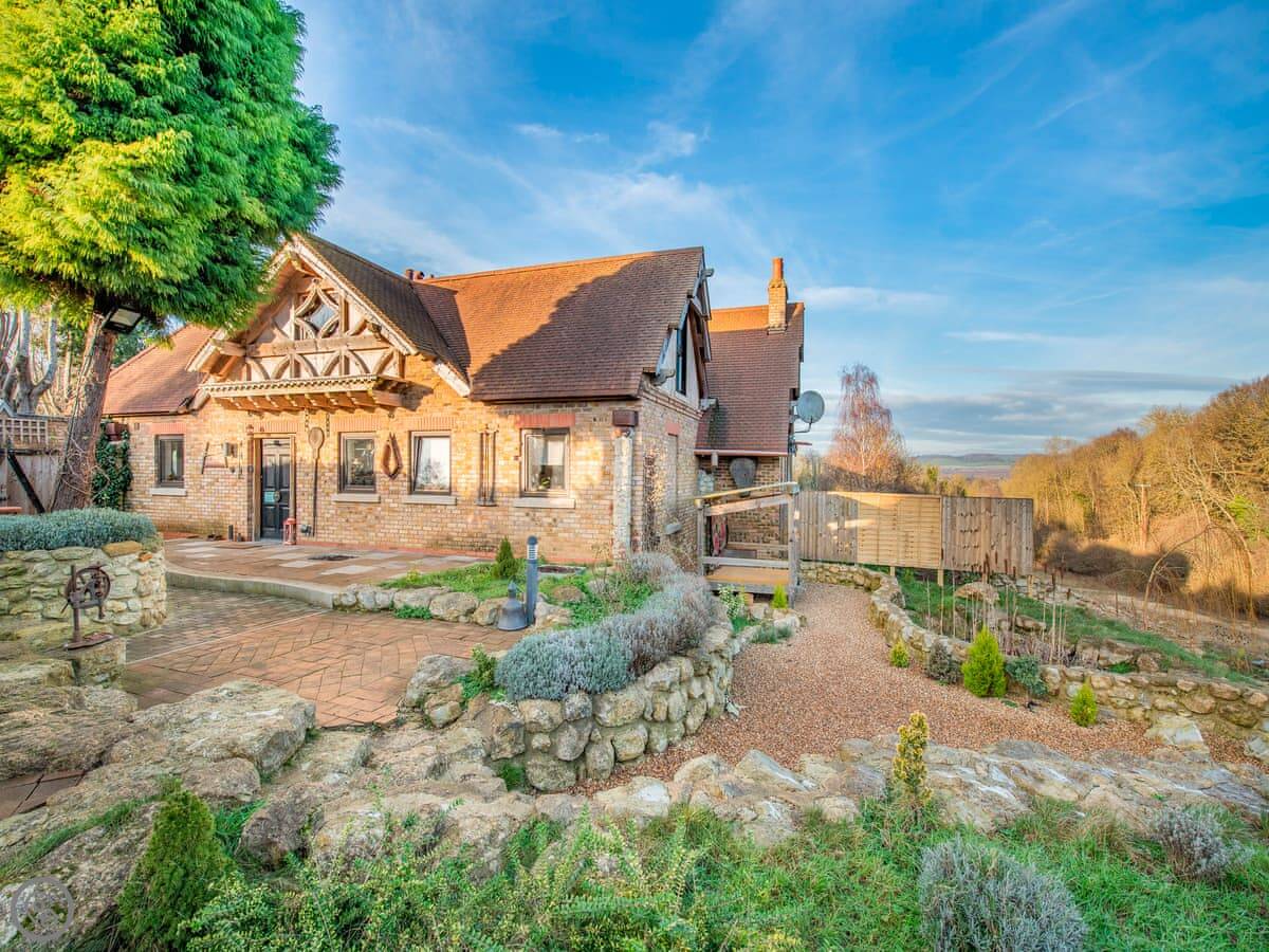 The layout is all on one floor. The garden is on different levels, so there are a few steps. It's got a nice view down the valley. There's a hot tub out there, and parking next to the property with an electric vehicle charger.