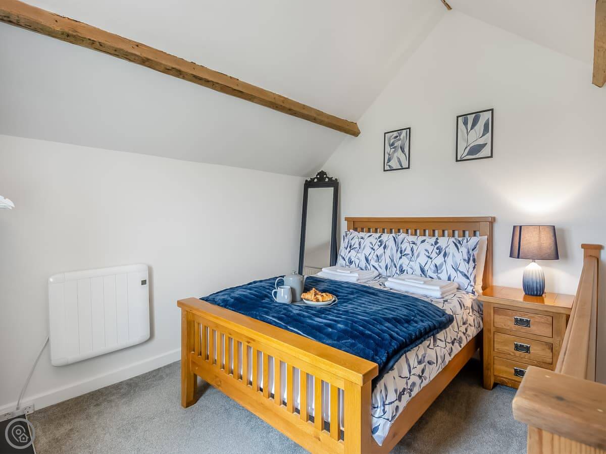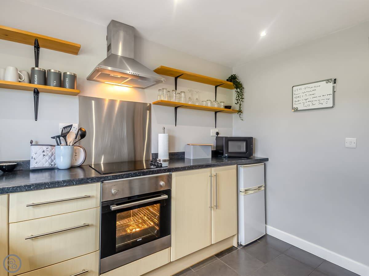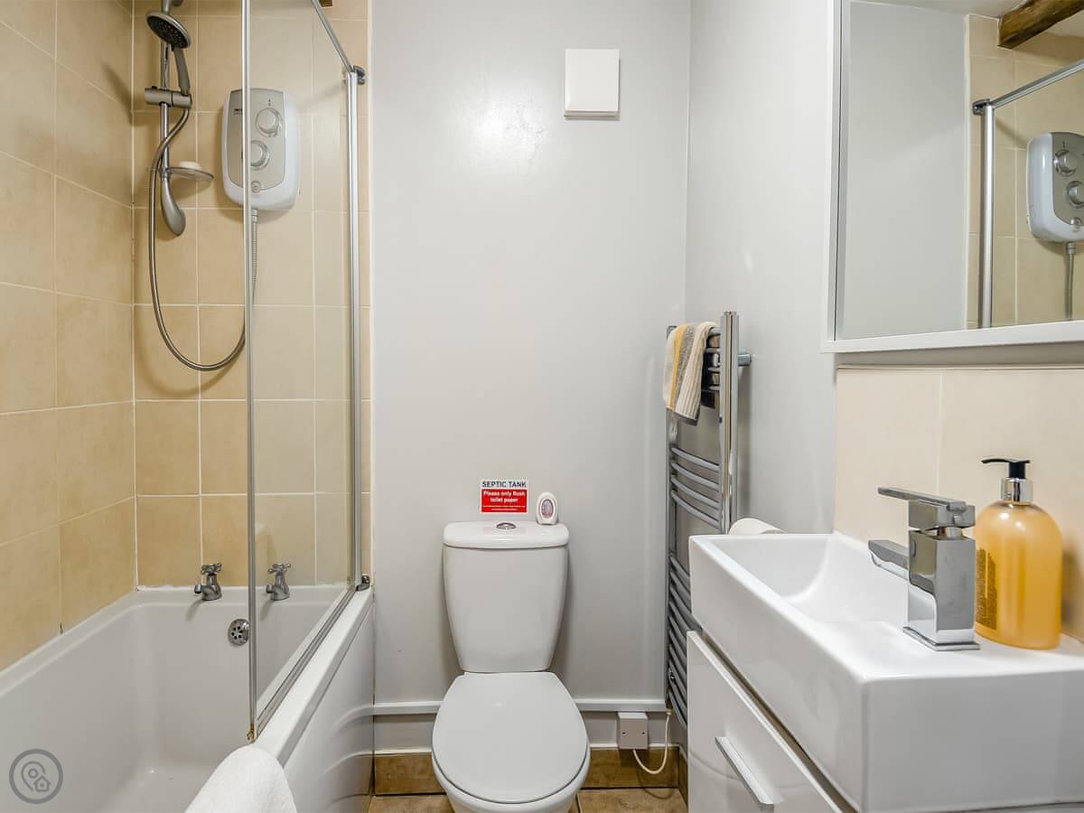 It sleeps three. There's one proper bedroom up on the mezzanine, with a double bed. Downstairs, the sofa turns into a single bed if you need it. There's one bathroom on the ground floor, which has both a bath and a shower.