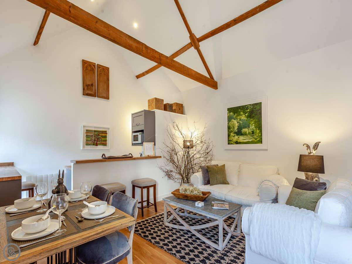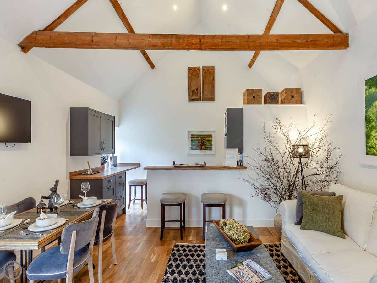 This is Midsummer Cottage Retreat, near West Compton. It's a converted barn from the 16th century, so the beams are low in places and the walls are thick. You get the garden to yourselves, and it's a good size.