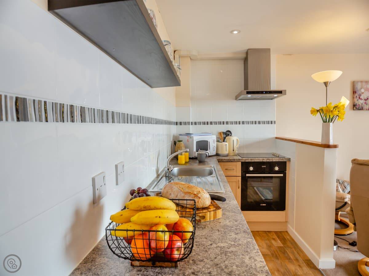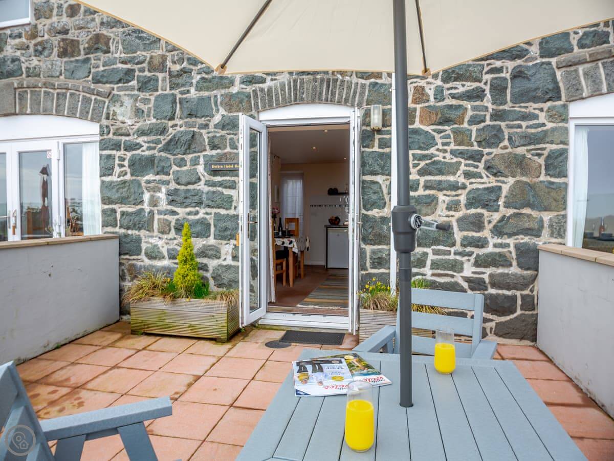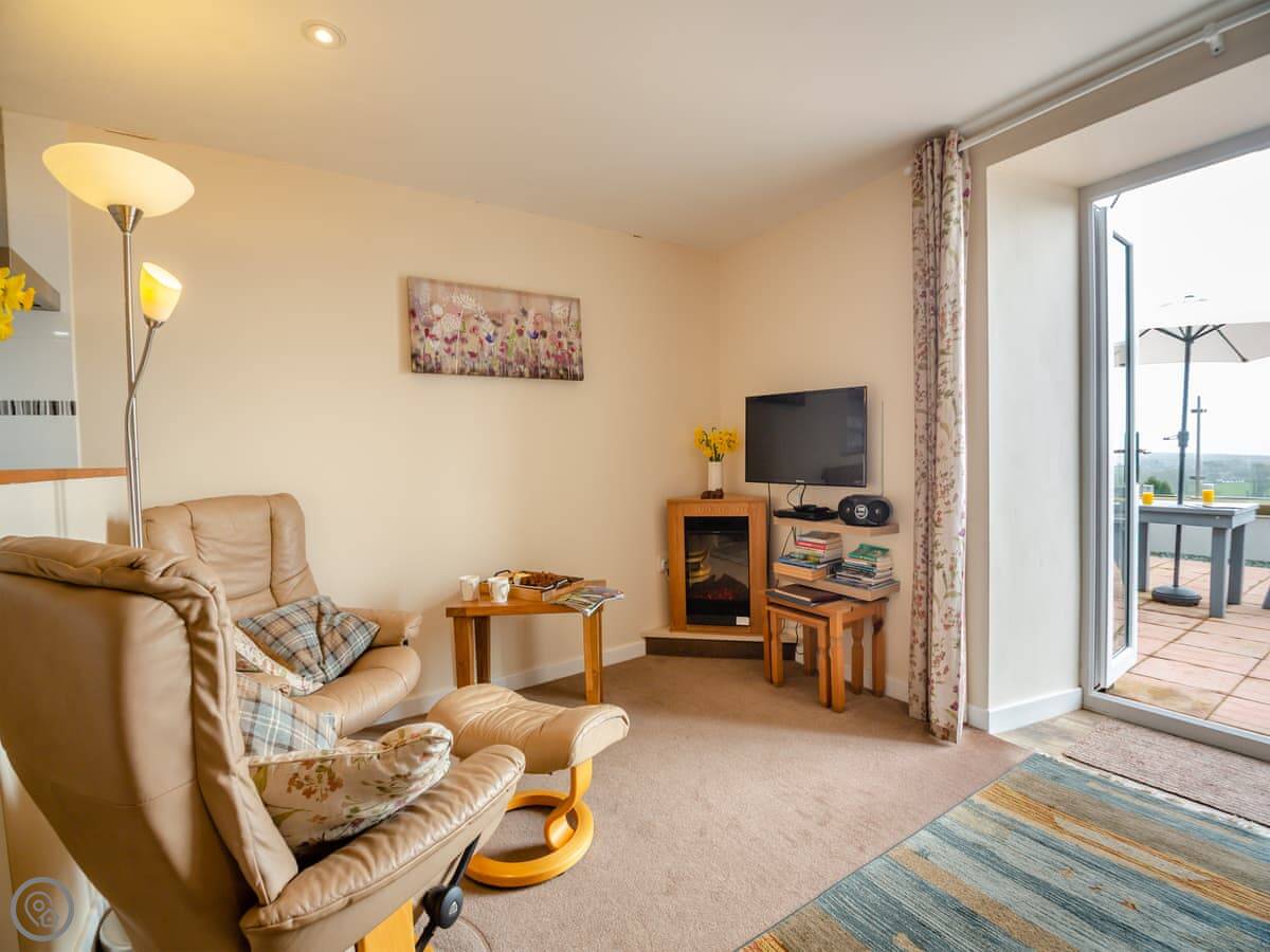 The main thing here is the view. You look straight out over Cardigan Bay. There's a private patio for sitting outside. The living area is open-plan, with a kitchen area. It's not huge, but it's enough for two. The bedroom has a double bed.