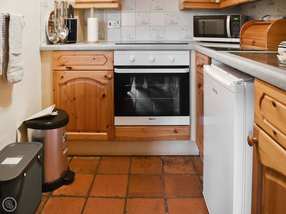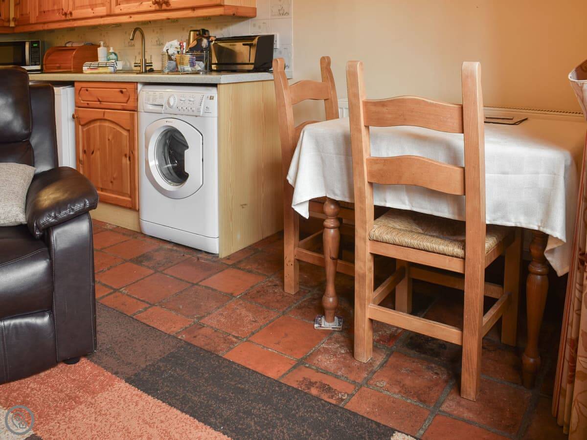 It sleeps two. One bedroom and one bathroom. It's 3 Star rated, so it's comfortable but plain. It's open plan downstairs. The kitchen area is compact.