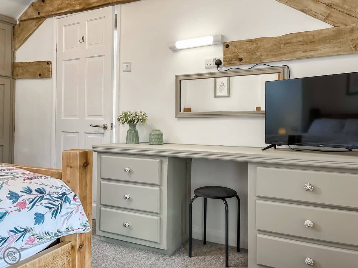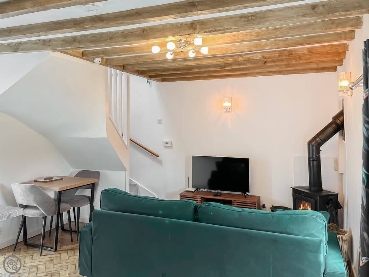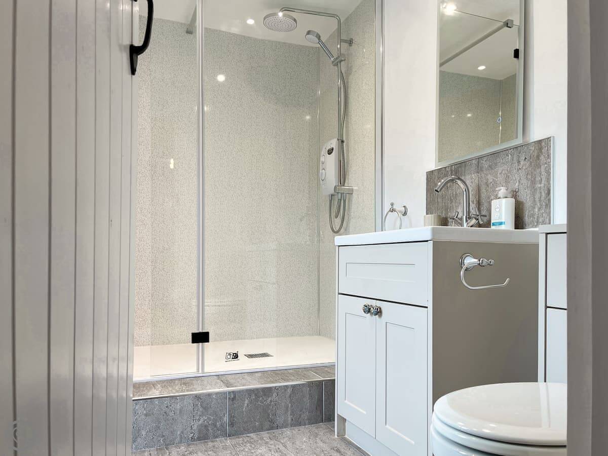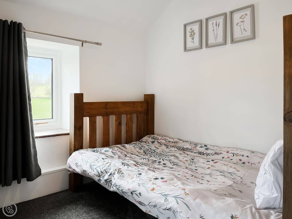 It sleeps three. Two bedrooms upstairs, one double and one single. One bathroom downstairs. The shower has a step up into it. The stairs are steep. It's a 4 Star place, so it's comfortable and well-equipped. The log burner in the living area is good.