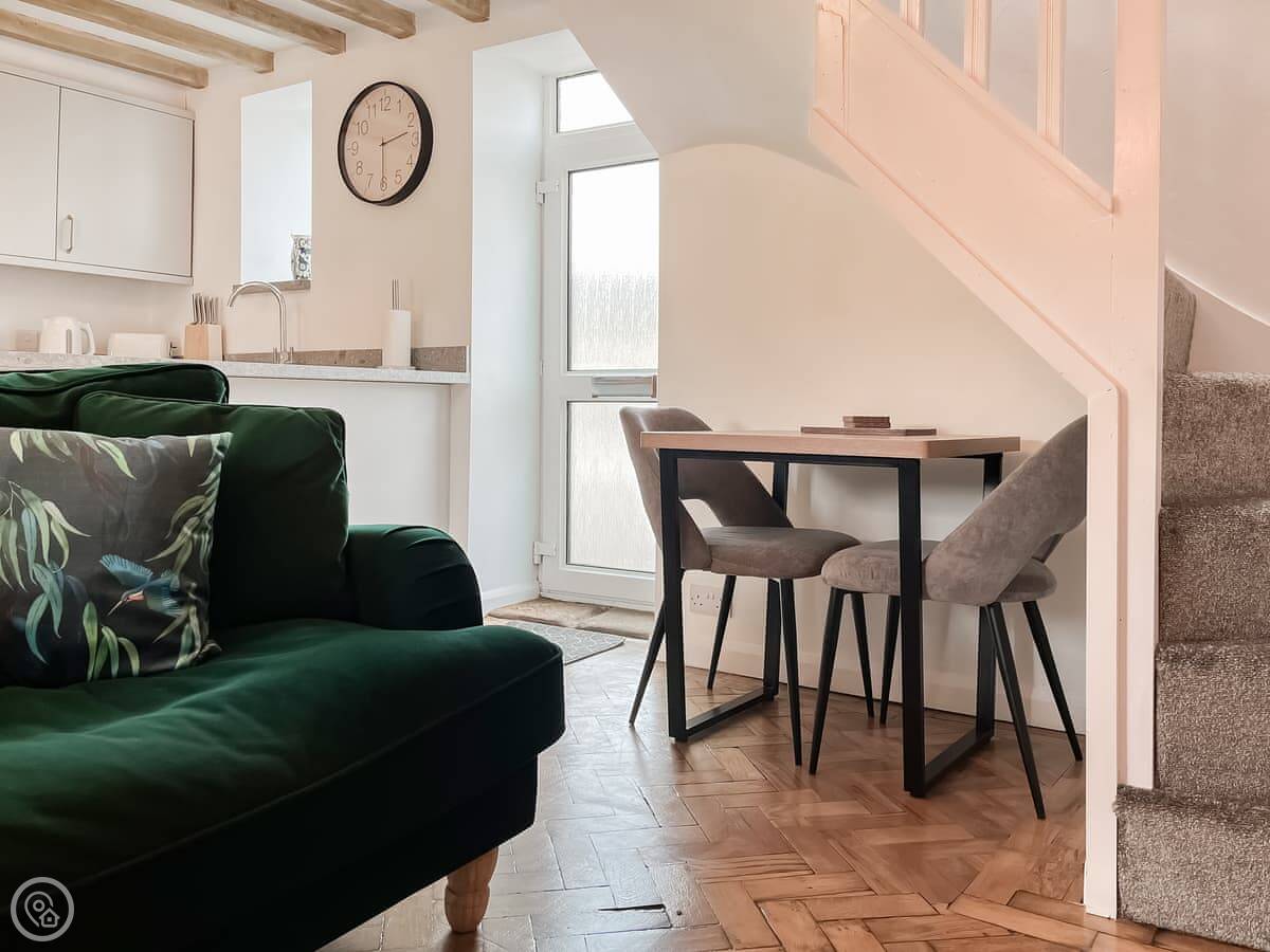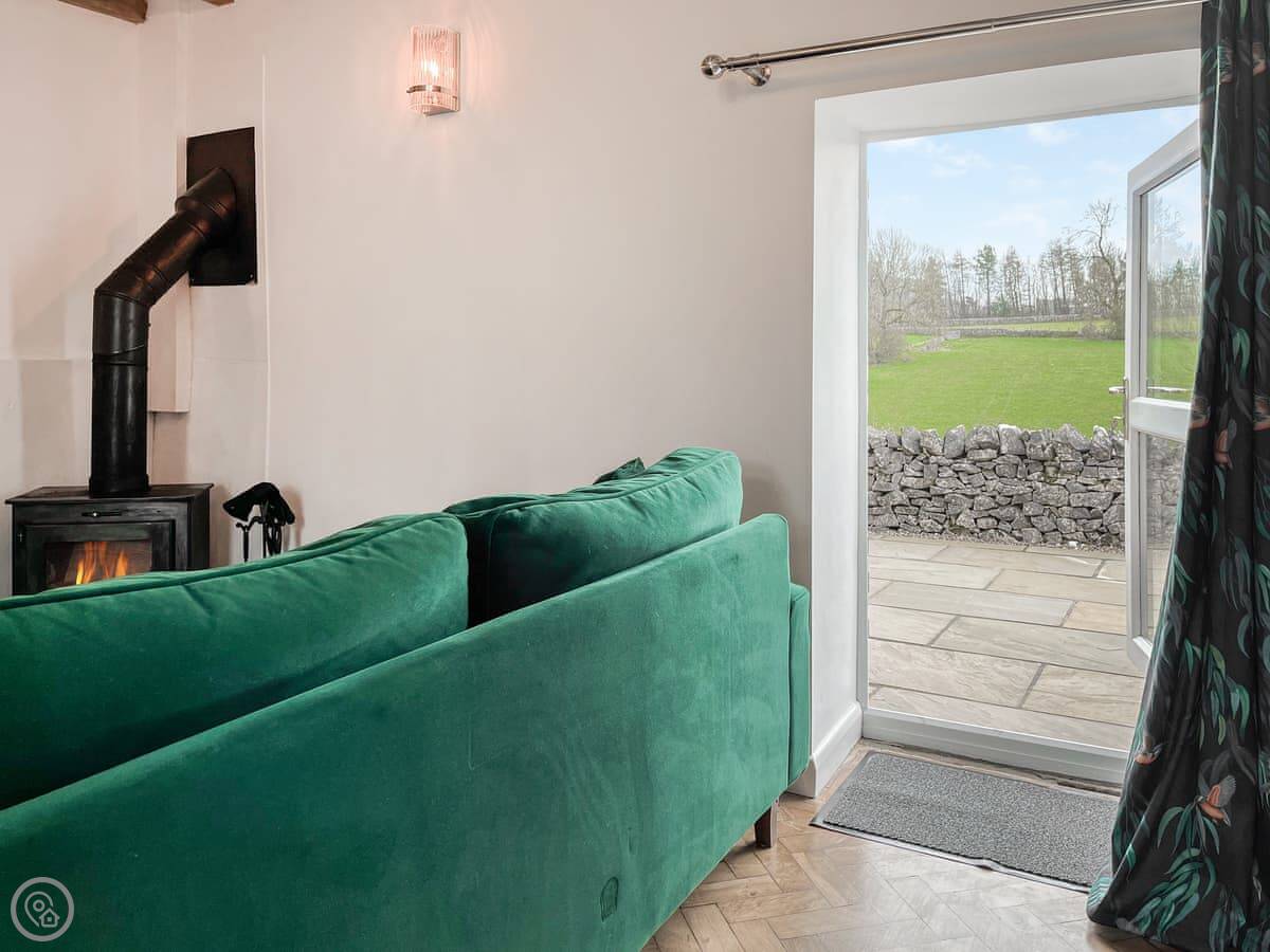 The kitchen has what you need. There's a washing machine and a dishwasher. Bedding and towels are included. Outside, you get your own enclosed patio with a view over the fields. You can park two cars right by the cottage.
