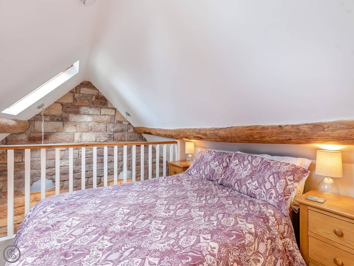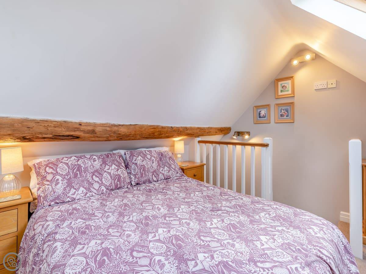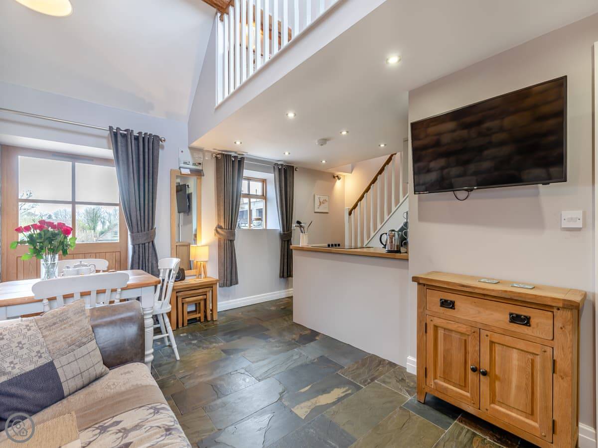 The bed's upstairs on a mezzanine. You go up a staircase to get to it. It's a double bed. Downstairs is all open plan: kitchen, table, sofa, and a TV. The shower room is down there too. There's a small enclosed courtyard out the front with a table and chairs. The view from there is across our fields.