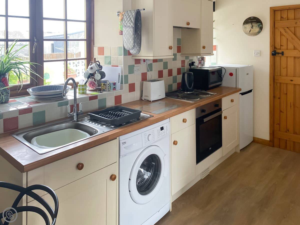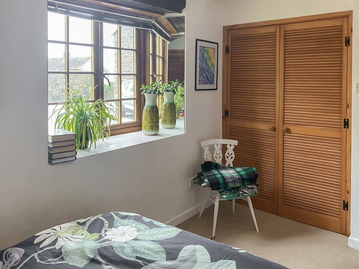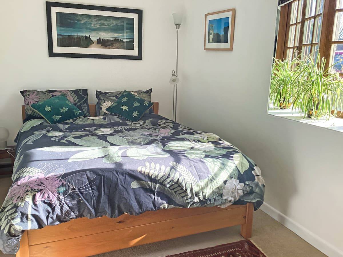 It sleeps four. Two bedrooms, one bathroom. One bedroom is a double, the other has two adult-sized bunk beds. You can see the Scilly Isles from the main bedroom window if the weather's clear. We've got a wood burner in the living room. We'll leave you some logs to start you off. There's a TV and wifi, and a washing machine. We leave bedding and towels for you.