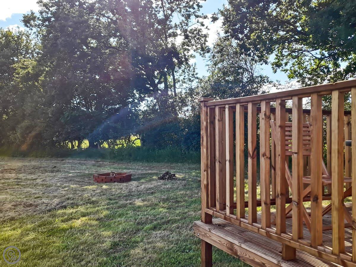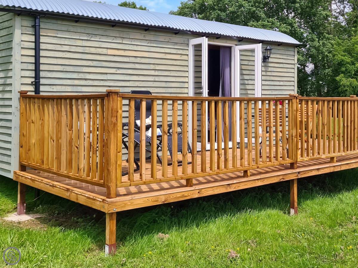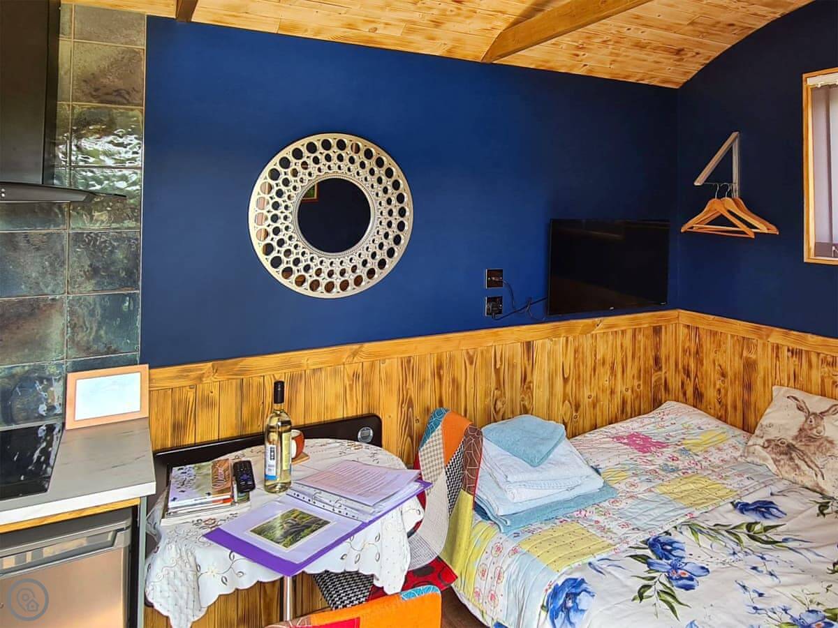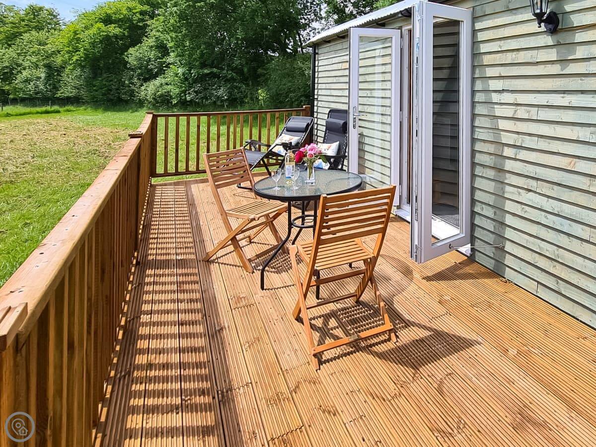 It's a modern hut, so it has proper insulation, an electric wood burner, a small kitchen with a fridge and a hob, and a shower room. The bed is a double. There's a deck outside with a table and chairs.