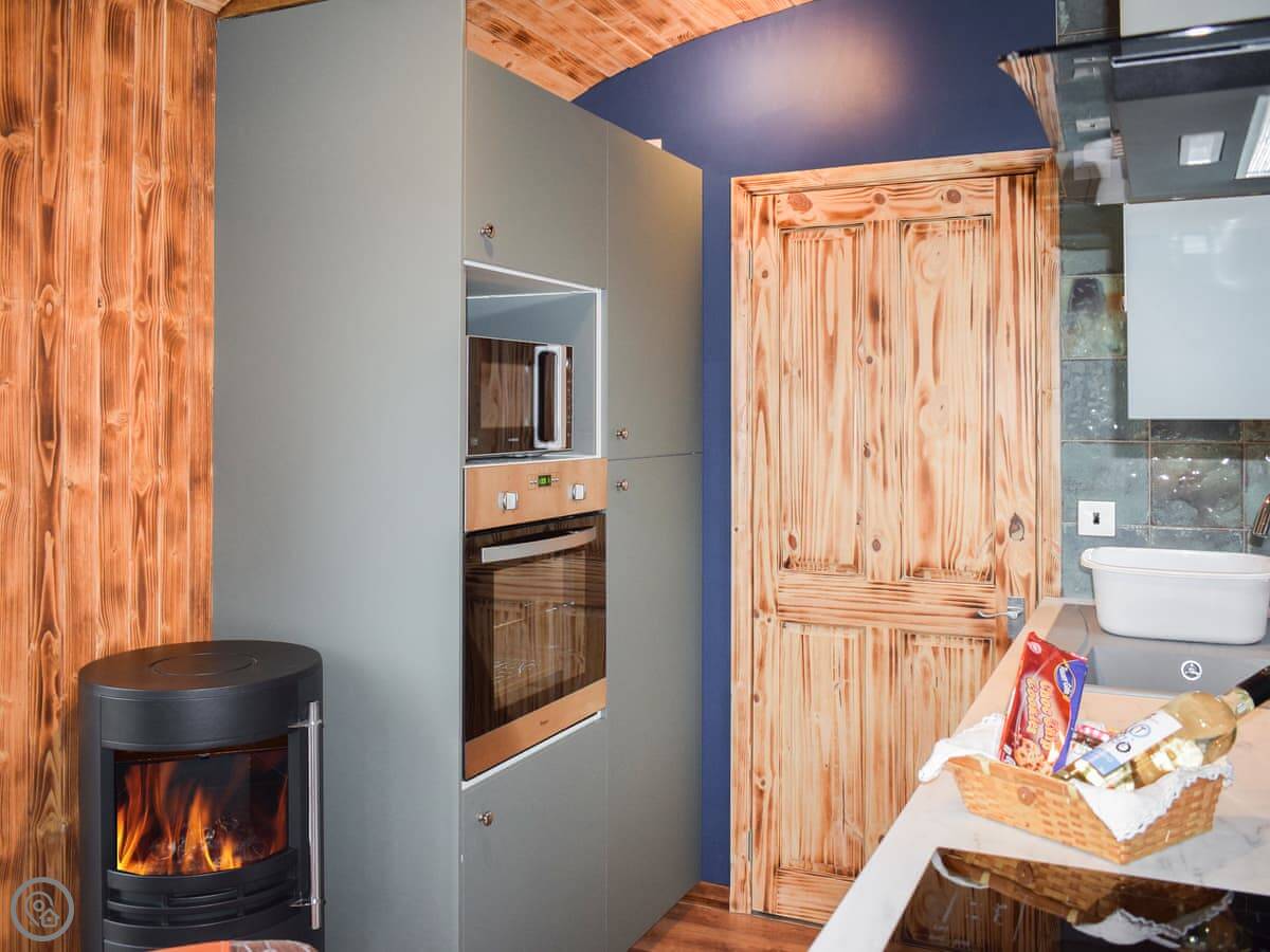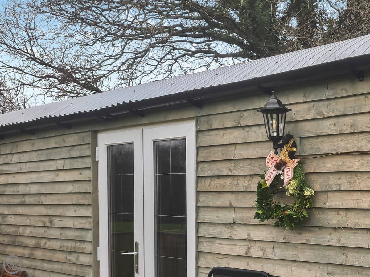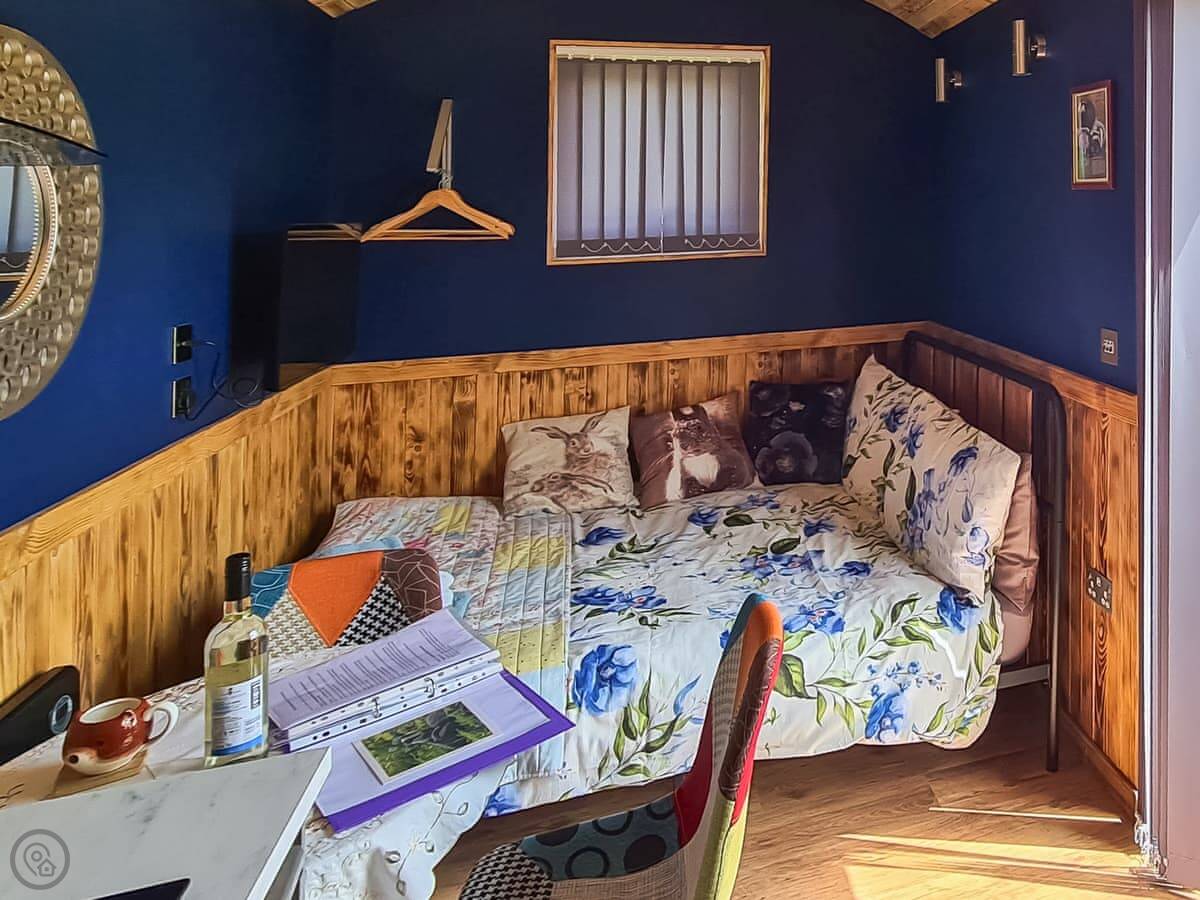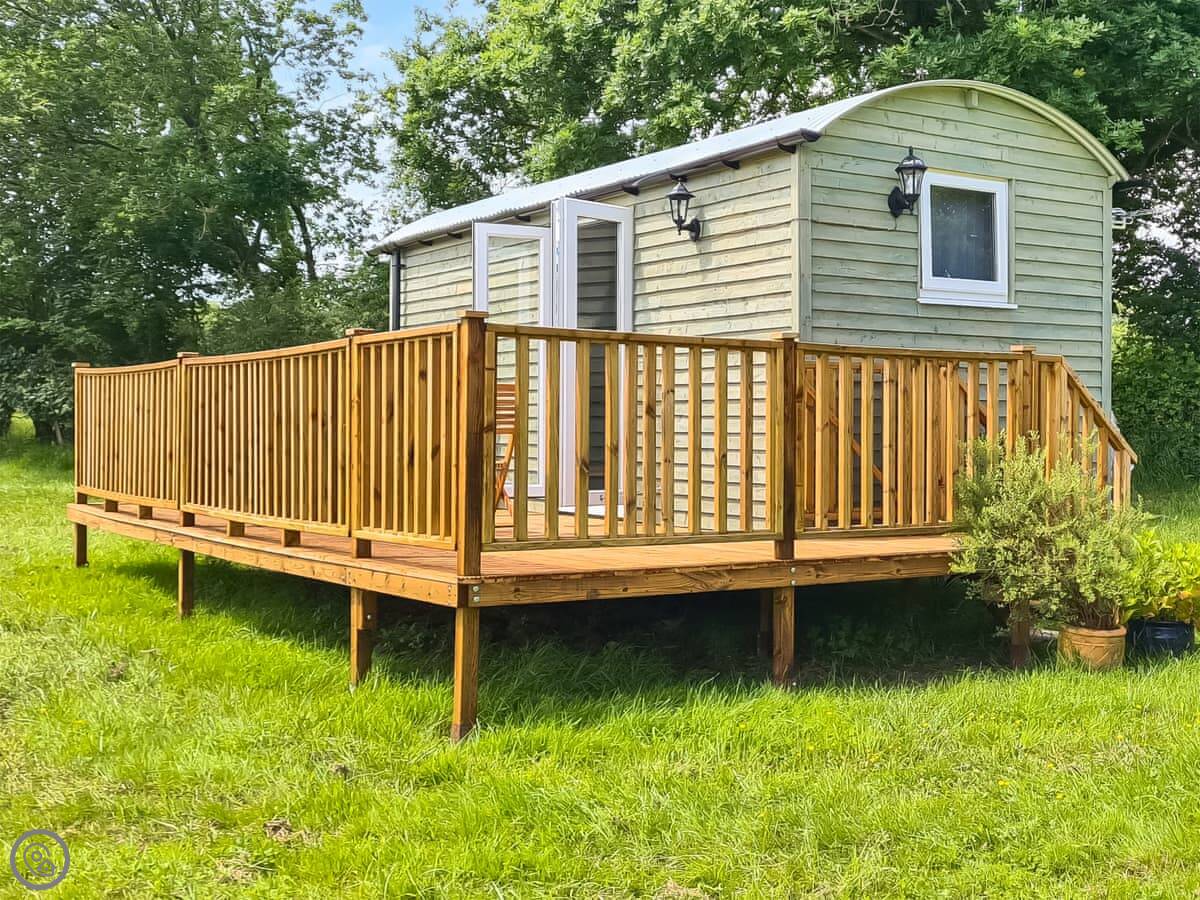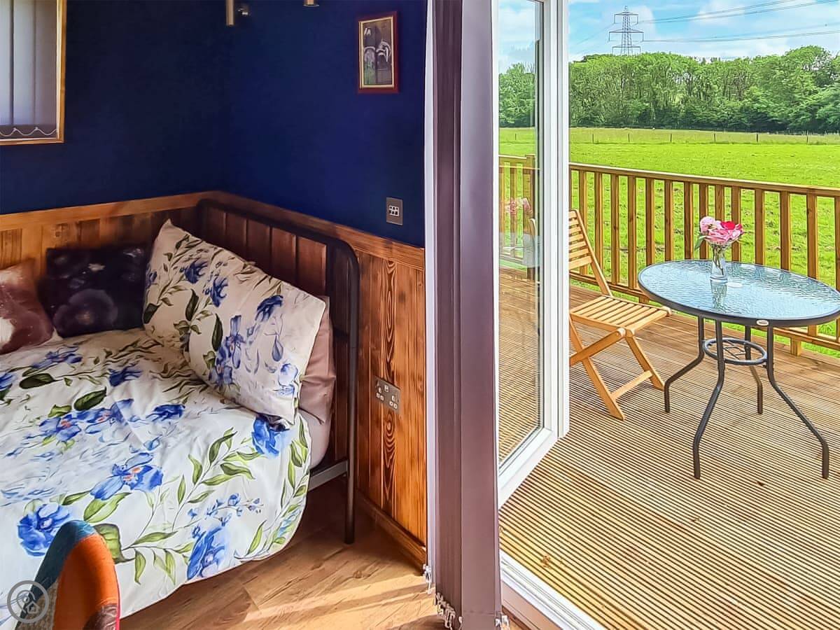 It's a modern hut, so it has proper insulation, an electric wood burner, a small kitchen with a fridge and a hob, and a shower room. The bed is a double. There's a deck outside with a table and chairs.