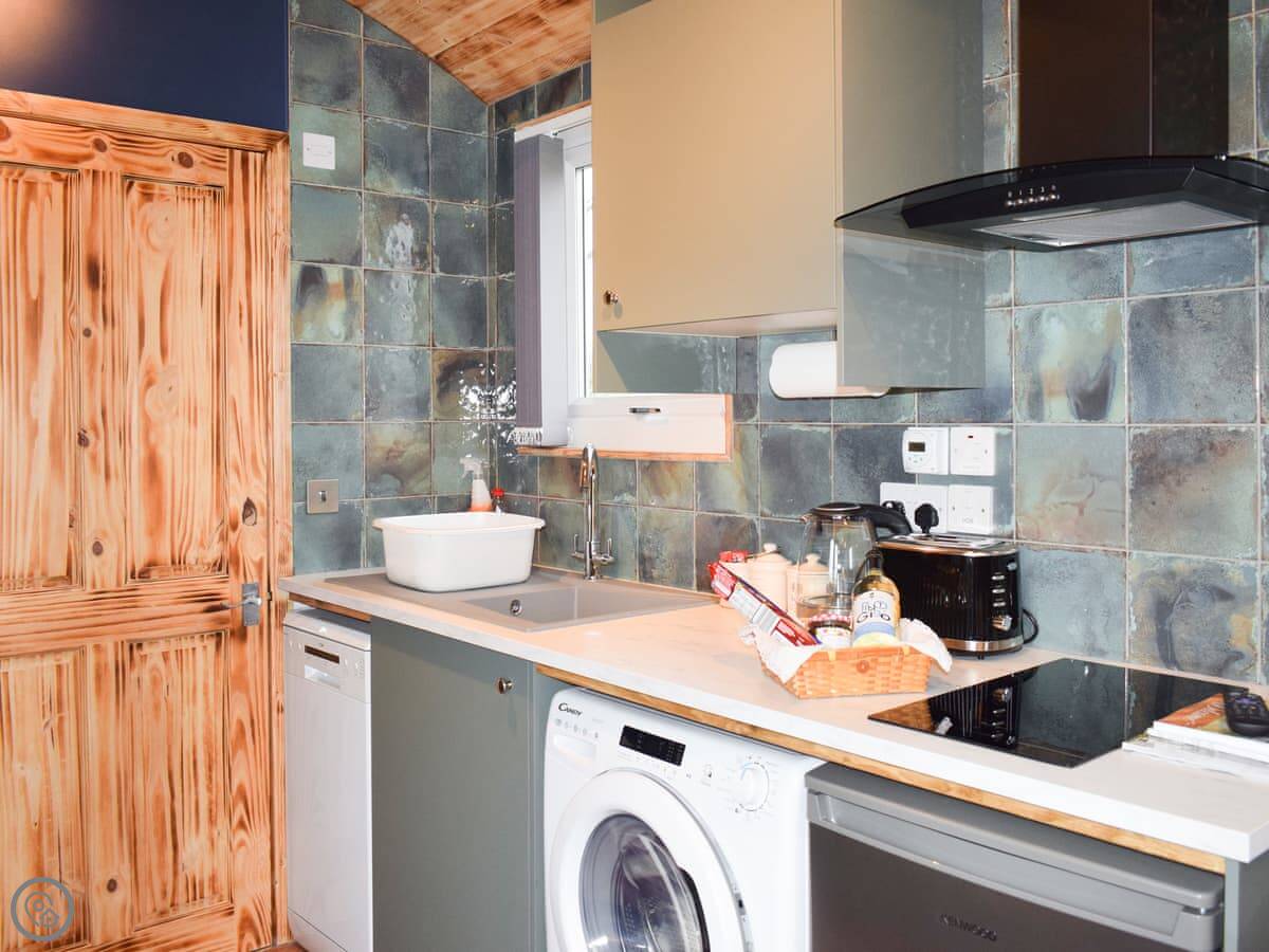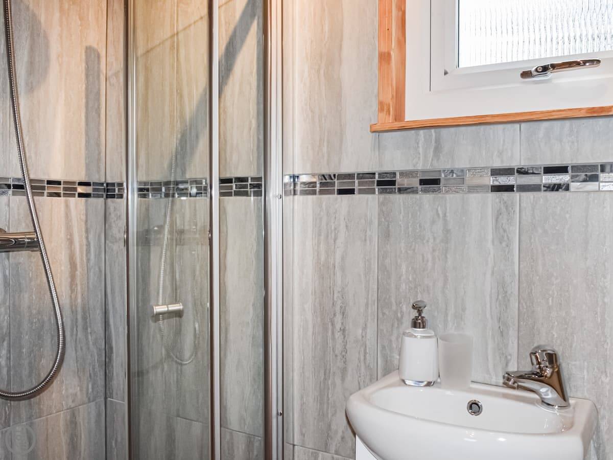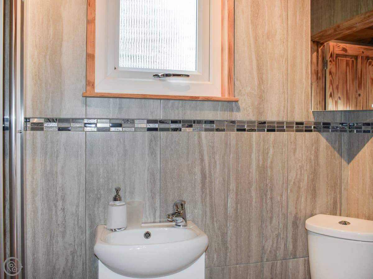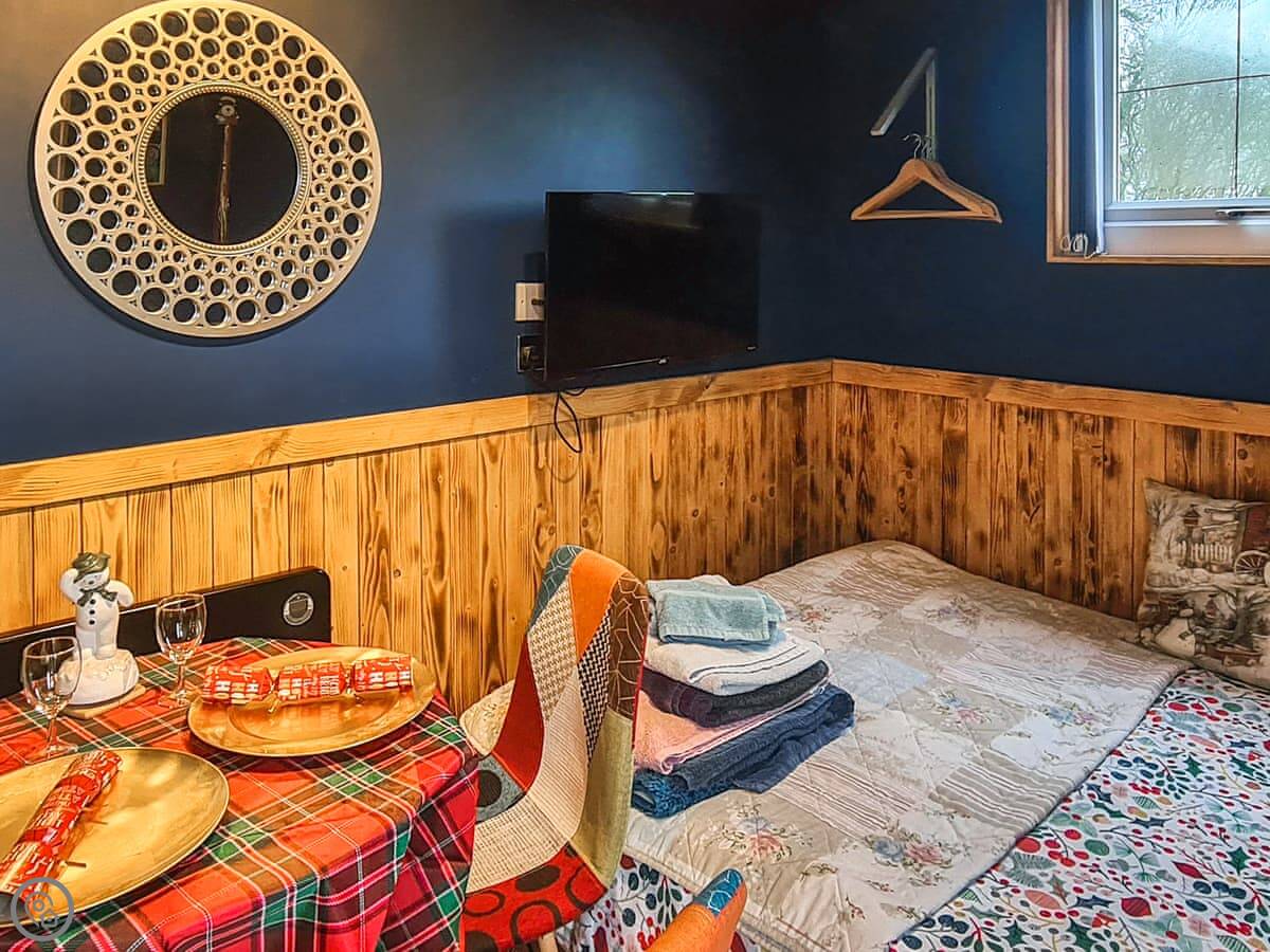 It's a modern hut, so it has proper insulation, an electric wood burner, a small kitchen with a fridge and a hob, and a shower room. The bed is a double. There's a deck outside with a table and chairs.