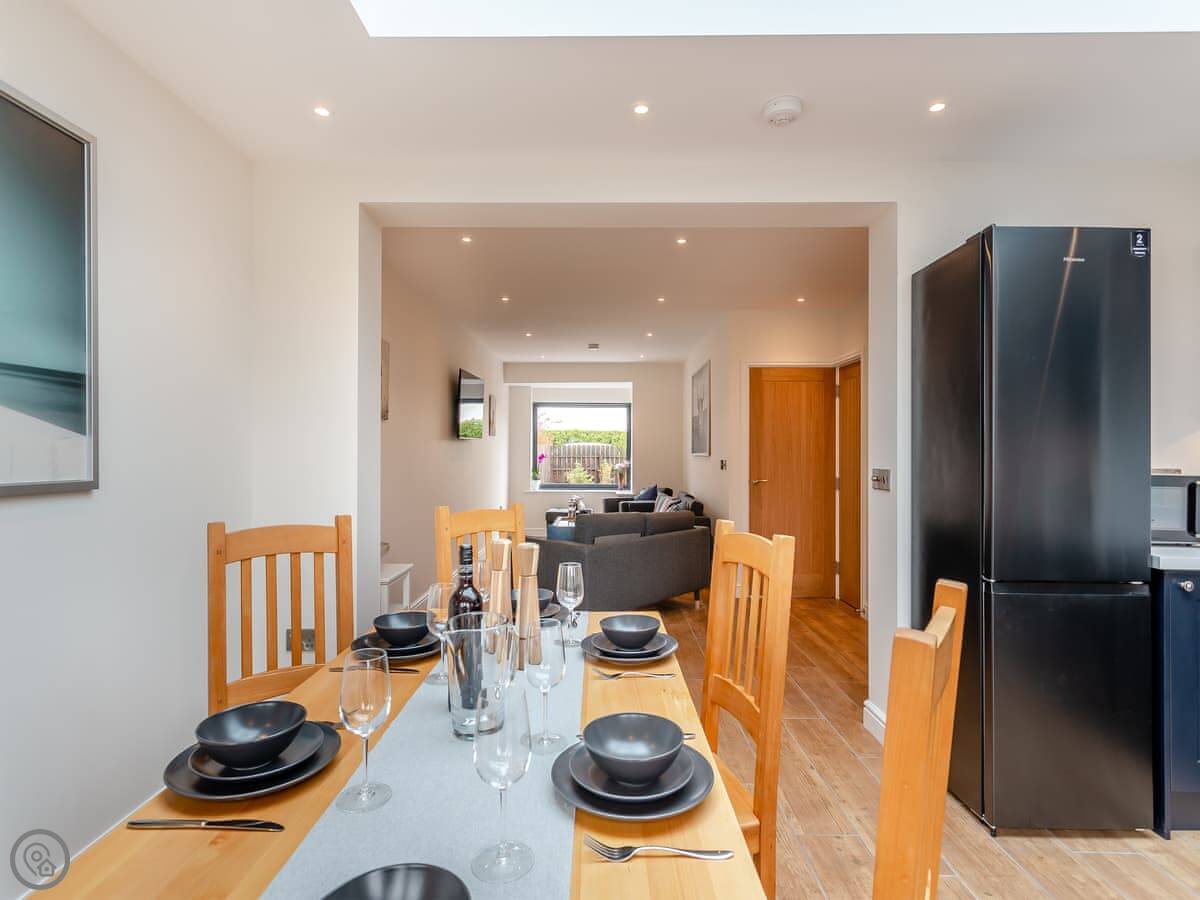 The living area is open plan. Kitchen, dining, and sitting room all together. Patio doors lead straight out to the garden. There's a Smart TV. The kitchen has a dishwasher and there's a washing machine in the utility bit.