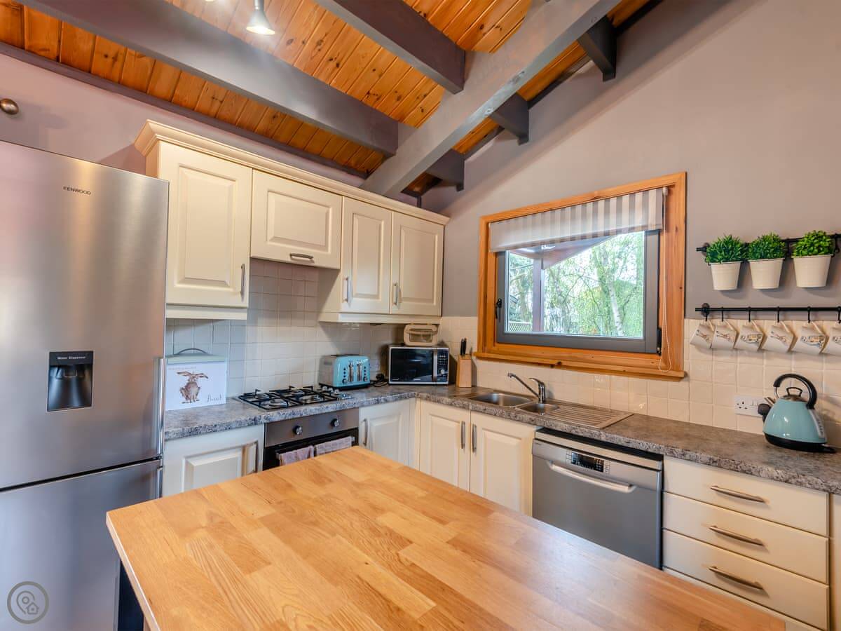 Inside, it's open plan. There's a washing machine, a dishwasher, a TV. Bedding and towels are included. You can bring up to two dogs.