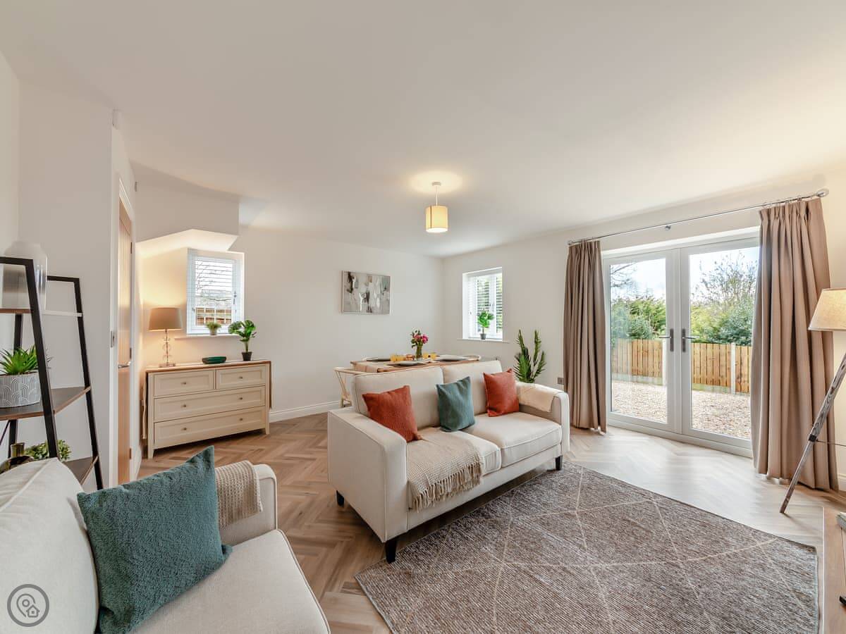 It sleeps five in three bedrooms. One bedroom has its own shower room, and there's another family bathroom. The main room downstairs is open plan, with French doors out to the back. There's a separate kitchen. The garden is pebbled with some seating. It's enclosed.