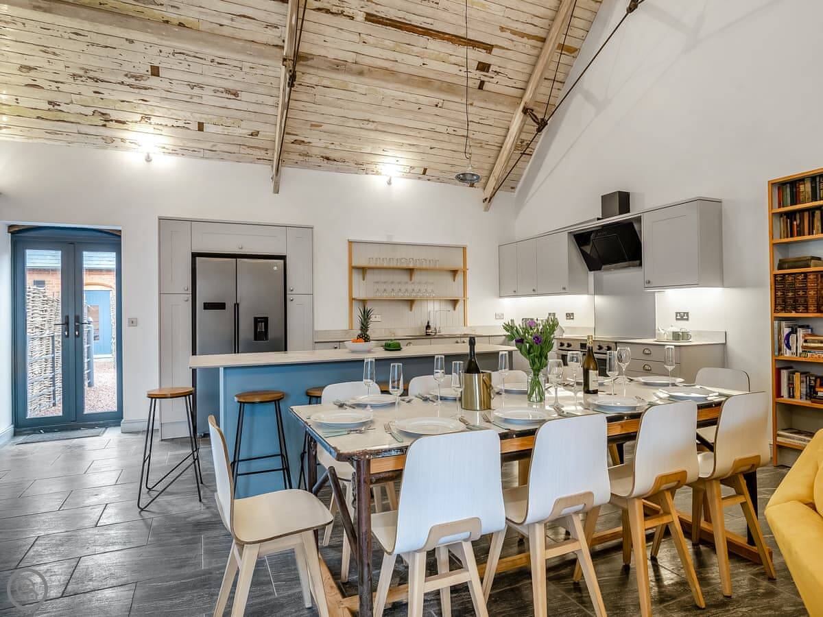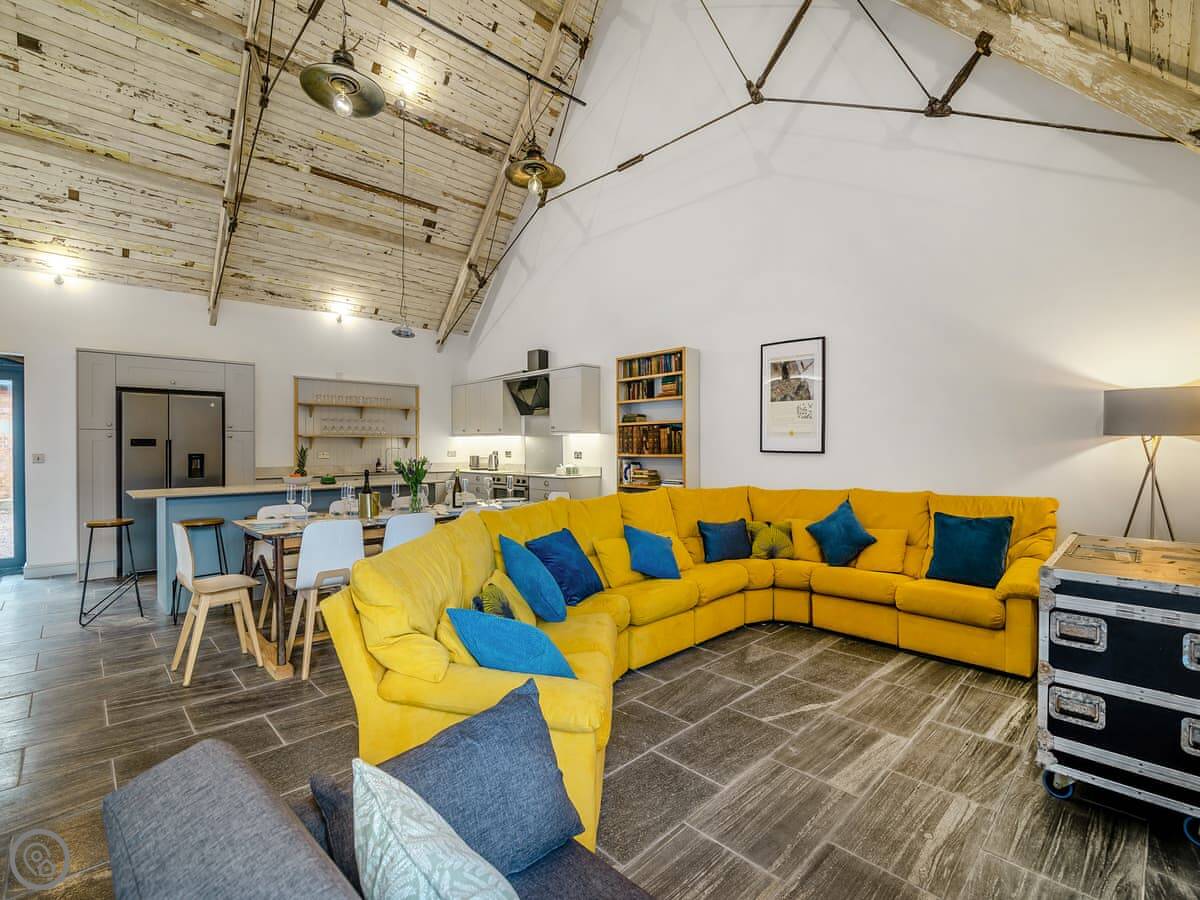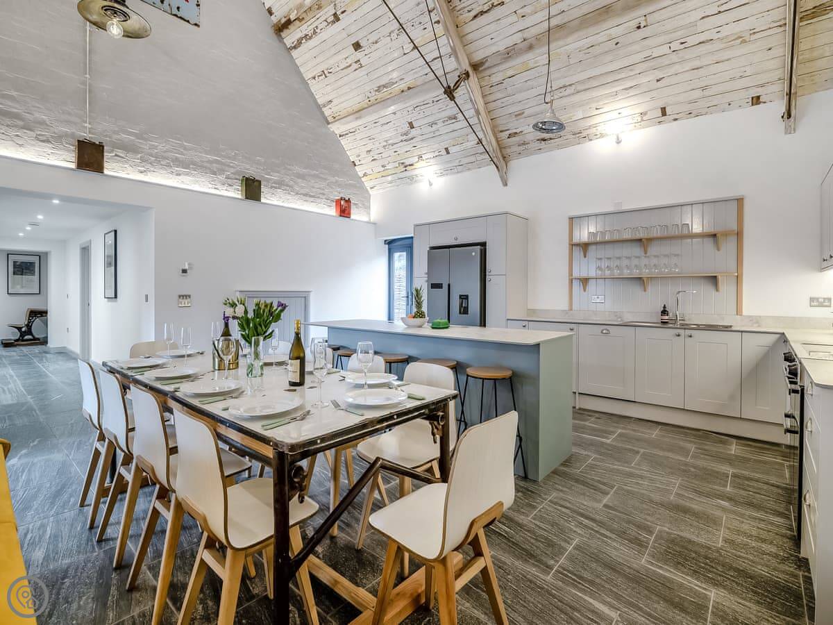 Downstairs is mostly one big open room. Kitchen at one end, sofas and a big table at the other. The kitchen is well fitted, with a dishwasher and a big range cooker. The second living area is upstairs, with two sofa beds. Good for kids to have their own space.