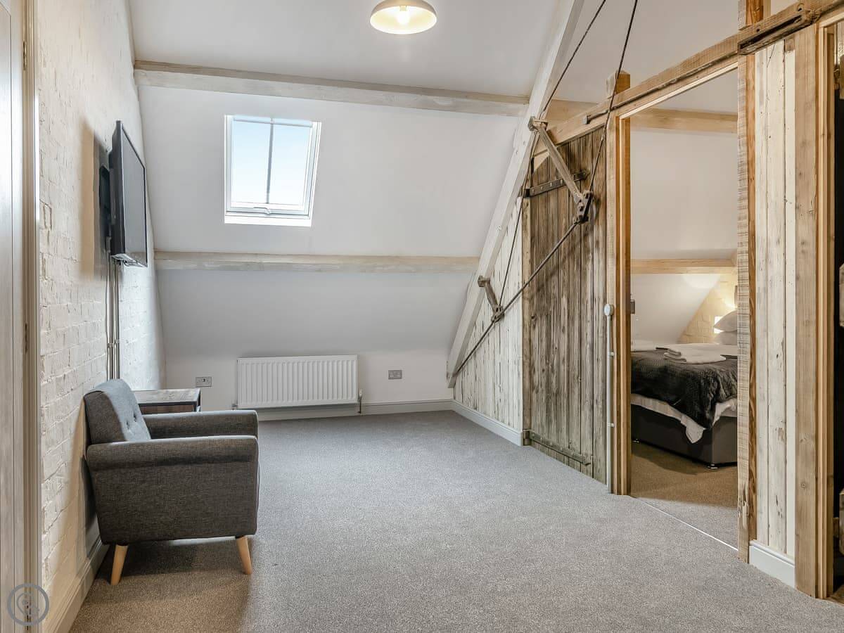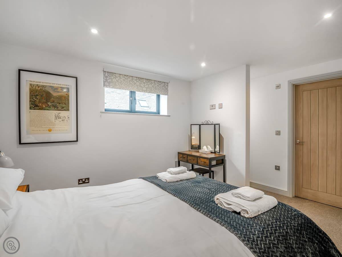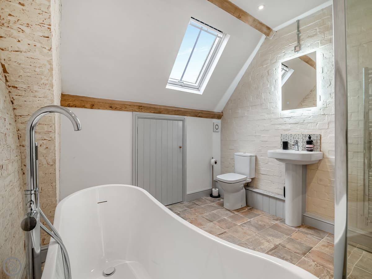Outside, there's a paved courtyard with a BBQ and a wood-fired hot tub. You have to light the hot tub yourself, it takes a few hours to heat up. The farm has big fields you can walk in, and they're enclosed, so dogs are fine.