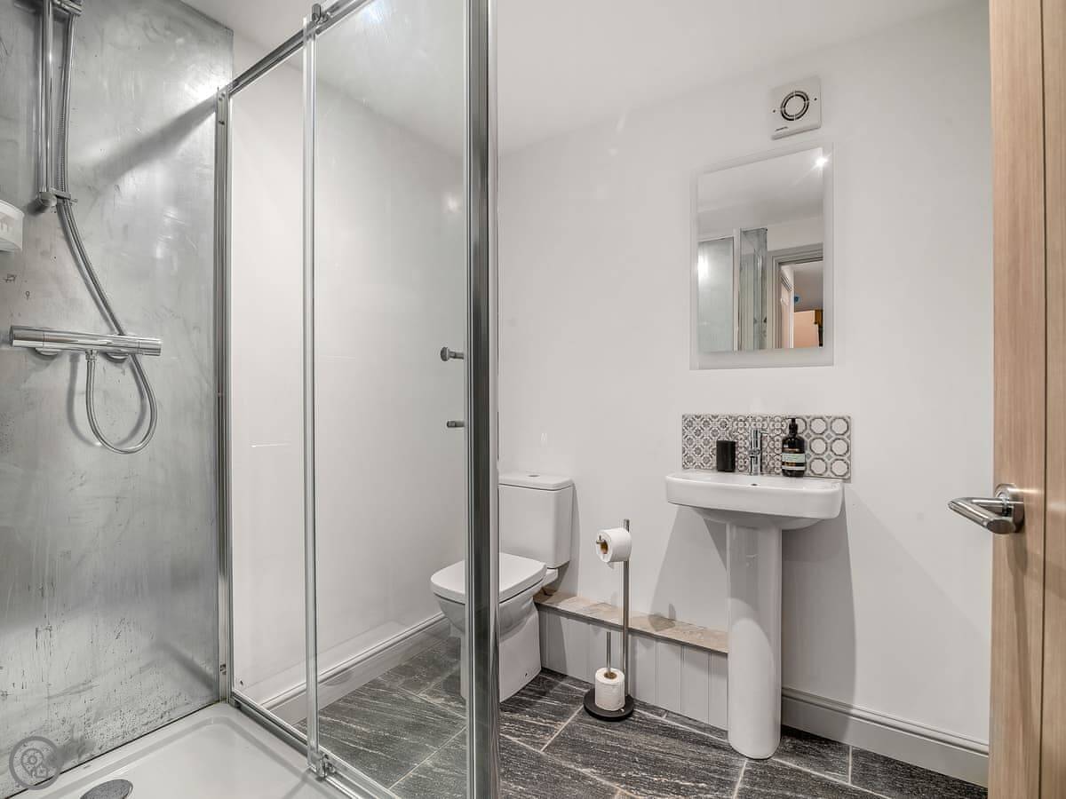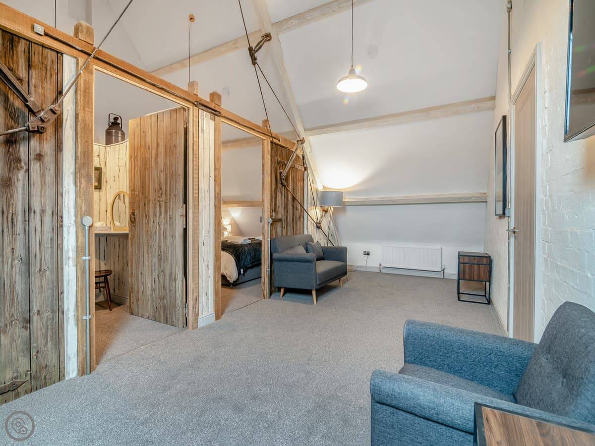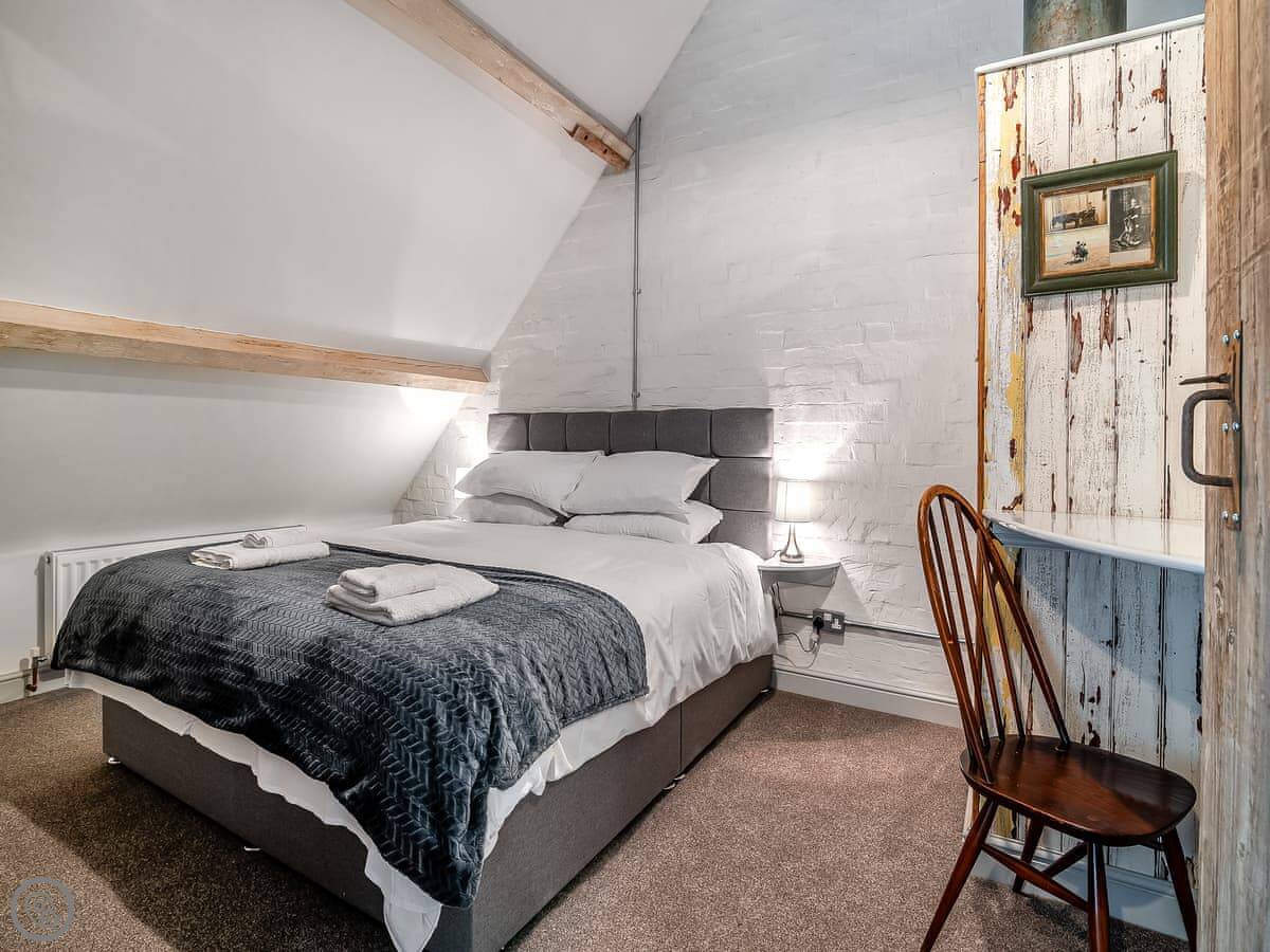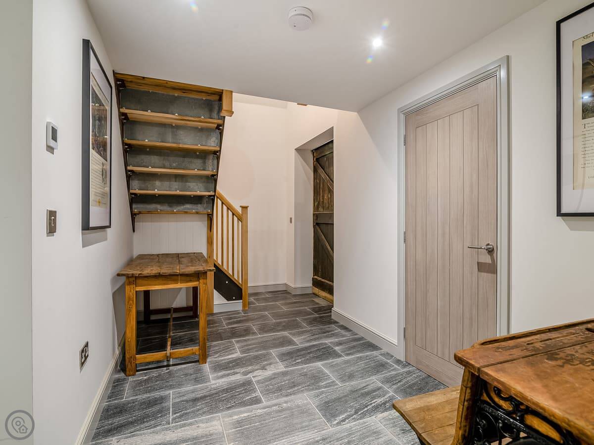 It sleeps up to 14 people, which is unusual. There are five bedrooms and two bathrooms. Three of the bedrooms are on the ground floor, which is useful. The stairs go up to two large super-king bedrooms, and there's a sort of wooden stable door partition between them. It's original, from when it was a barn.