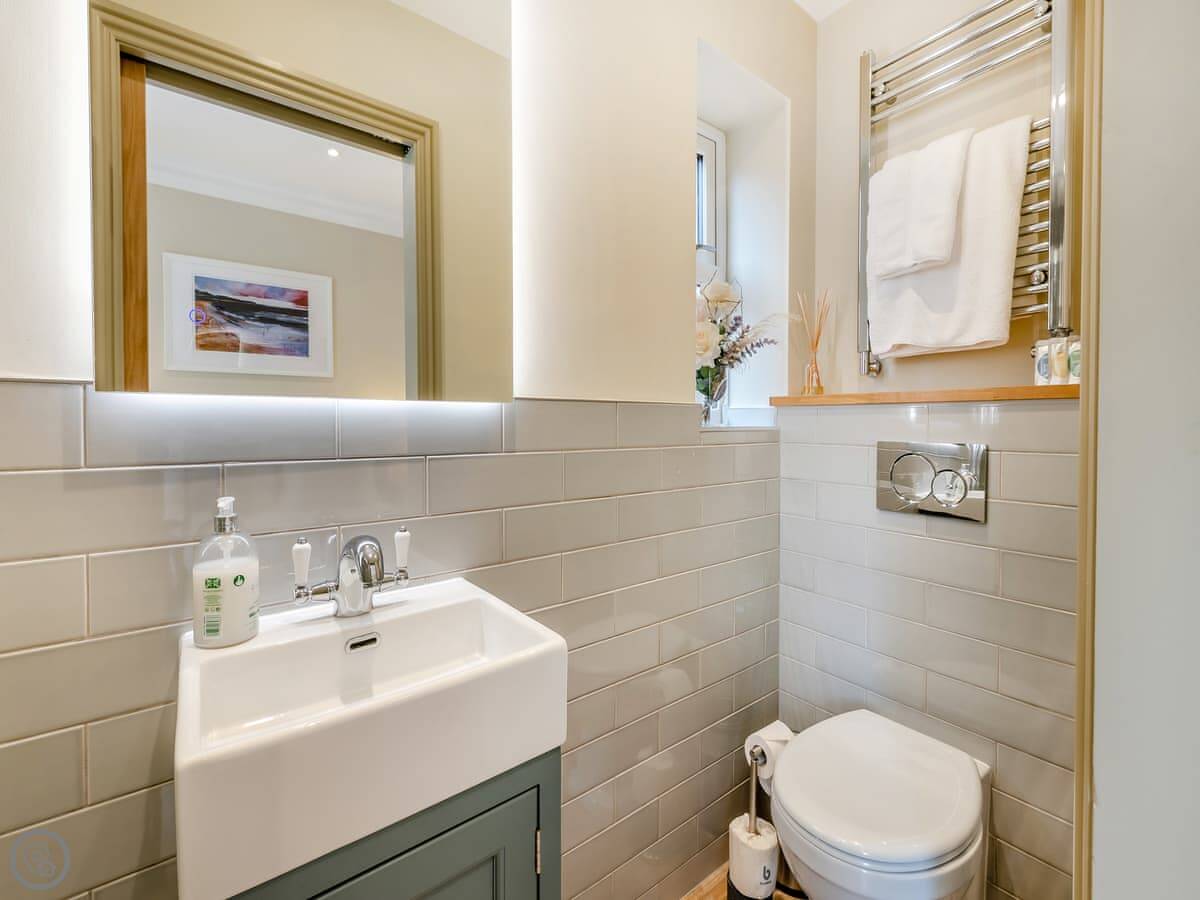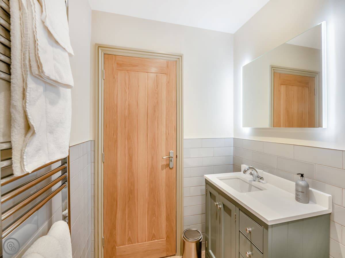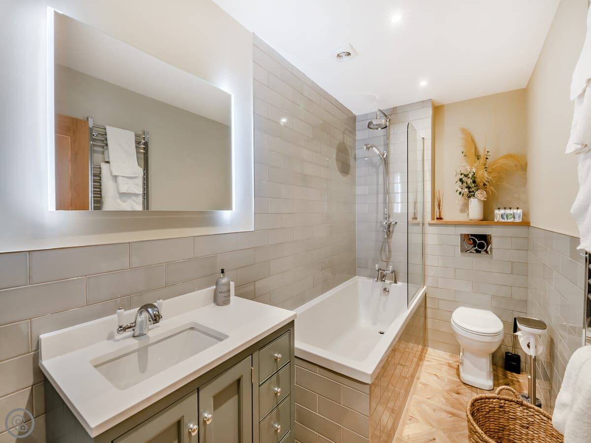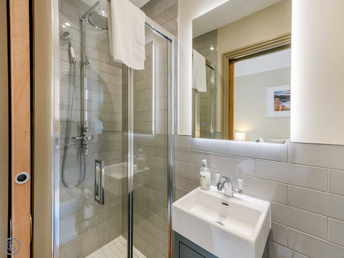 It sleeps four. There are two double bedrooms and two bathrooms. One bathroom is an en suite with a walk-in shower. It's a 5 Star place, so everything is in good order.