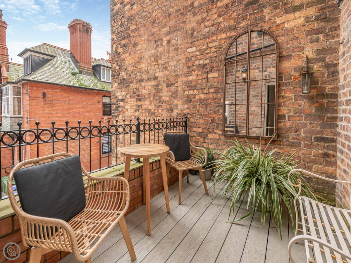 The main living area is open plan. There's a kitchen with a dishwasher and washing machine, a table for four, and two sofas facing the TV. There's also a large fish tank with tropical fish. The best feature is probably the balcony. It gets the sun and has outdoor seating.
