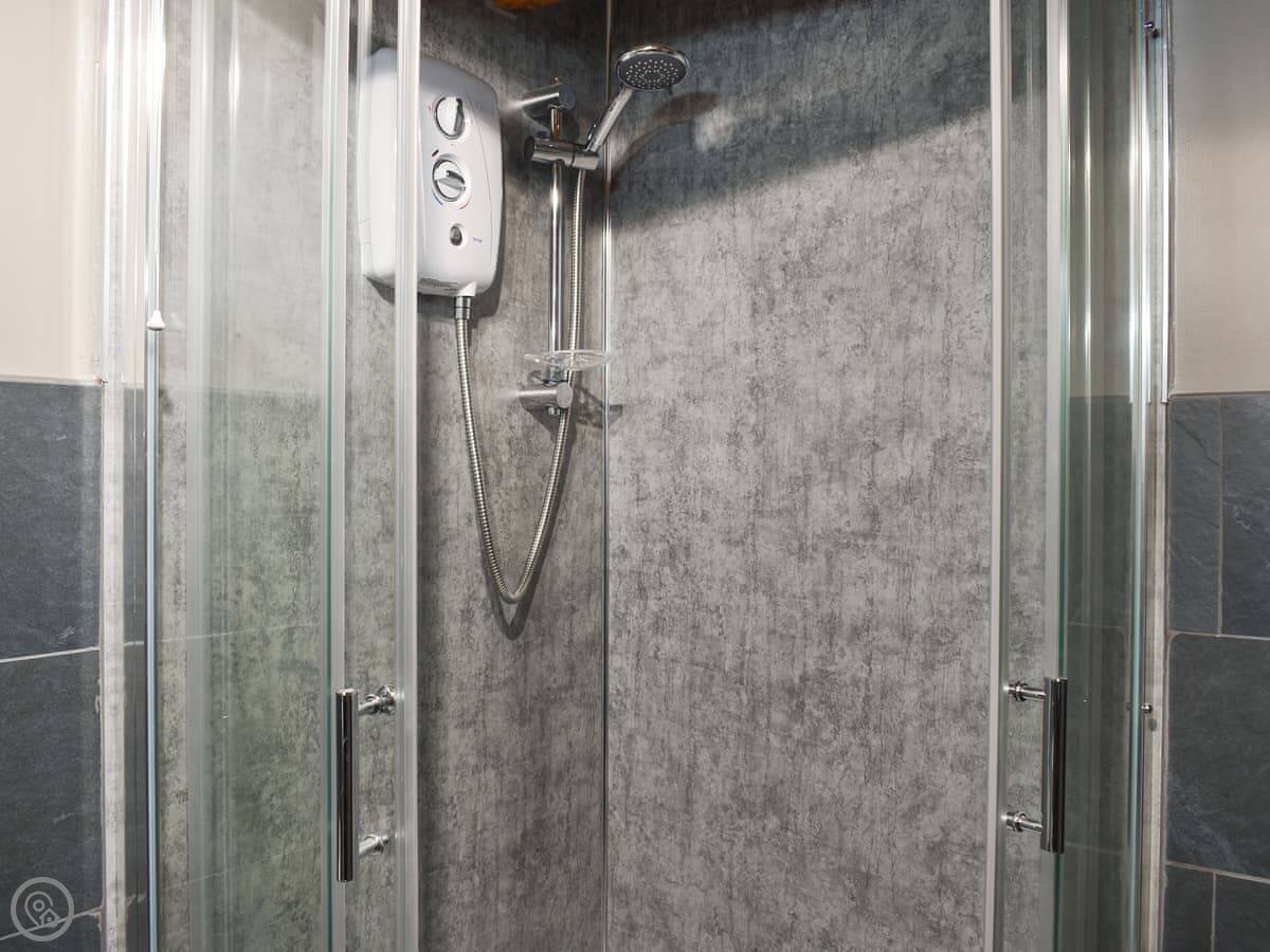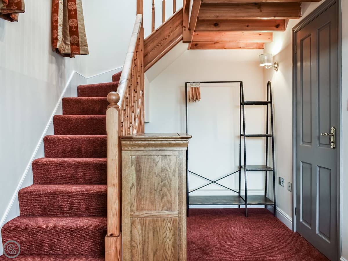 The layout is upside down. You go in on the ground floor and that's where the bedroom is. It has a king-size bed and an ensuite shower. Upstairs is the living space: kitchen, dining area, and a sofa with a TV. The windows up there look out over the fields and the moor.