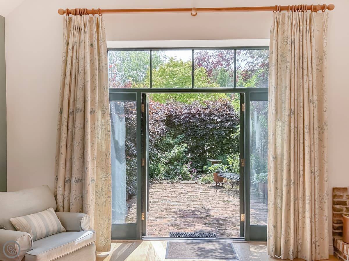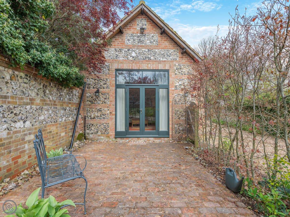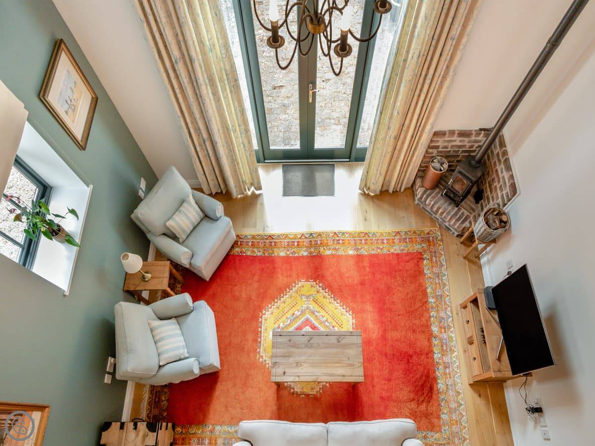 The place used to be a dairy, which means the ceilings are high and the room feels big. It's open plan, with a wood burner. There's a patio area outside with a table and chairs.