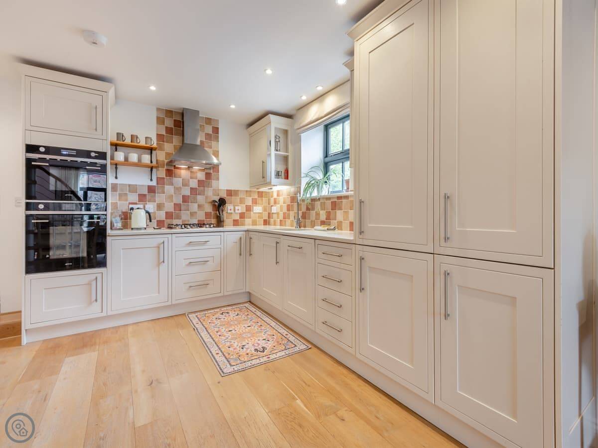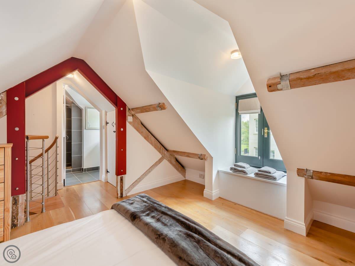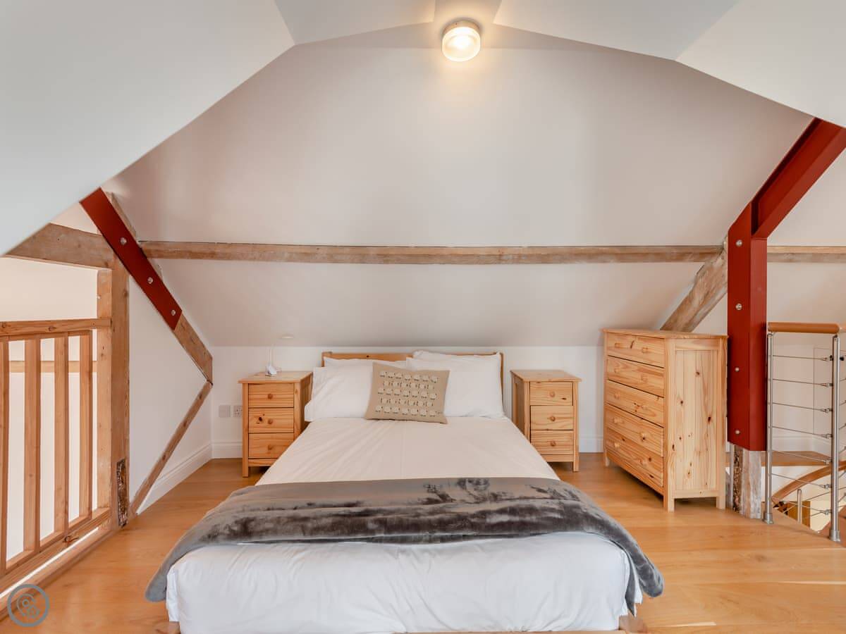 The place used to be a dairy, which means the ceilings are high and the room feels big. It's open plan, with a wood burner. There's a patio area outside with a table and chairs.