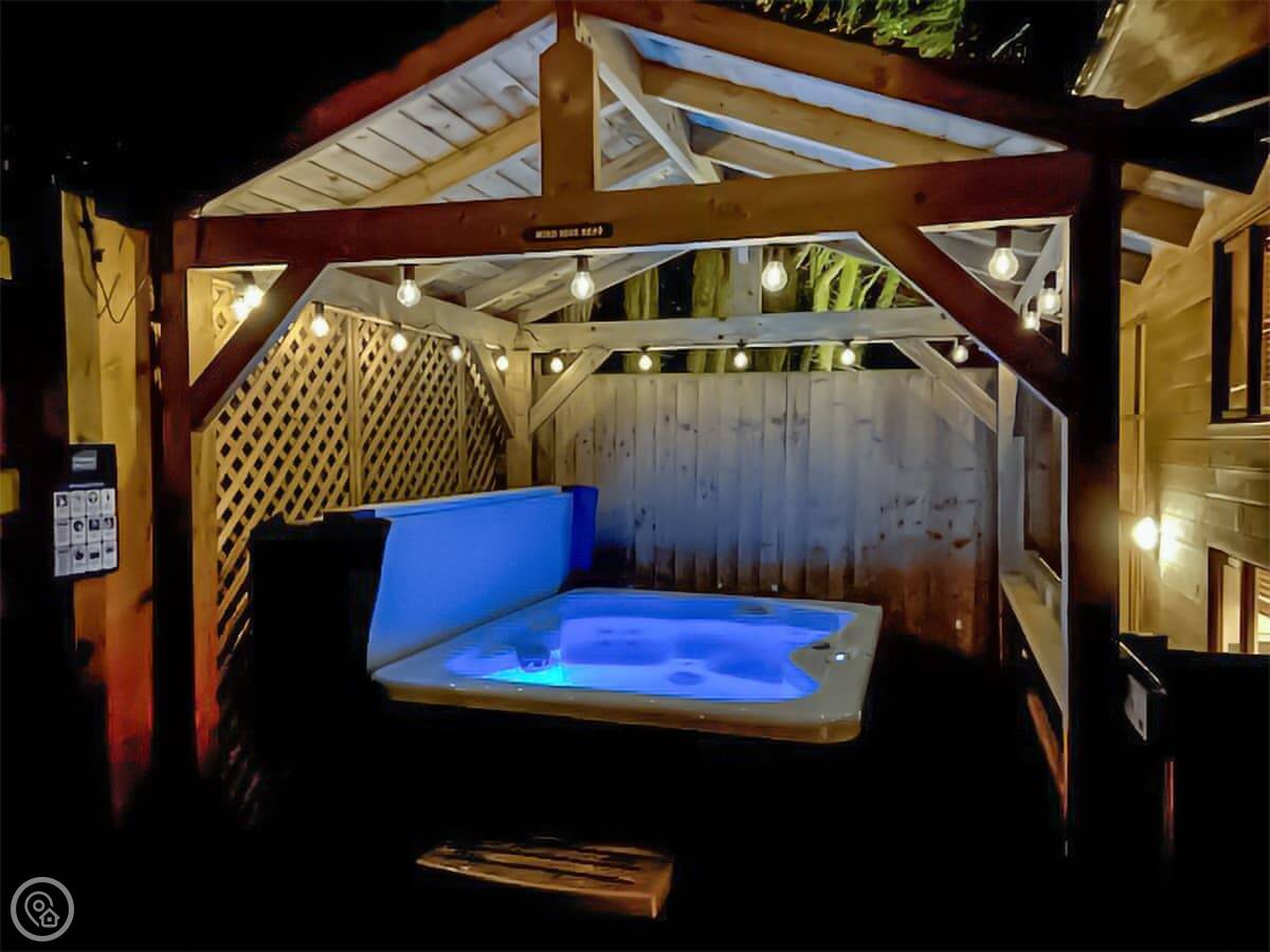It's an eco-friendly build. Feels modern and clean inside. There's a private garden with a hot tub under a pergola. That's a nice spot in the evening.