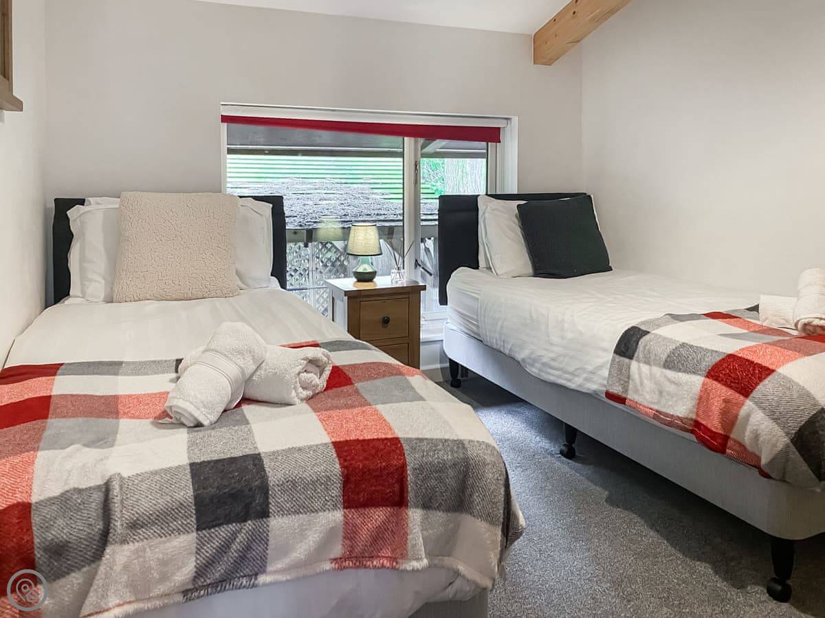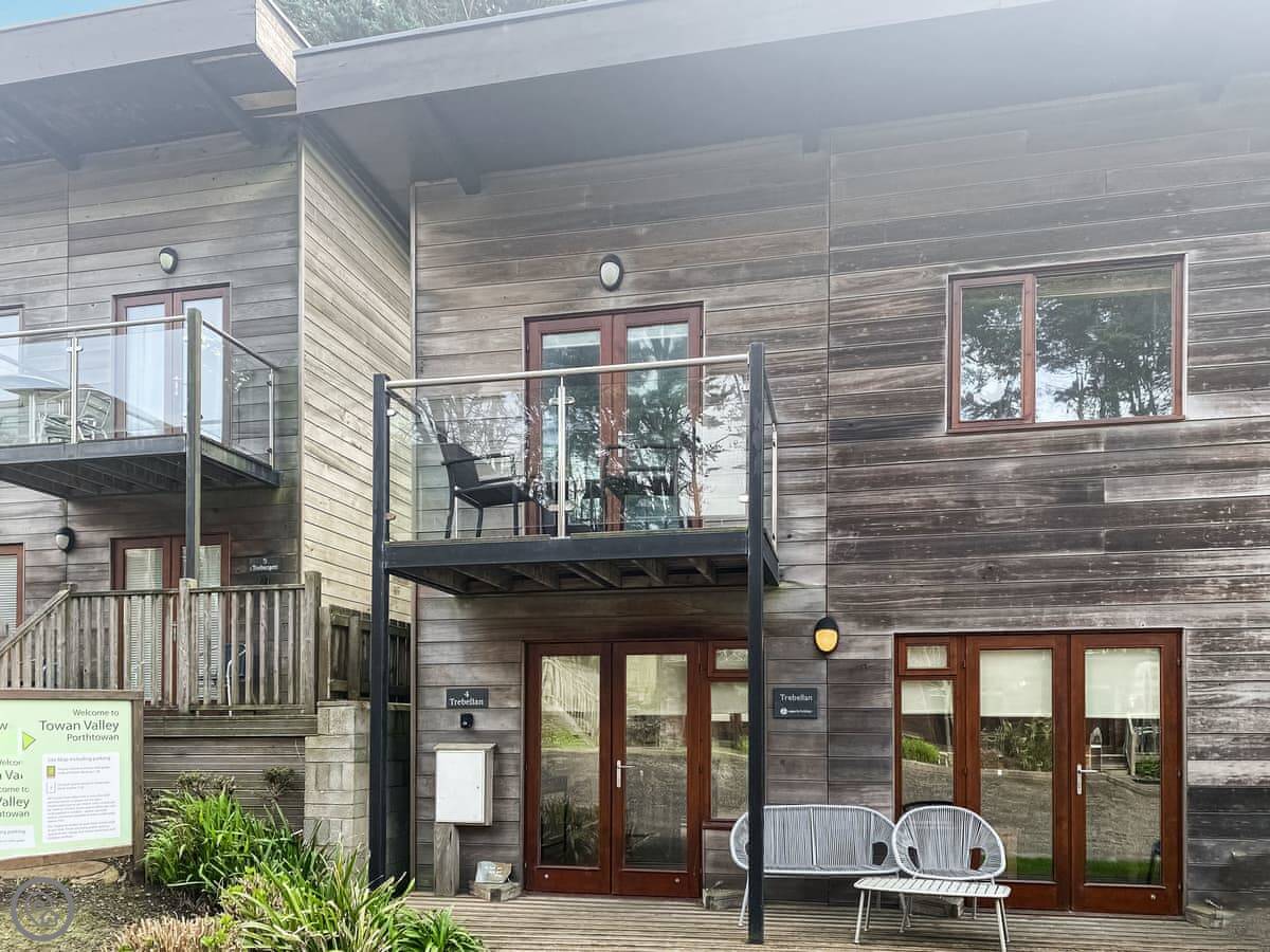 Trebellan is a lodge at the Towan Valley Resort in Porthtowan. It sleeps six. Three bedrooms, two bathrooms. It's a 4 Star place, which means it's comfortable and well looked after. Everything's included, bedding, towels, that sort of thing.