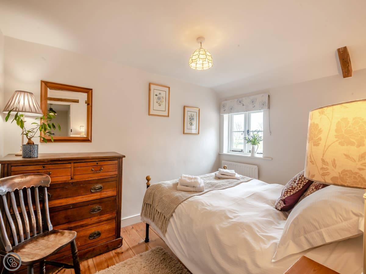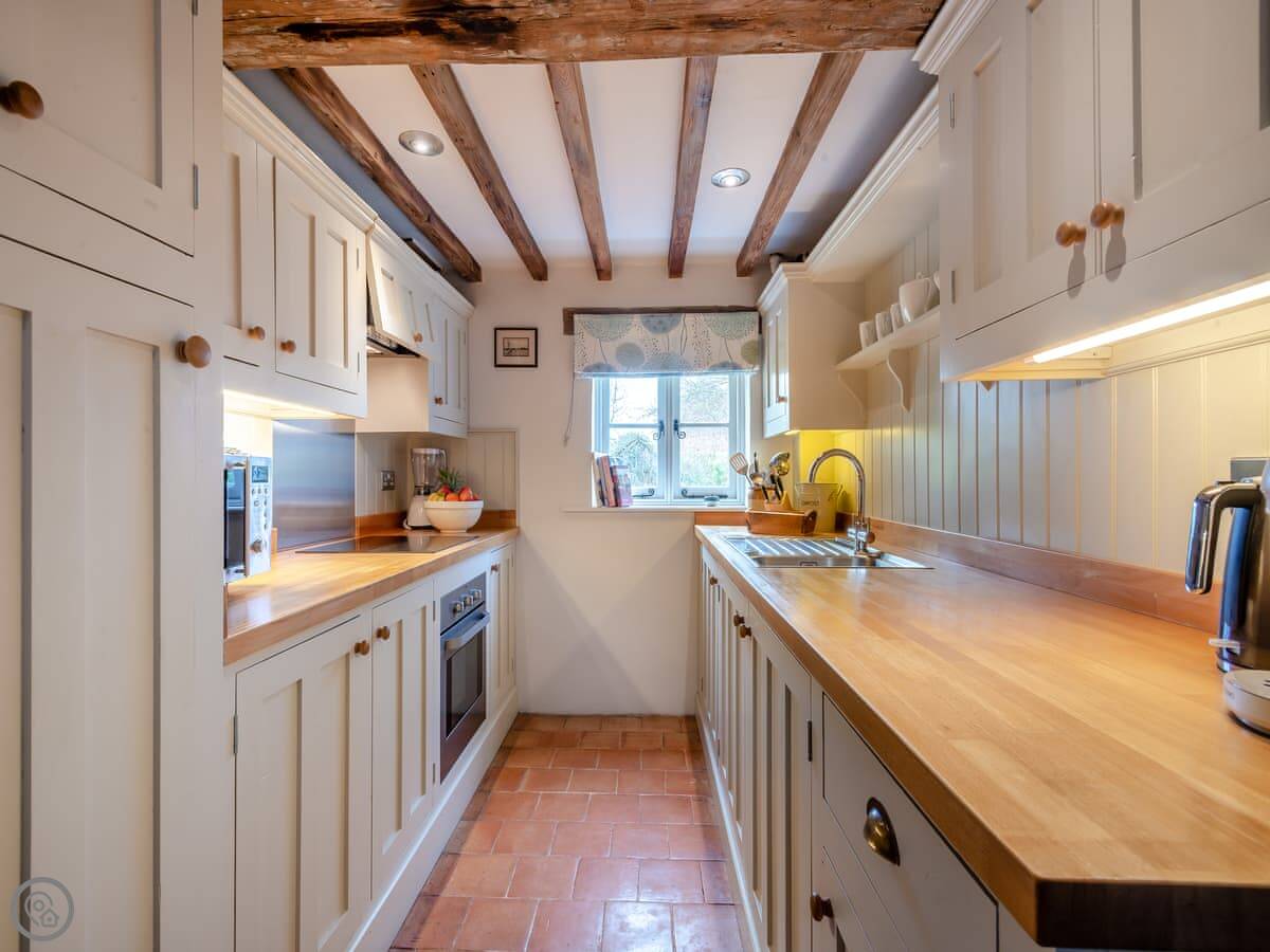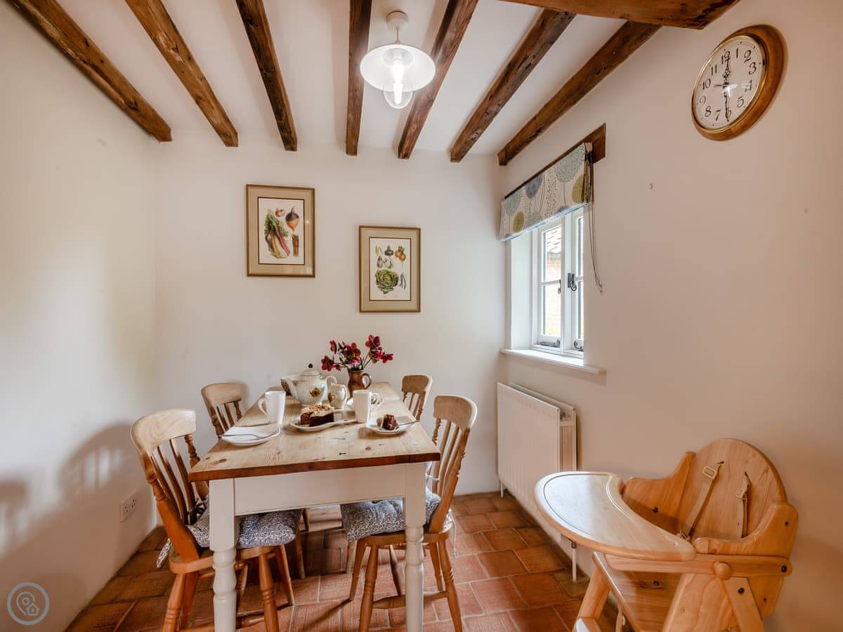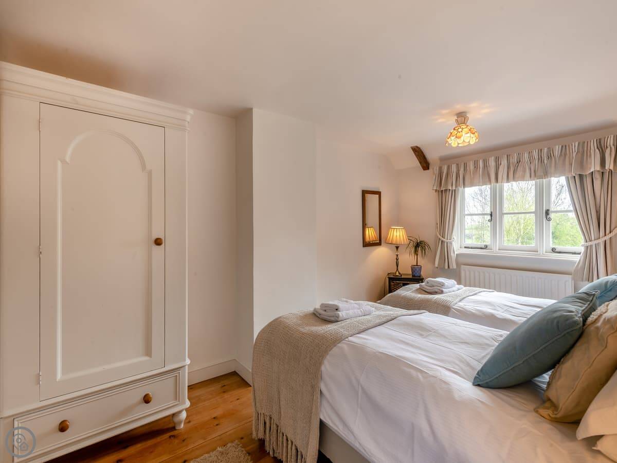 Two bedrooms, one bathroom. It's got a 4 Star rating. It's well looked after. The kitchen has a table you can all sit around, and there's a wood burner in the living room. The garden isn't huge but it's yours to use, and it looks out over the fields.