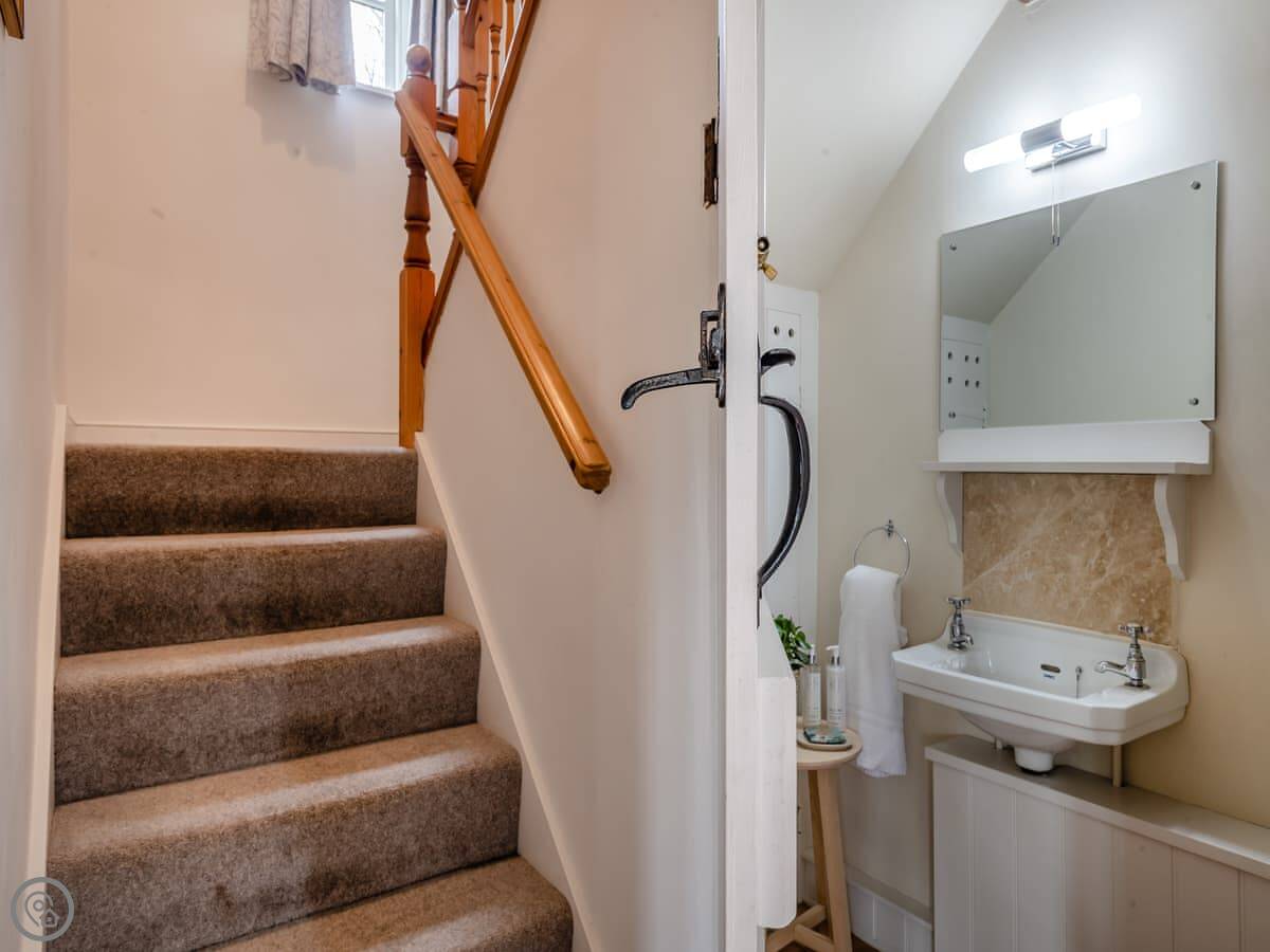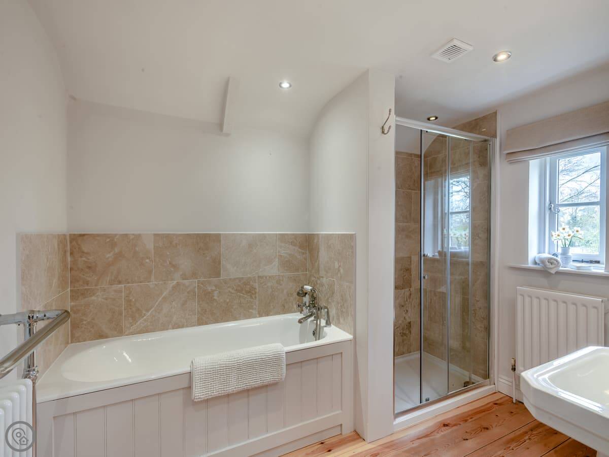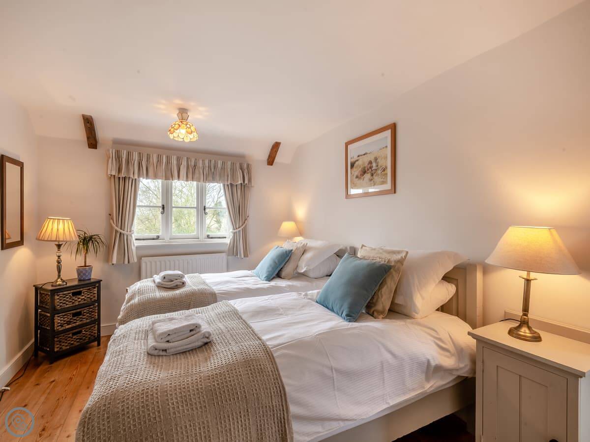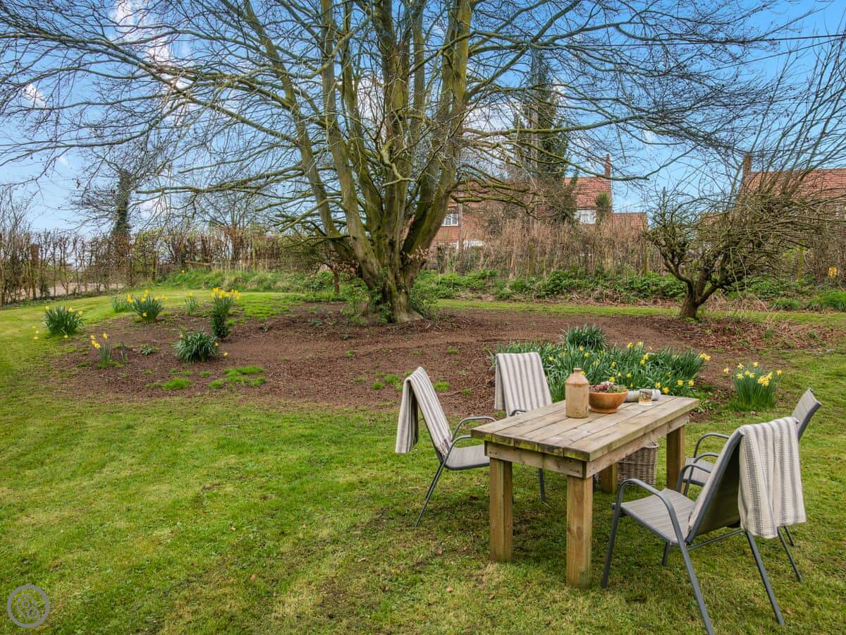 Two bedrooms, one bathroom. It's got a 4 Star rating. It's well looked after. The kitchen has a table you can all sit around, and there's a wood burner in the living room. The garden isn't huge but it's yours to use, and it looks out over the fields.