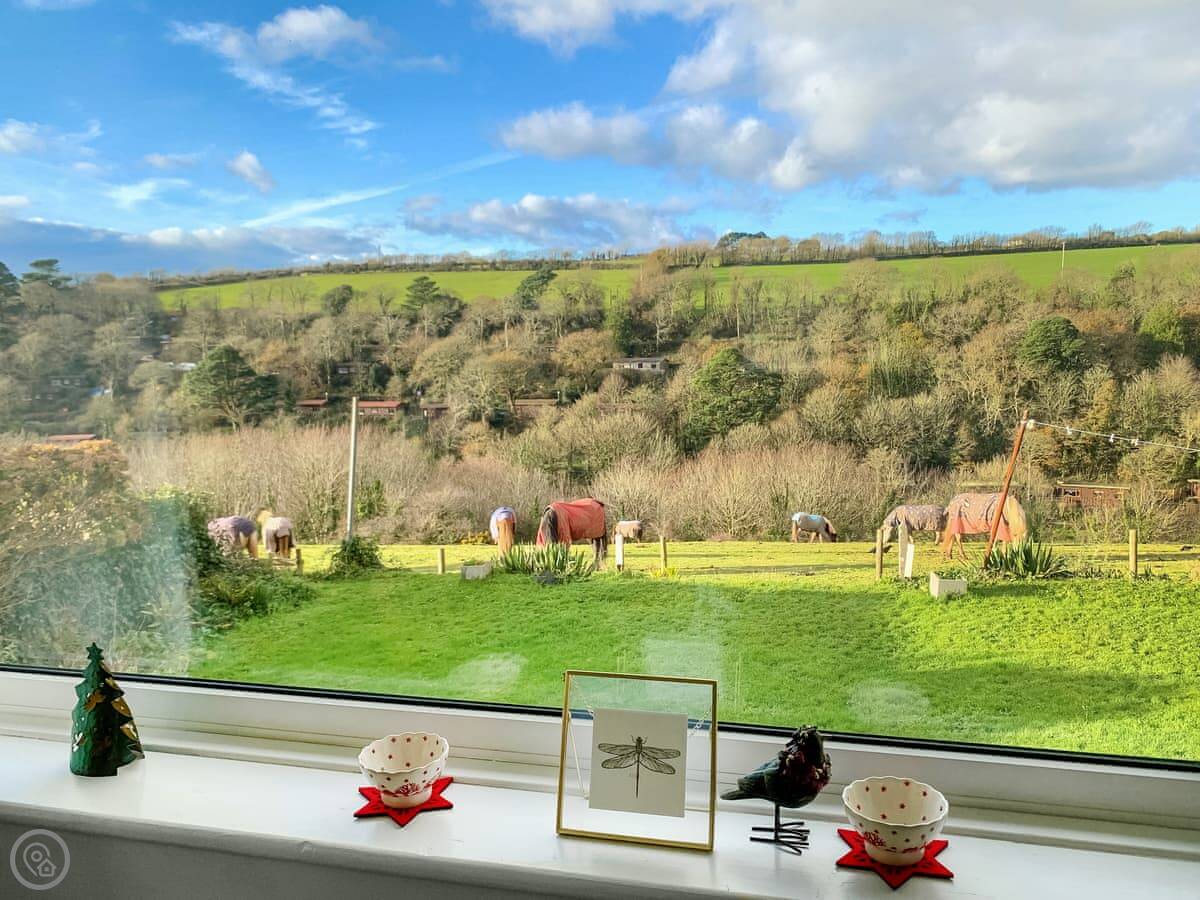 The garden goes around the house. It's fully enclosed. The fence at the back looks onto a field where horses from the local stables sometimes come and graze.