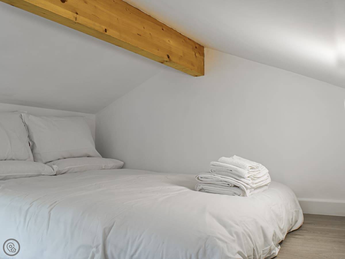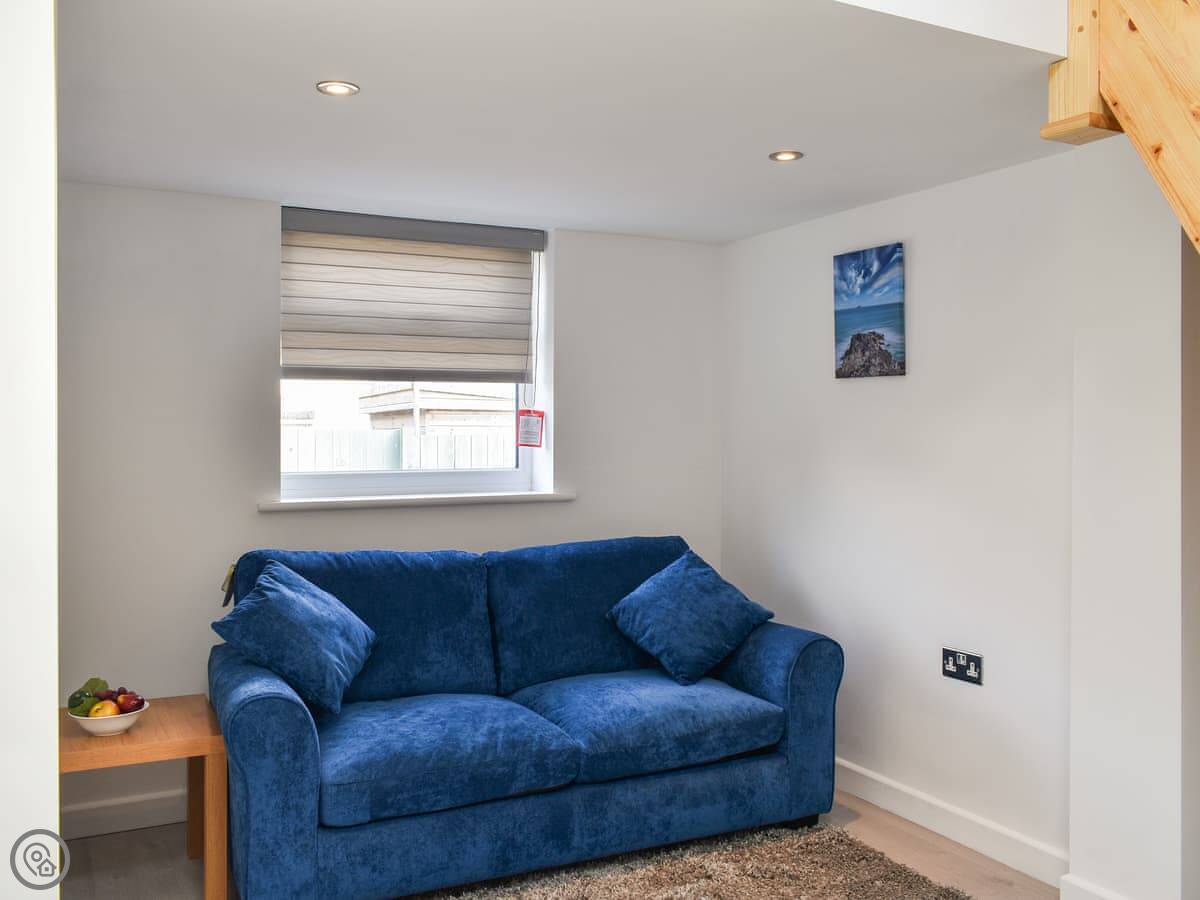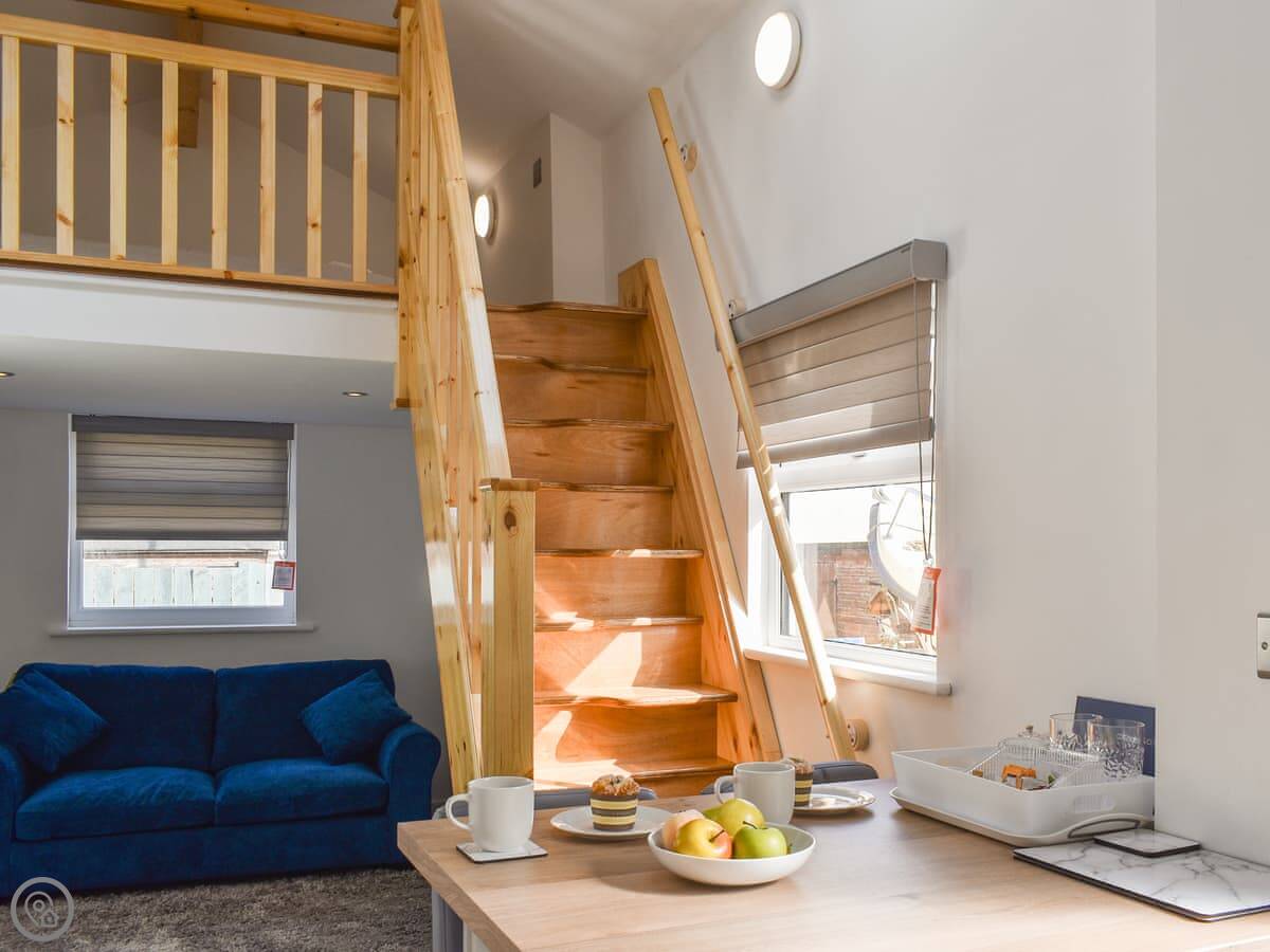 It's small and open plan. The kitchen is basic but modern. The sofa is a double sofa bed. The main bed is a double mattress on a mezzanine floor up a ladder. The ladder and the space up there mean it's not suitable for very young children or anyone who struggles with steep steps.