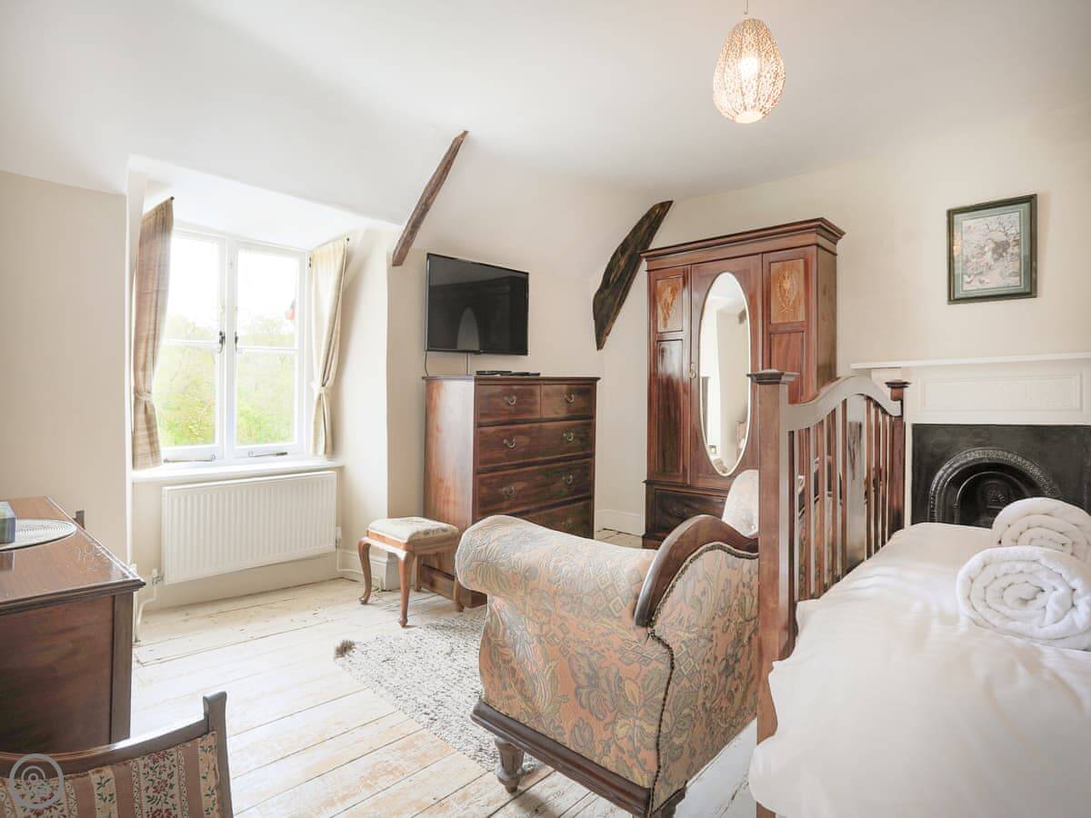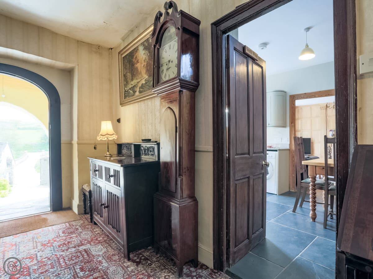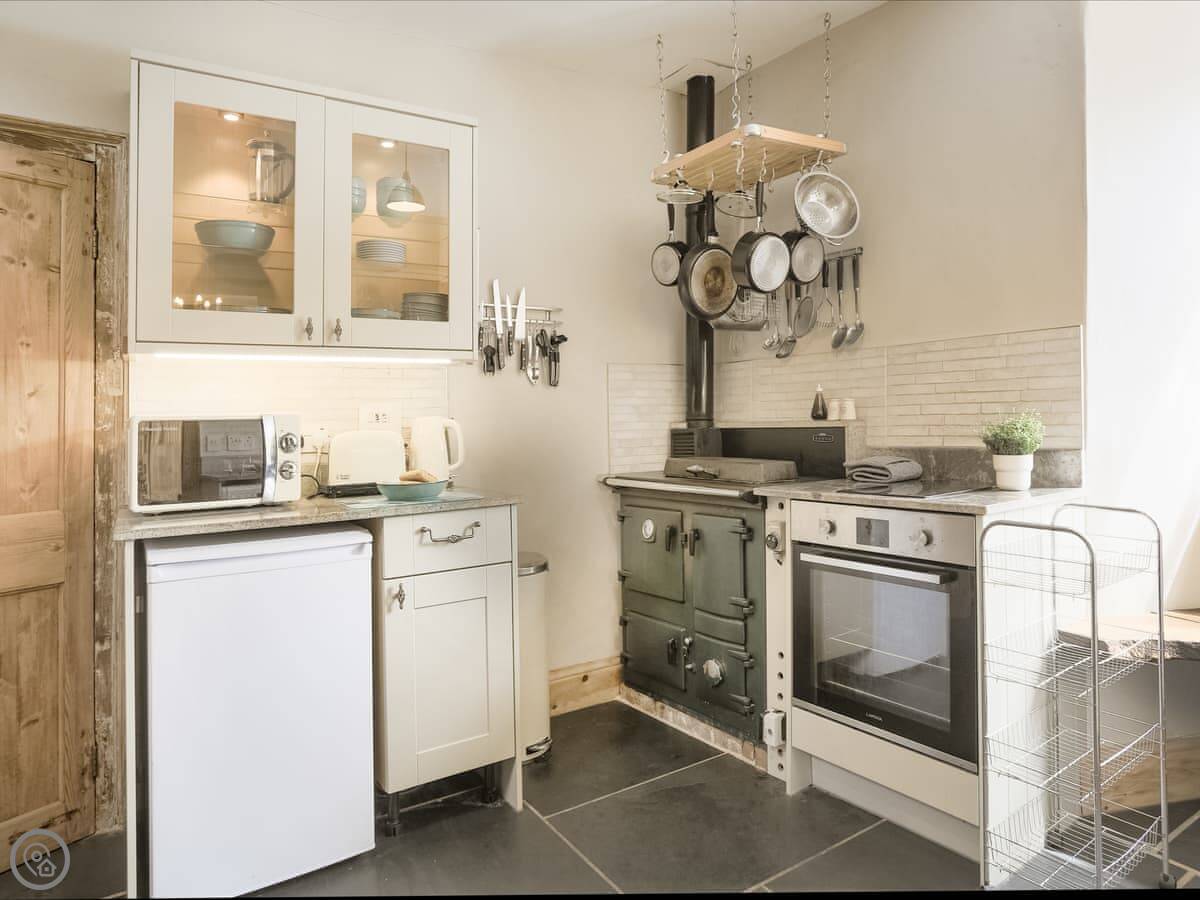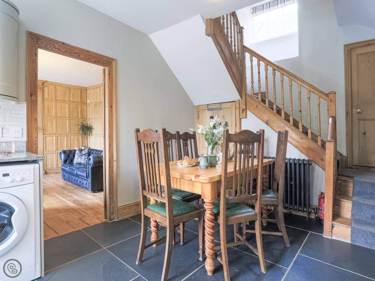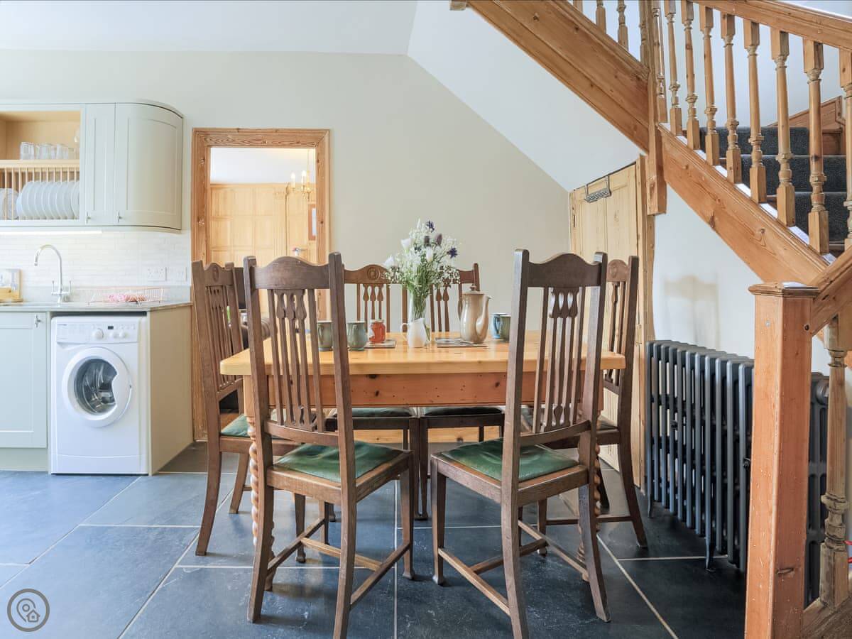 It sleeps six people in three bedrooms. There are two bathrooms, one is an en-suite. The stairs are the original ones, so they're a bit steep and uneven. The sitting room has a wood-burning stove and two large sofas. The kitchen has a Rayburn range cooker and a proper electric oven, plus a washer/dryer. The floor is slate, which is cold underfoot, so you might want slippers.