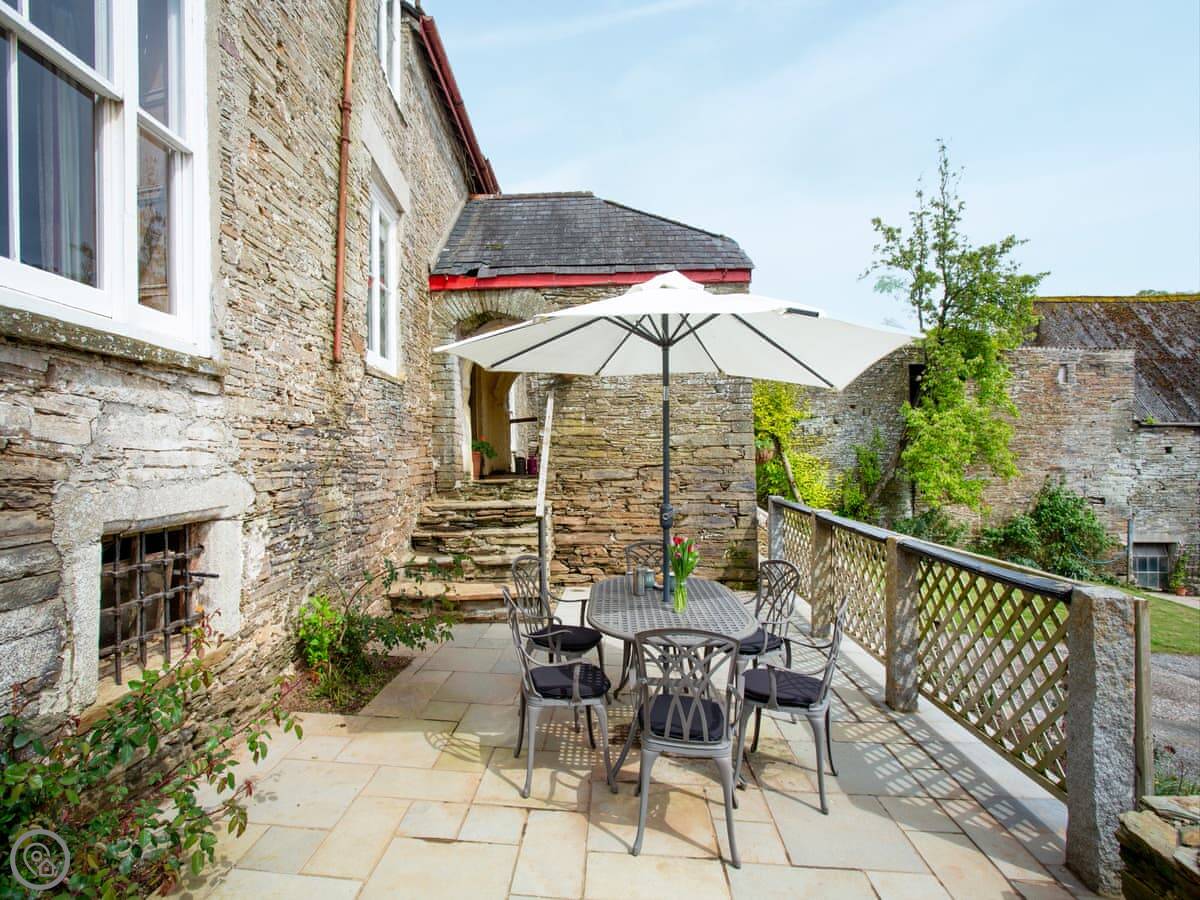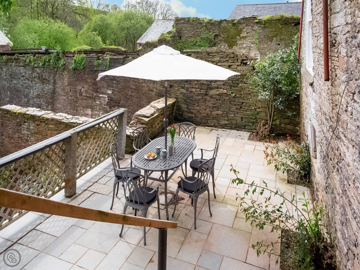 Outside, there's a small patio area with a table and chairs. You get your own parking space on the drive.