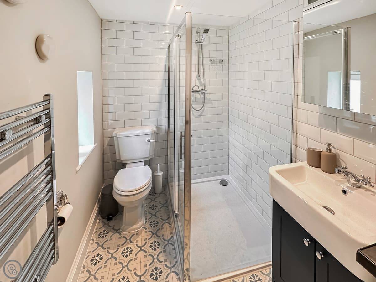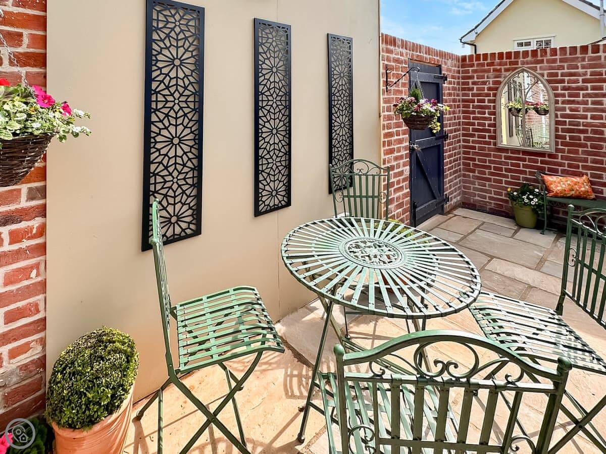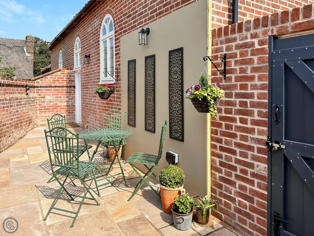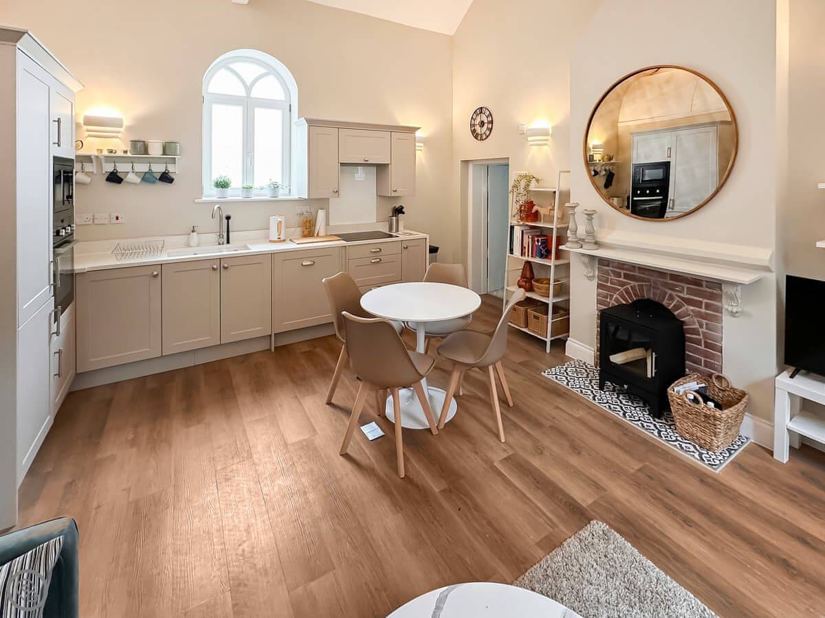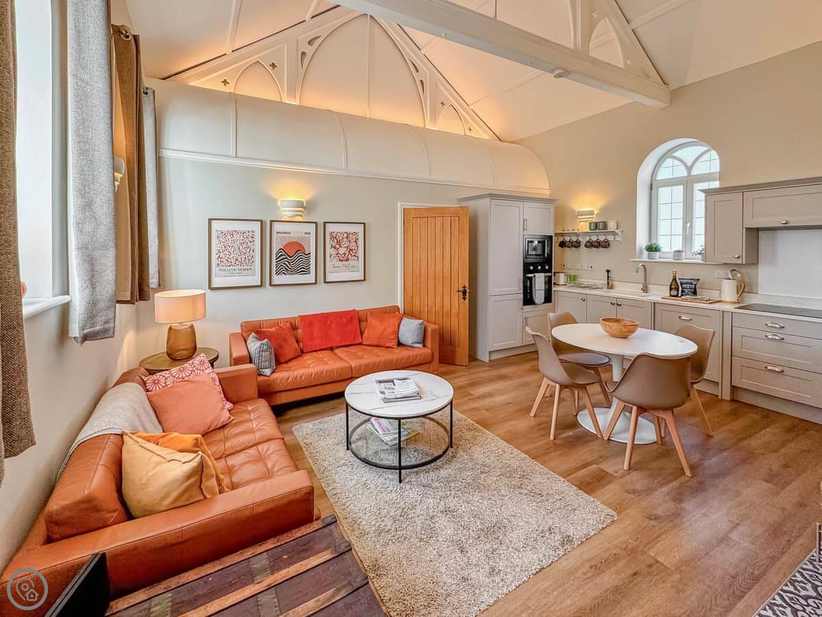 The living area is open plan with a wood burning stove. The original chapel features are still there, like the big windows, but it's been done up to a high standard. There's a small, enclosed courtyard garden at the back with a table and chairs. It gets the sun in the afternoon.