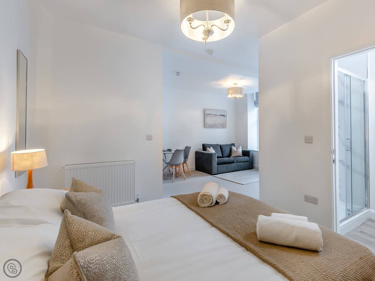 The place is open-plan. Kitchen, living area, and a dining bit all in one room. There's a separate bedroom with a decent bed, and a bathroom with a shower. The windows are big so it's quite light. It's been done up modern inside.